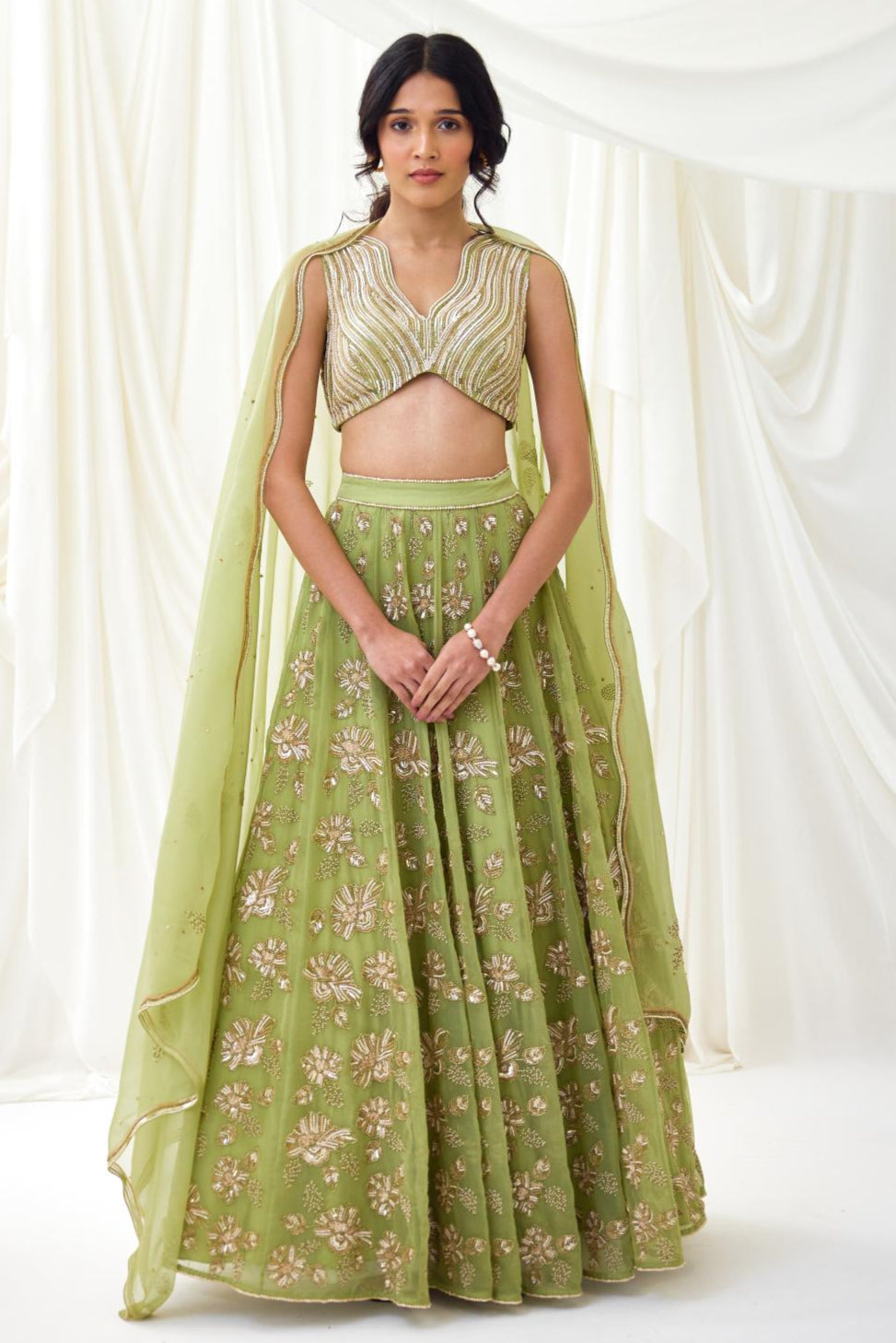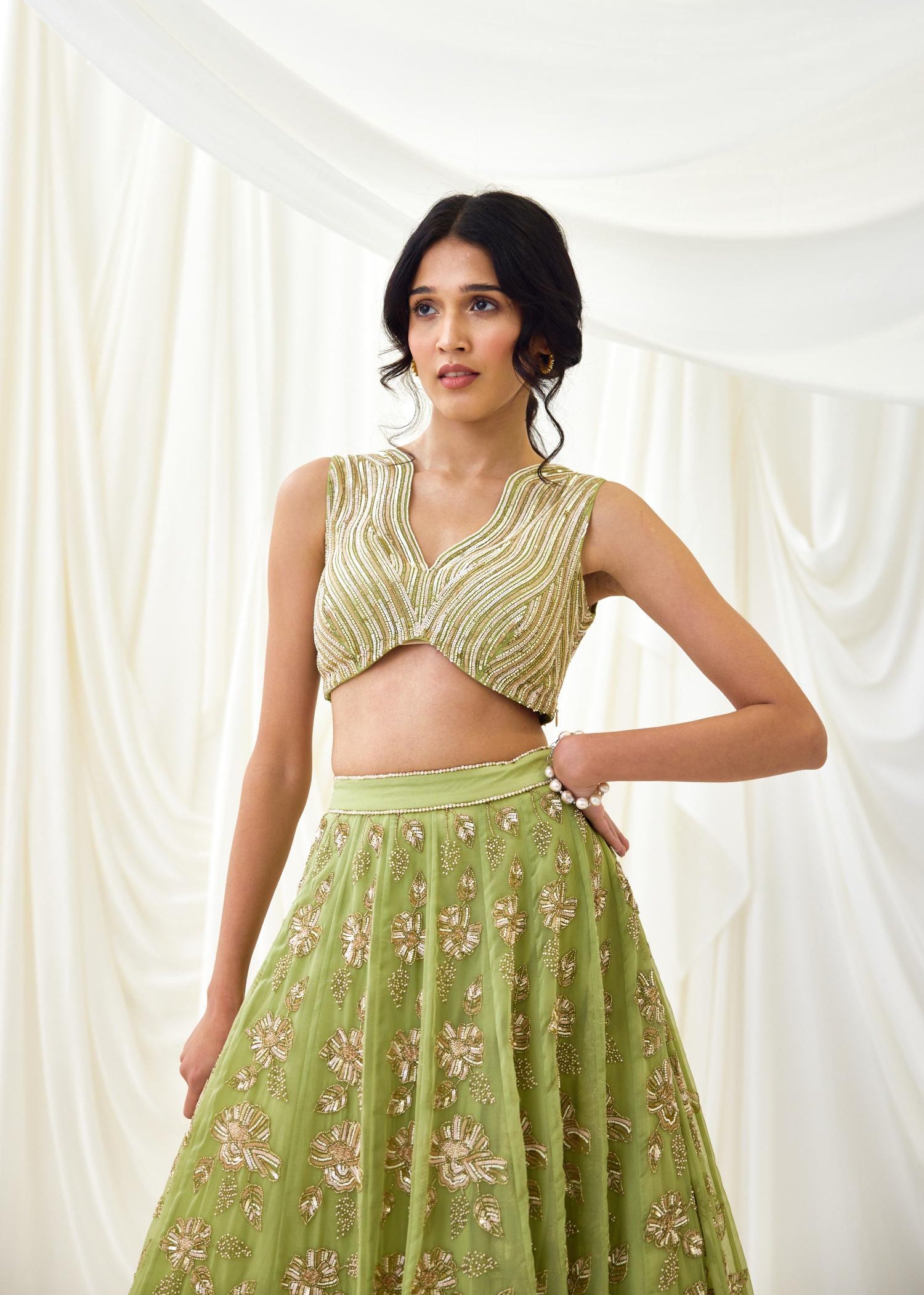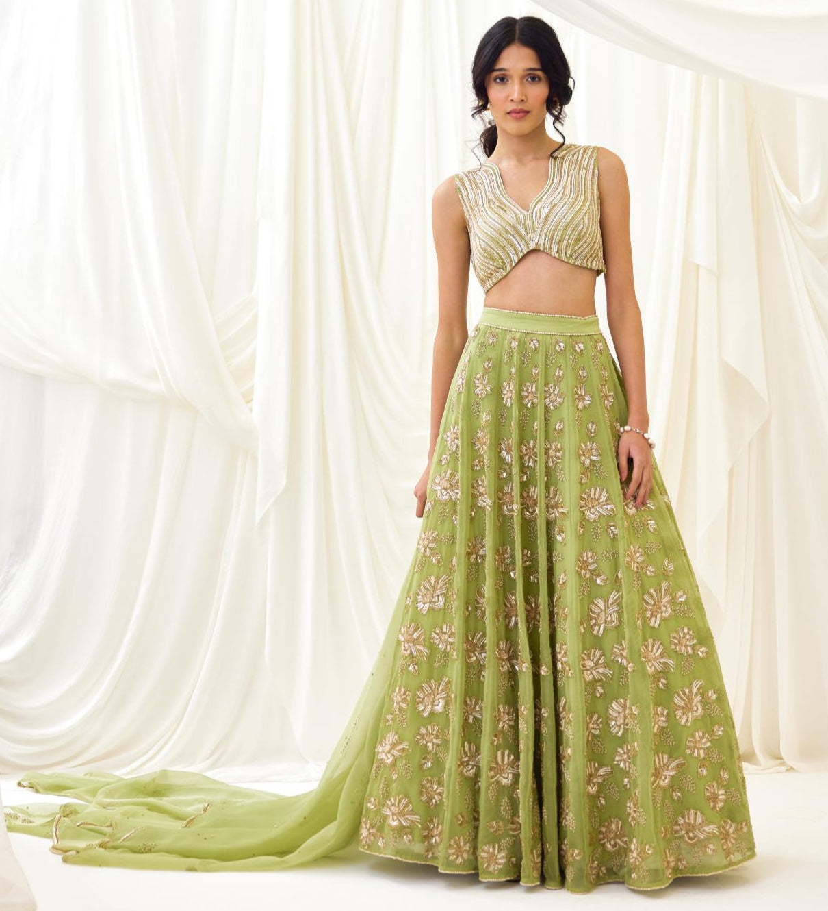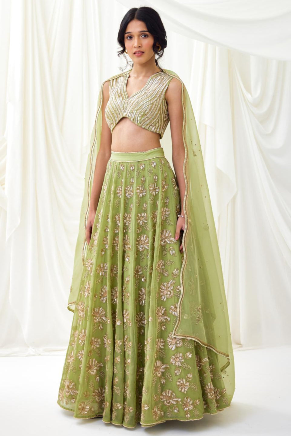 Step into a moonlit dream with our Nocturnes Lehenga Set in Green. Featuring a panelled organza skirt embroidered with sequins and beads in blush, peach, and gold, this ethereal set is paired with our signature beaded wave blouse. A delicately embellished organza dupatta with wavy edges completes the look, perfect for enchanted evenings.