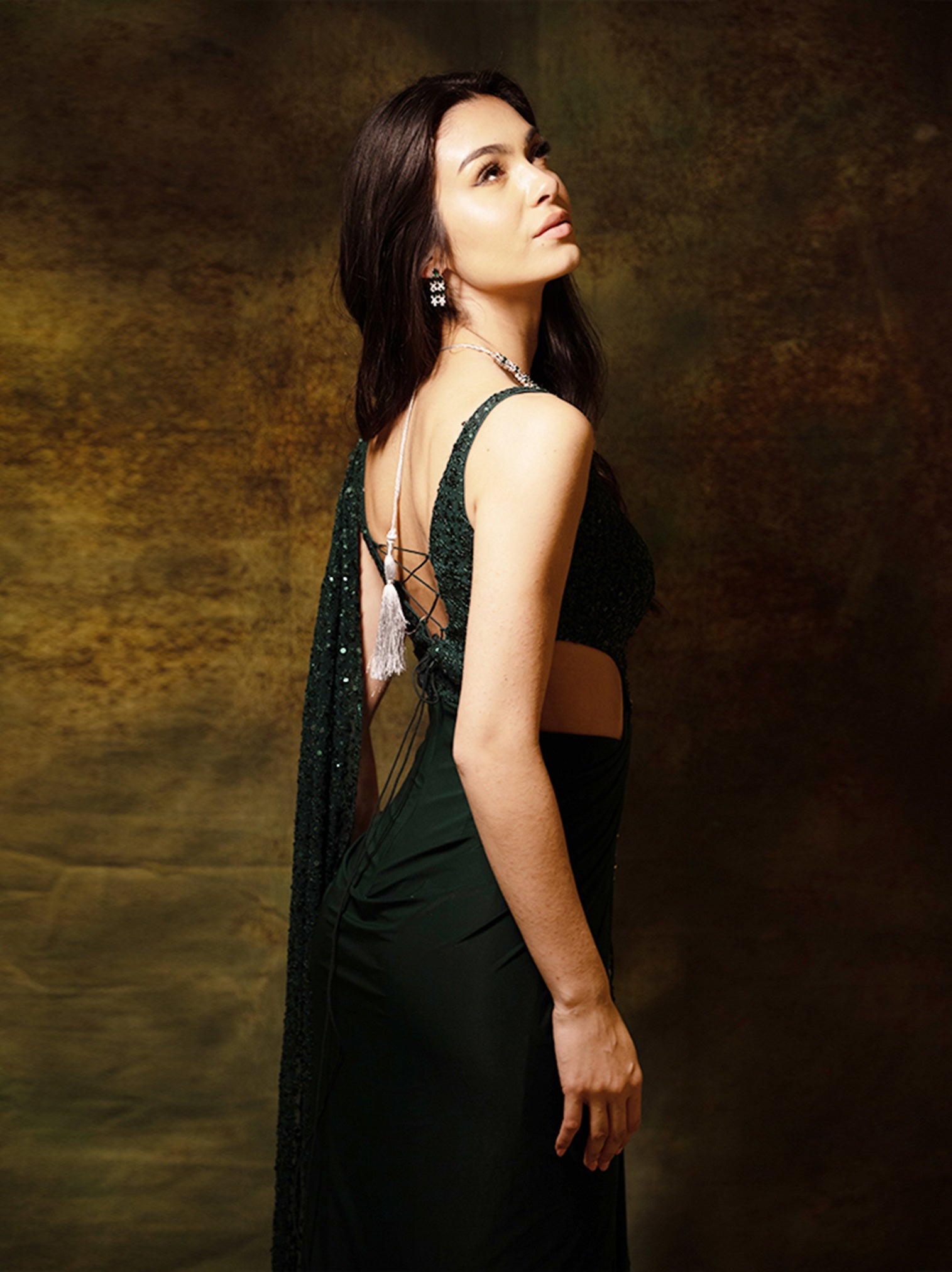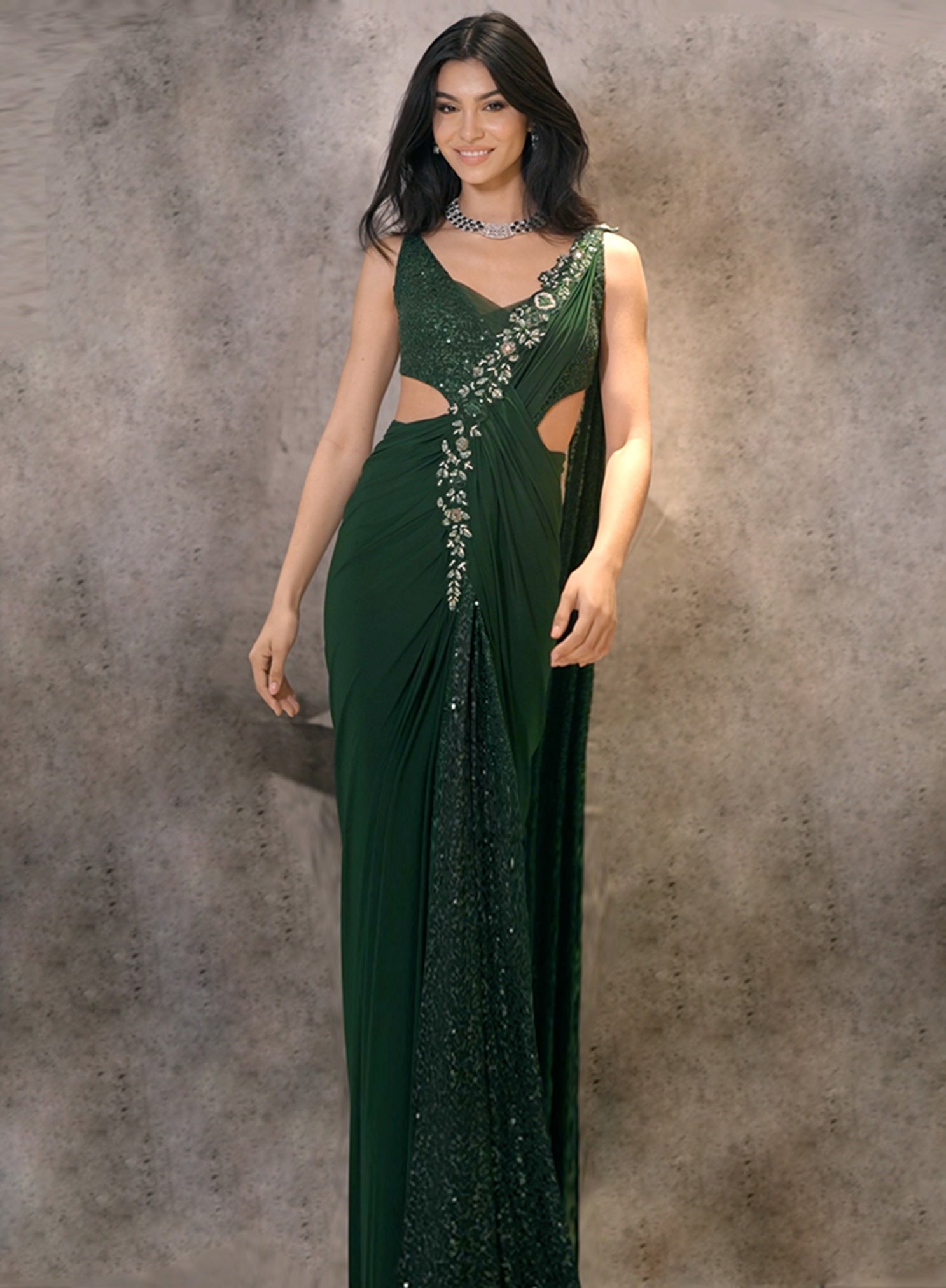 Immerse yourself in the elegance of this stunning gown, where bold hues of green are beautifully accentuated by glittering embroidery. The gown is adorned with intricate floral embroidery, enhanced with sparkling stones, shimmering sequins, and delicate kardana beads, creating a captivating and luxurious effect. Perfect for making a statement, this outfit blends vibrant color with exquisite craftsmanship for a truly unforgettable look.
