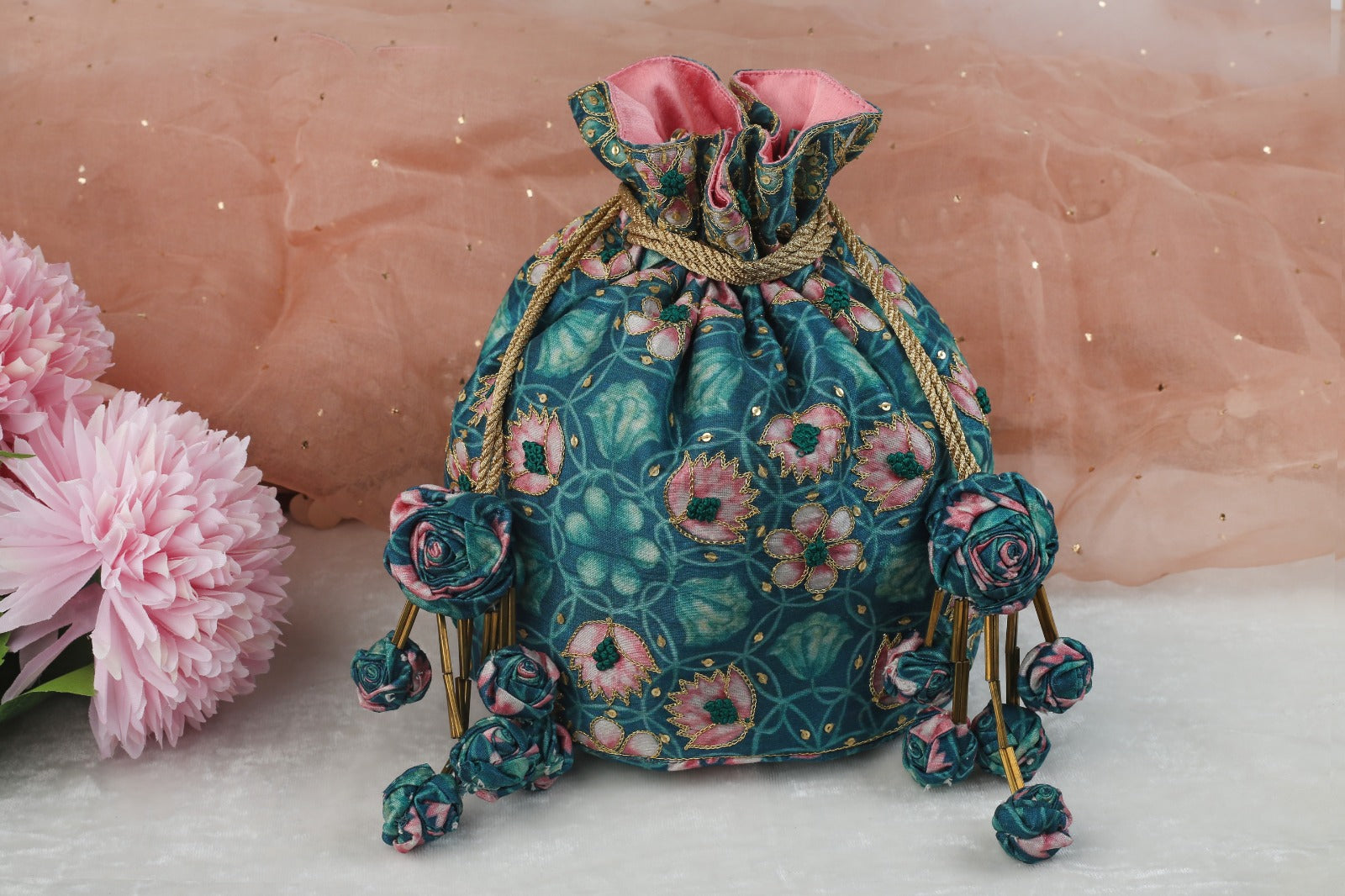 Inspired by ancient hand-painted fort murals, this exquisite potli clutch features a beautifully transformed Kamal (lotus) print. Embellished with intricate zari embroidery, delicate anchor thread French knots, and shimmering light gold sequins, it exudes timeless elegance. The signature handcrafted flower tassels, a unique USP of the brand, add a regal charmã perfect for weddings, festive occasions, and cultural celebrations.
