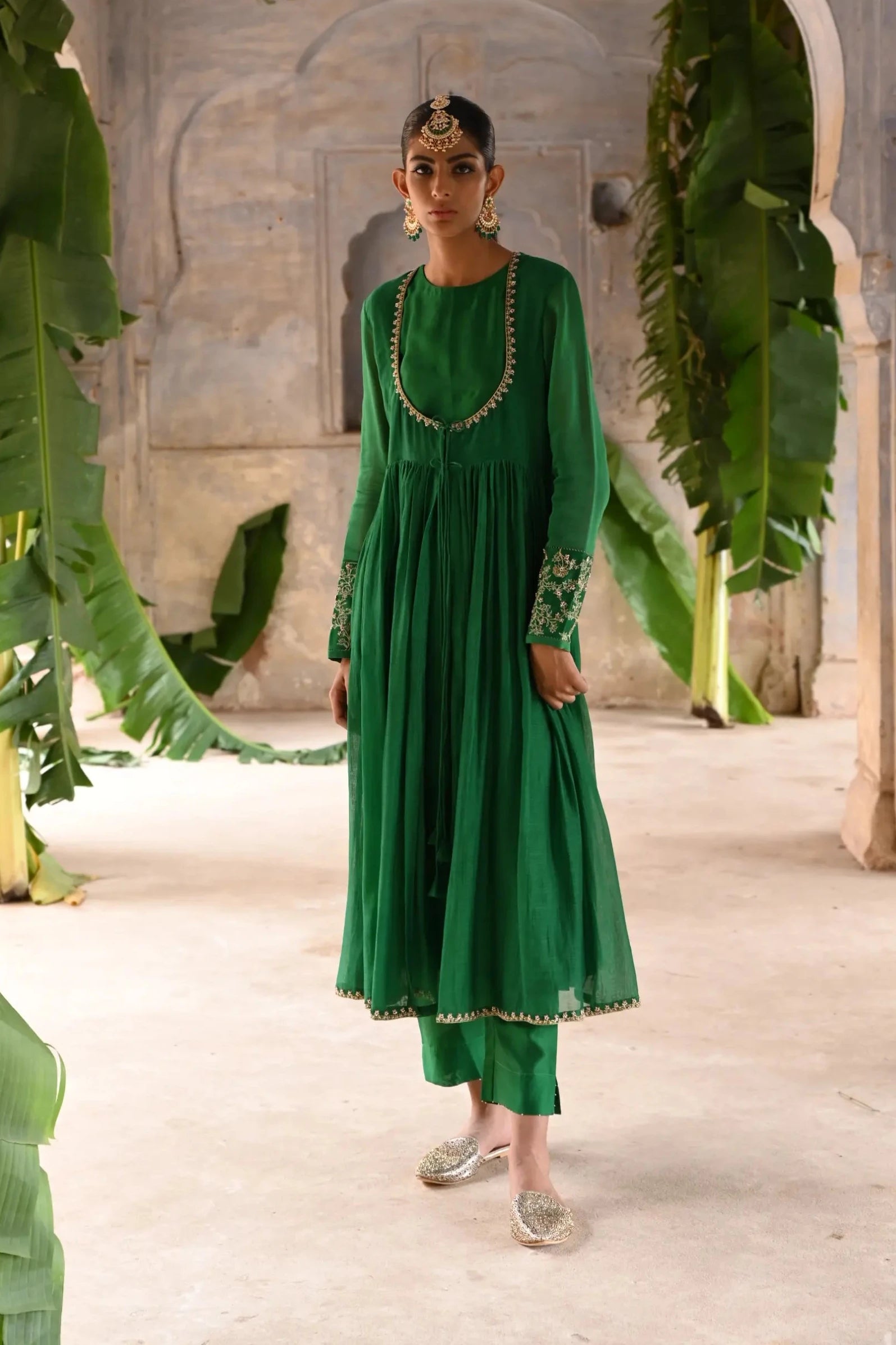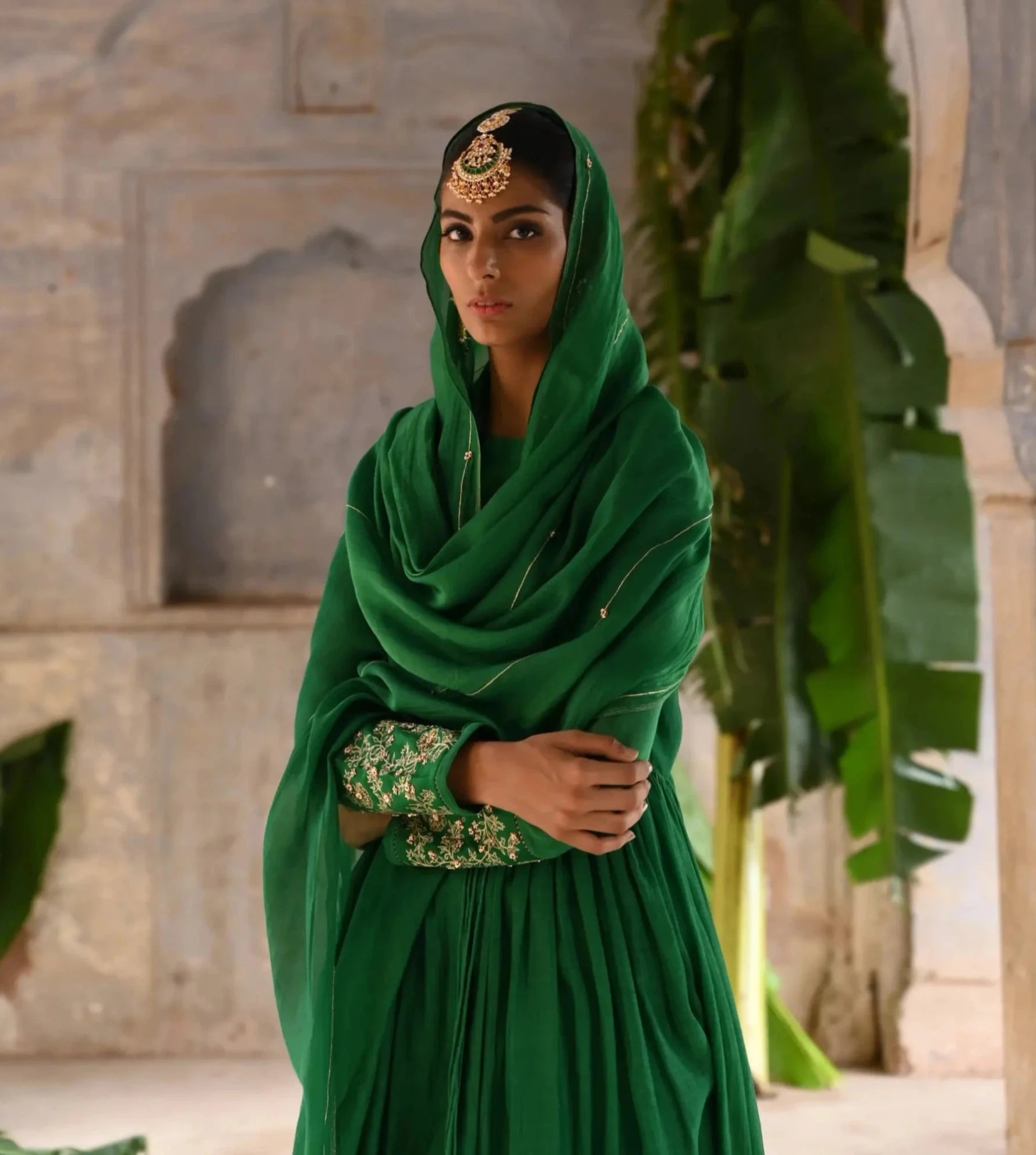 Embrace elegance with our Green Gather Angrakha Set. This beautifully designed ensemble features a flattering gather detail that adds a unique touch to the traditional angrakha silhouette. The rich green hue brings vibrancy and sophistication, making it perfect for festive occasions and special celebrations.