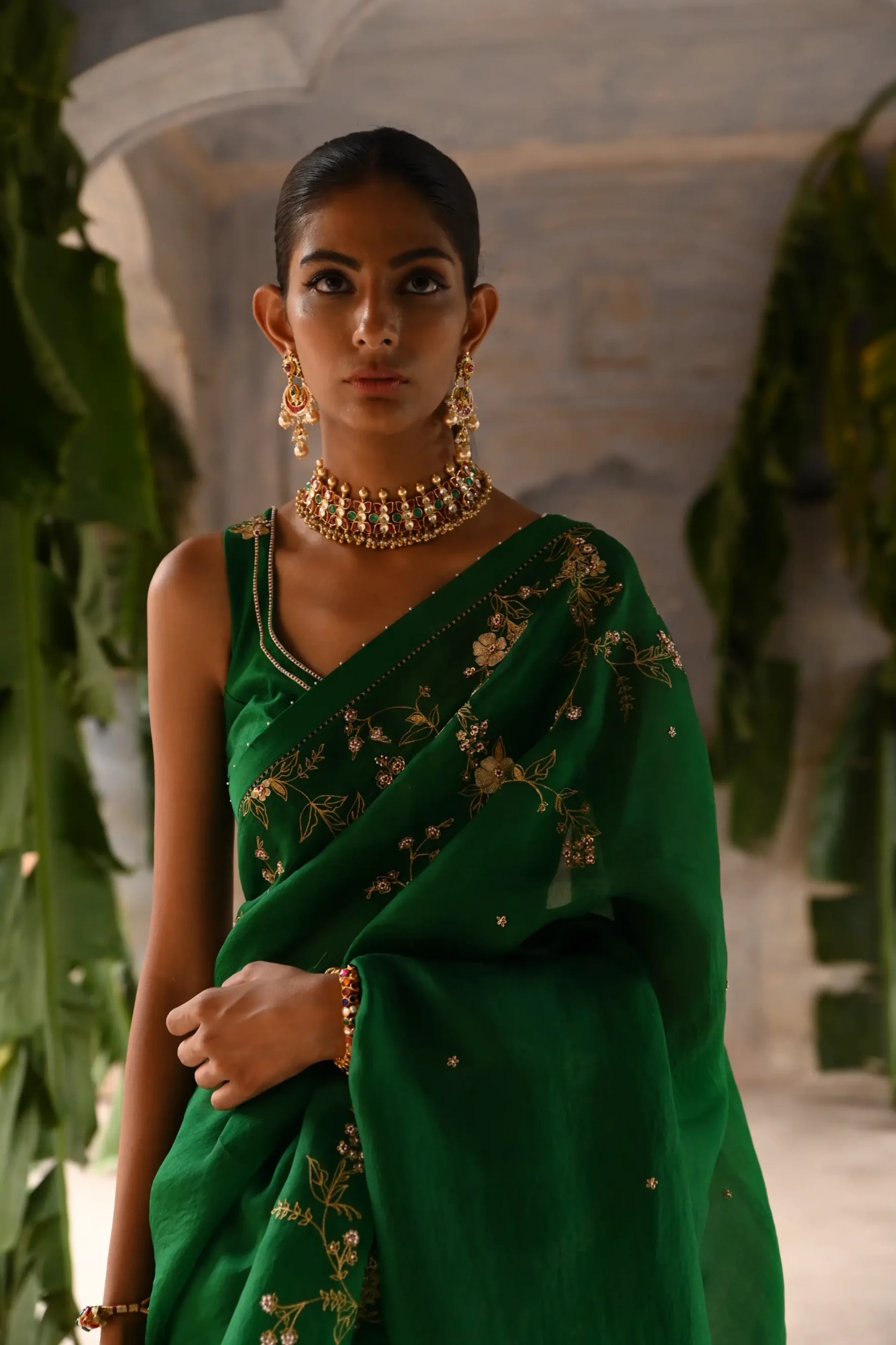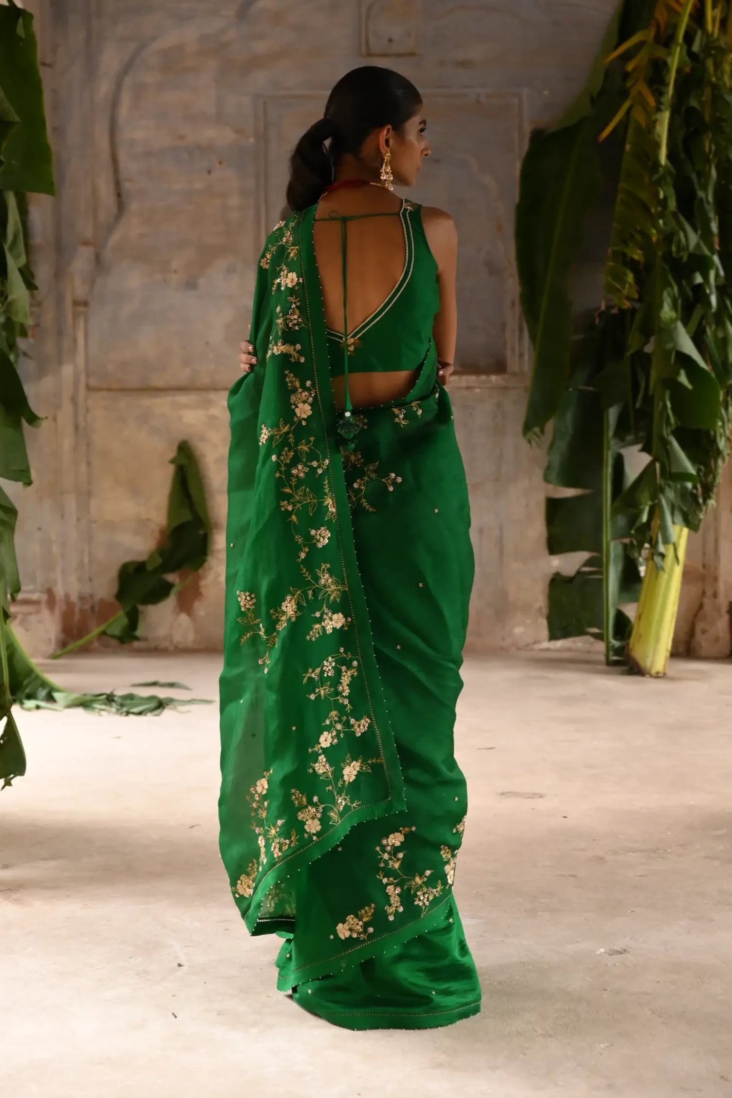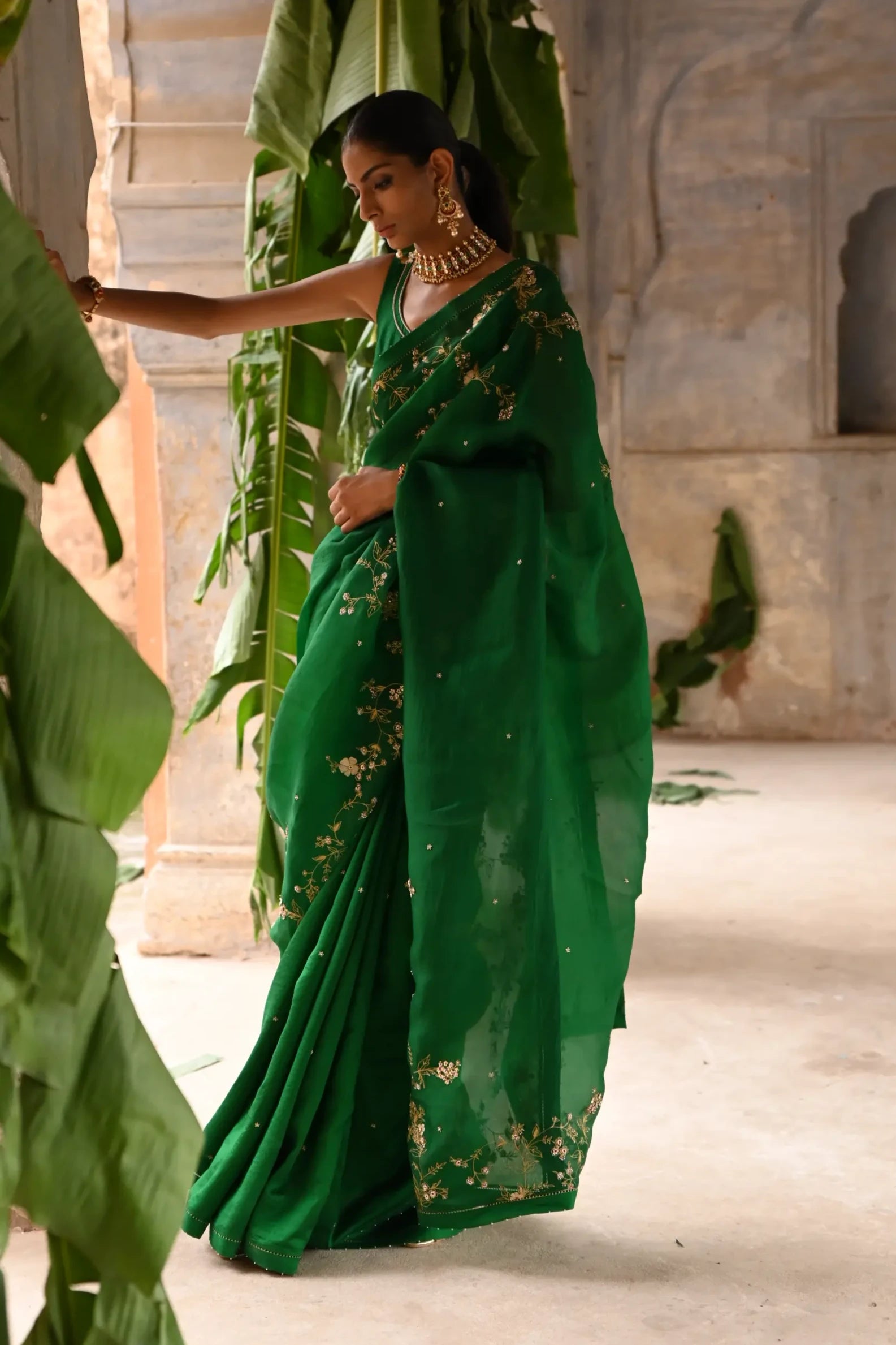 Elevate your ethnic collection with our Green Half Organza and Half Silk Saree. This stunning saree beautifully combines the light, airy texture of organza with the luxurious sheen of silk, creating a unique and elegant drape. The vibrant green hue adds a fresh and lively touch, perfect for festive occasions and special gatherings.