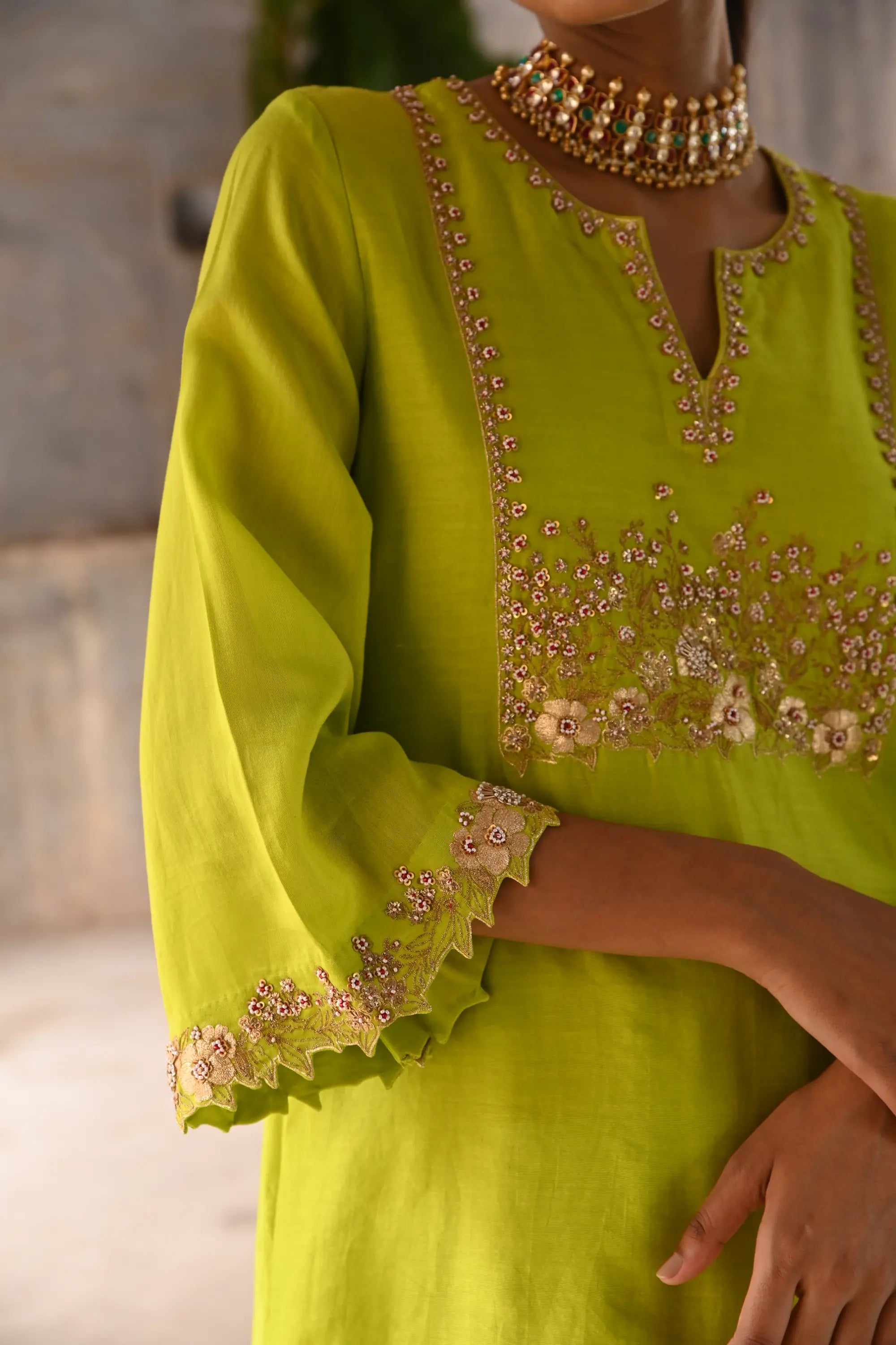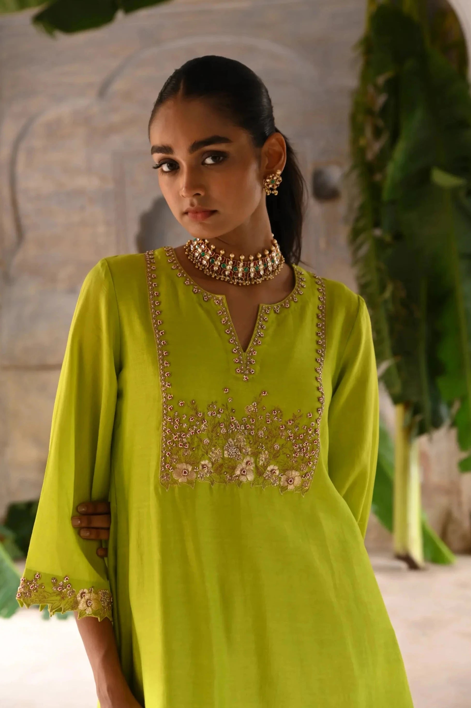 Elevate your ethnic wardrobe with our Green Hand Embroidered Short Kurta Set. This stylish ensemble features intricate hand embroidery that highlights the artistry of skilled artisans, adding a unique touch to the classic short kurta design. The vibrant green hue brings freshness and elegance, making it perfect for casual outings and festive occasions alike.