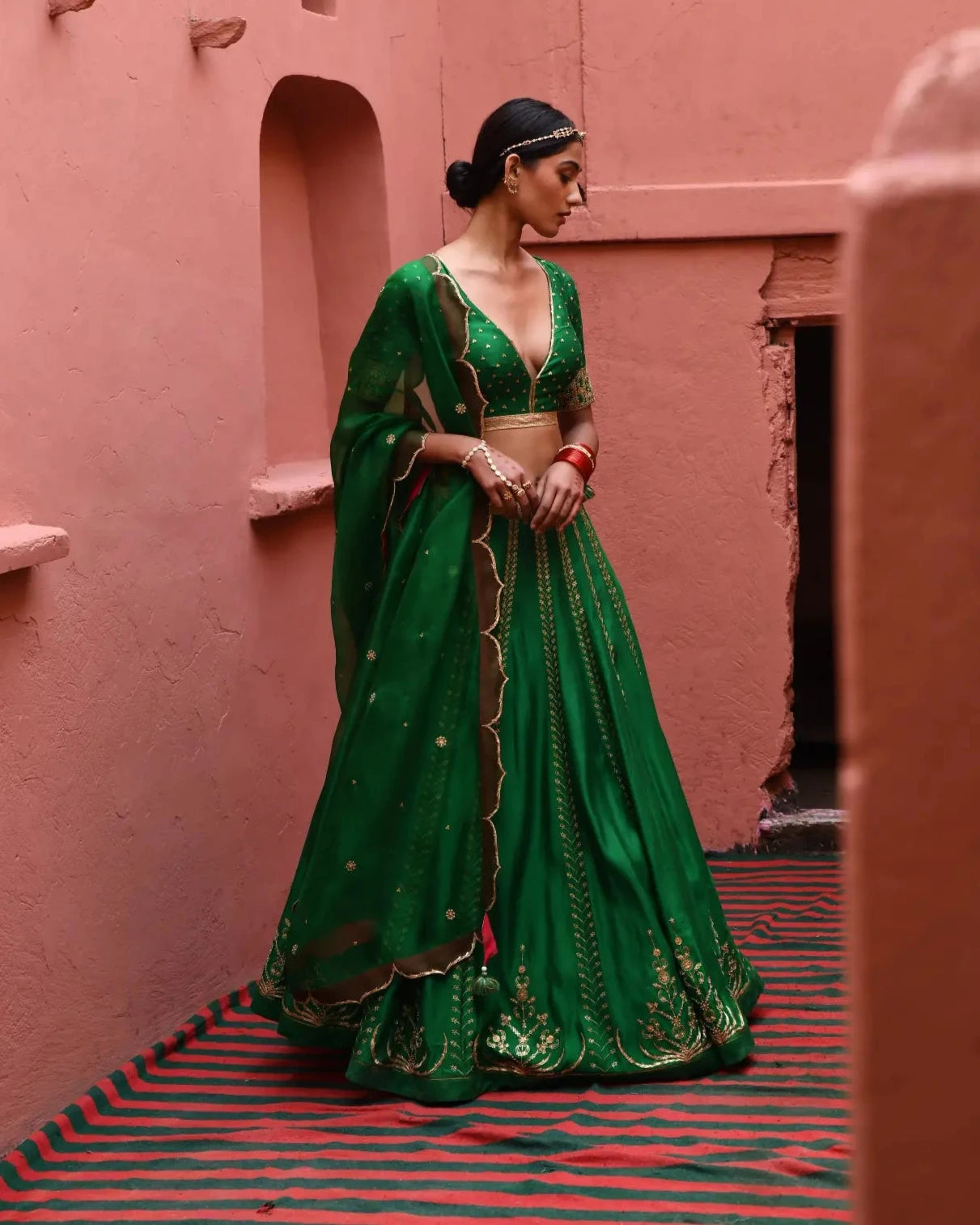 This exquisite green lehenga features large Kalyani booti embroidery adorning the bottom of each kalli, creating a striking visual impact that captures attention. The intricate detailing and vibrant color make it perfect for festive occasions and celebrations. Paired with a stunning dupatta embellished with all-over three-sequence booti and a graceful cut shape, this ensemble offers a perfect blend of elegance and modern design. The lightweight fabrics ensure comfort while exuding sophistication, making this lehenga a timeless addition to your wardrobe.