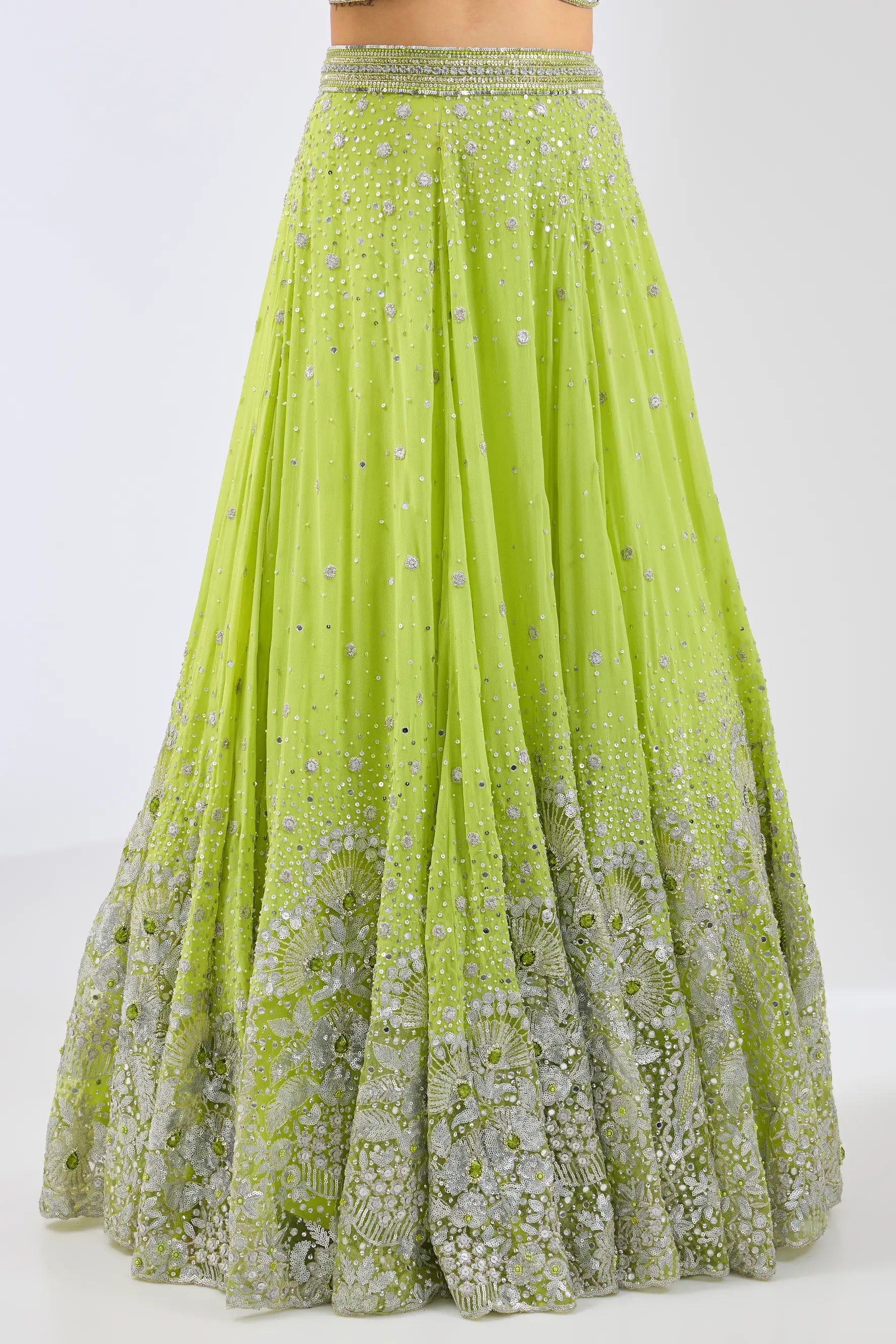 Embrace timeless elegance with our exquisite green hand embroidered lehenga set. This stunning ensemble features intricate hand embroidery that highlights the artistry and craftsmanship of traditional design. The flowing lehenga pairs beautifully with a matching top, creating a flattering silhouette perfect for weddings, festive occasions, and special celebrations. Elevate your ethnic wardrobe with this captivating lehenga set that celebrates beauty and sophistication.