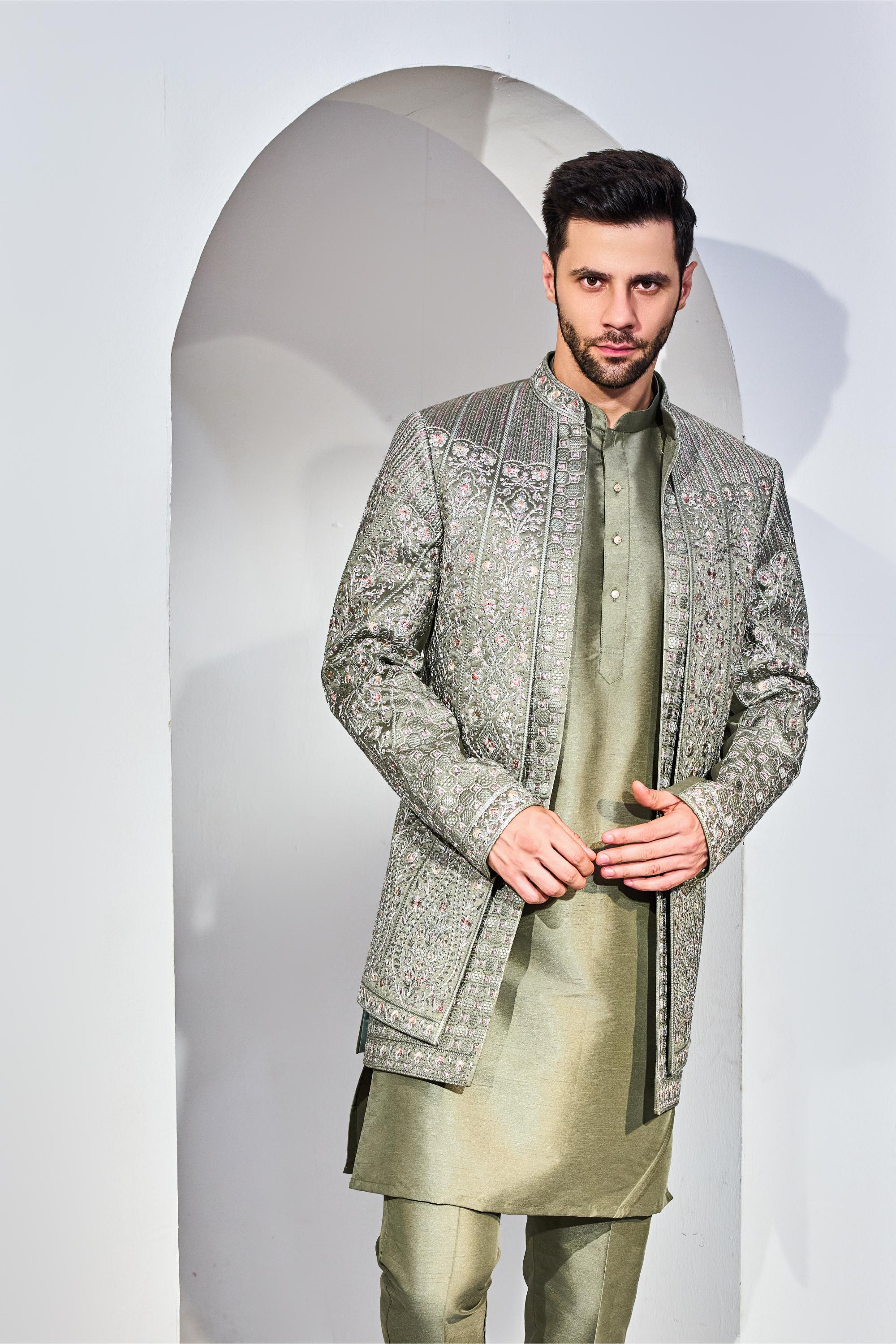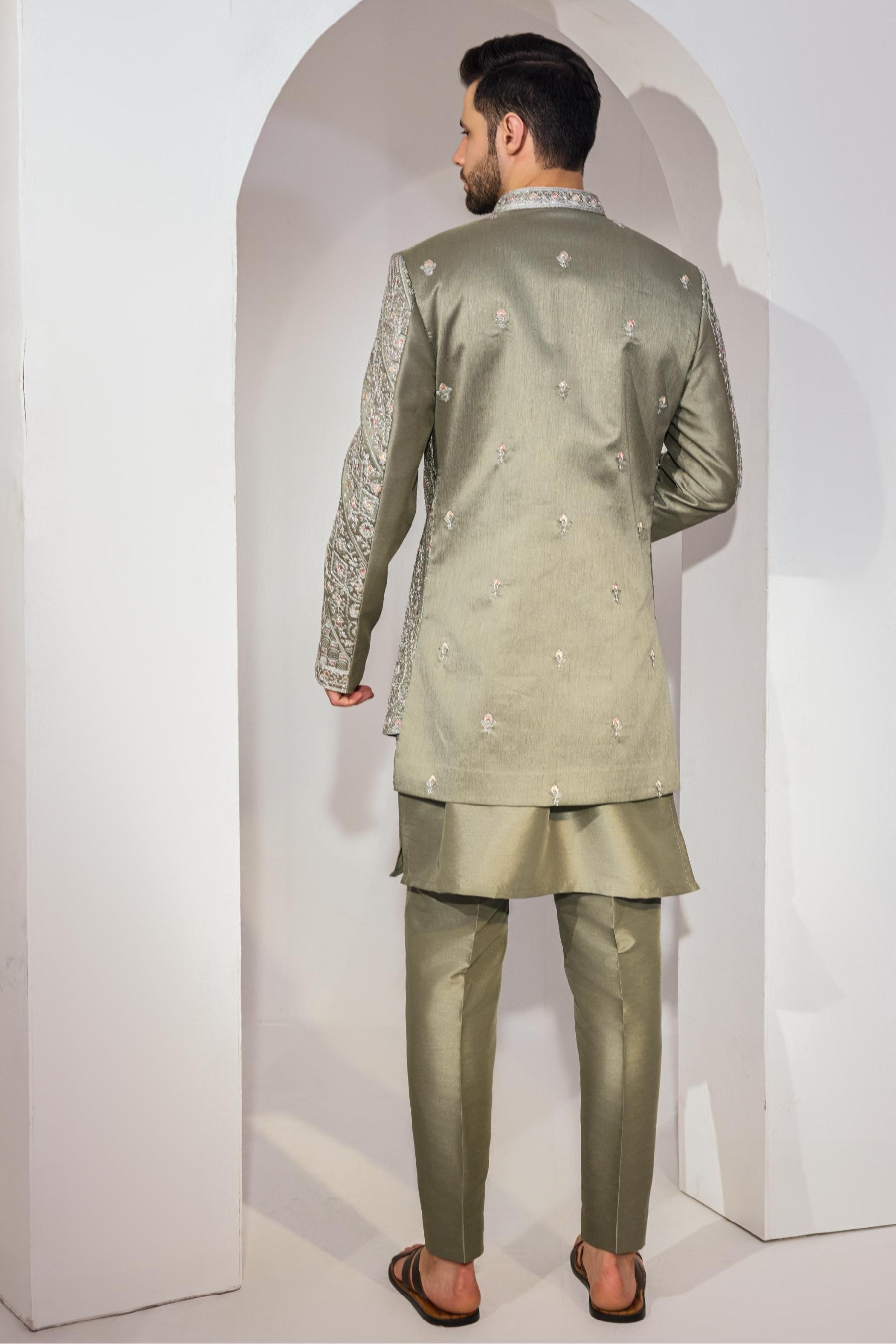Fresh, refined, and effortlessly elegant — the Green Indo with Kurta and Pant set is a modern classic. The rich green hue brings vibrancy to the structured Indo-western jacket, which is paired seamlessly with a matching kurta and tailored pants. Ideal for mehendi functions, festive gatherings, or daytime celebrations, this ensemble offers a stylish alternative to traditional ethnicwear. Designed for the modern man who values comfort, craftsmanship, and a bold yet sophisticated presence.