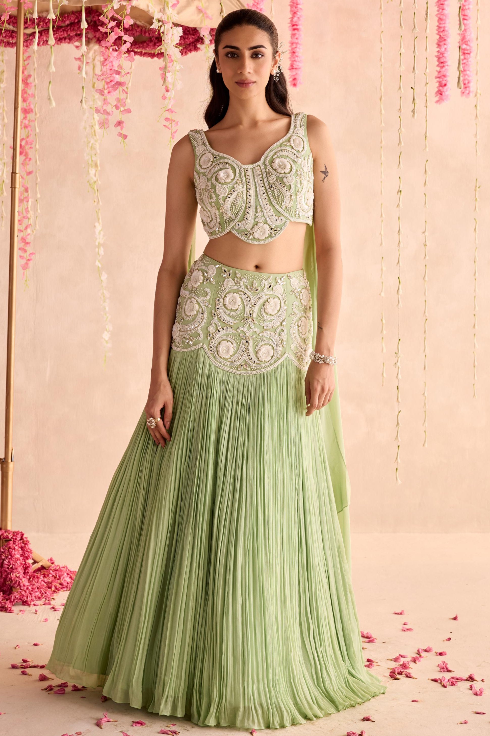 The Green Jasmine Under Bloom Lehenga Set is a stunning and ethereal ensemble that captures the delicate beauty of jasmine flowers in a soft green hue. The lehenga features intricate floral details and a flowing silhouette, paired with a complementing blouse and a lightweight dupatta. This set offers a perfect blend of traditional charm and contemporary elegance, making it ideal for weddings, festive celebrations, or special occasions. The refreshing green shade, coupled with the floral accents, creates a look that is both graceful and radiant. A timeless piece for those who appreciate femininity, nature-inspired elegance, and sophisticated design.