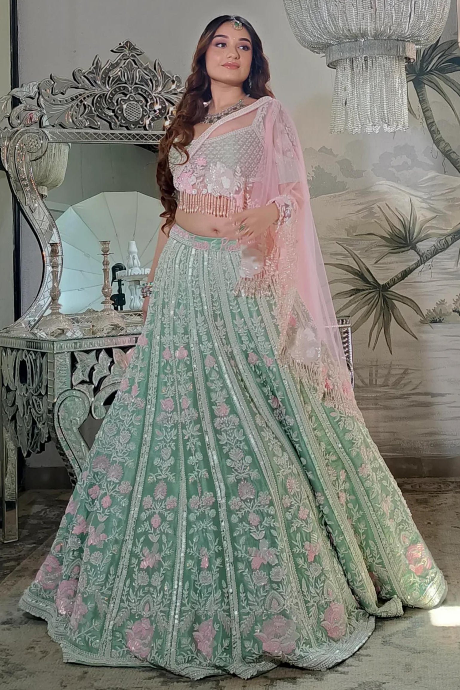 The Jezebel Lehenga Set is a perfect blend of modern elegance and traditional craftsmanship. In a beautiful sage green, the lehenga is hand embroidered with signature pearls, glass beads, sequins, and fine detailing. It is paired with a raw silk blouse featuring embroidered net sleeves. The look is completed with a one-shoulder draped dupatta and a blush pink embroidered veil dupatta, adding sophistication and charm to the ensemble.