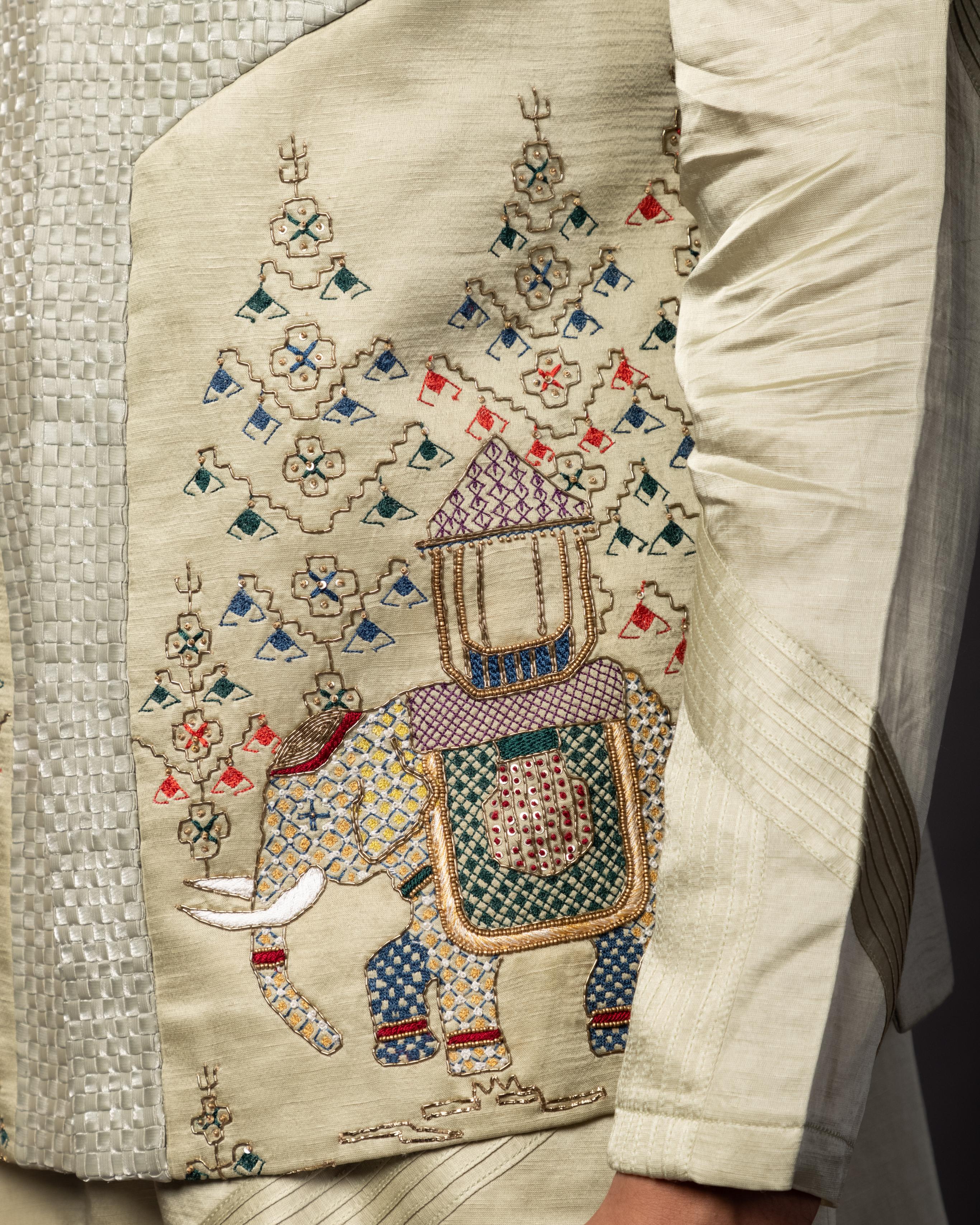 Celebrate cultural richness with the Green Kasuti Elephant Nehru Jacket, paired perfectly with a classic kurta and pajama set. This stunning jacket features Kasuti embroidery showcasing a majestic elephant design, symbolizing strength and wisdom. The vibrant green hue adds a fresh and regal touch, making this ensemble ideal for weddings, festive occasions, and cultural celebrations. The accompanying kurta and pajama offer both comfort and elegance, making you feel stylish yet at ease. Embrace the beauty of traditional craftsmanship and the majesty of the elephant with this captivating outfit.