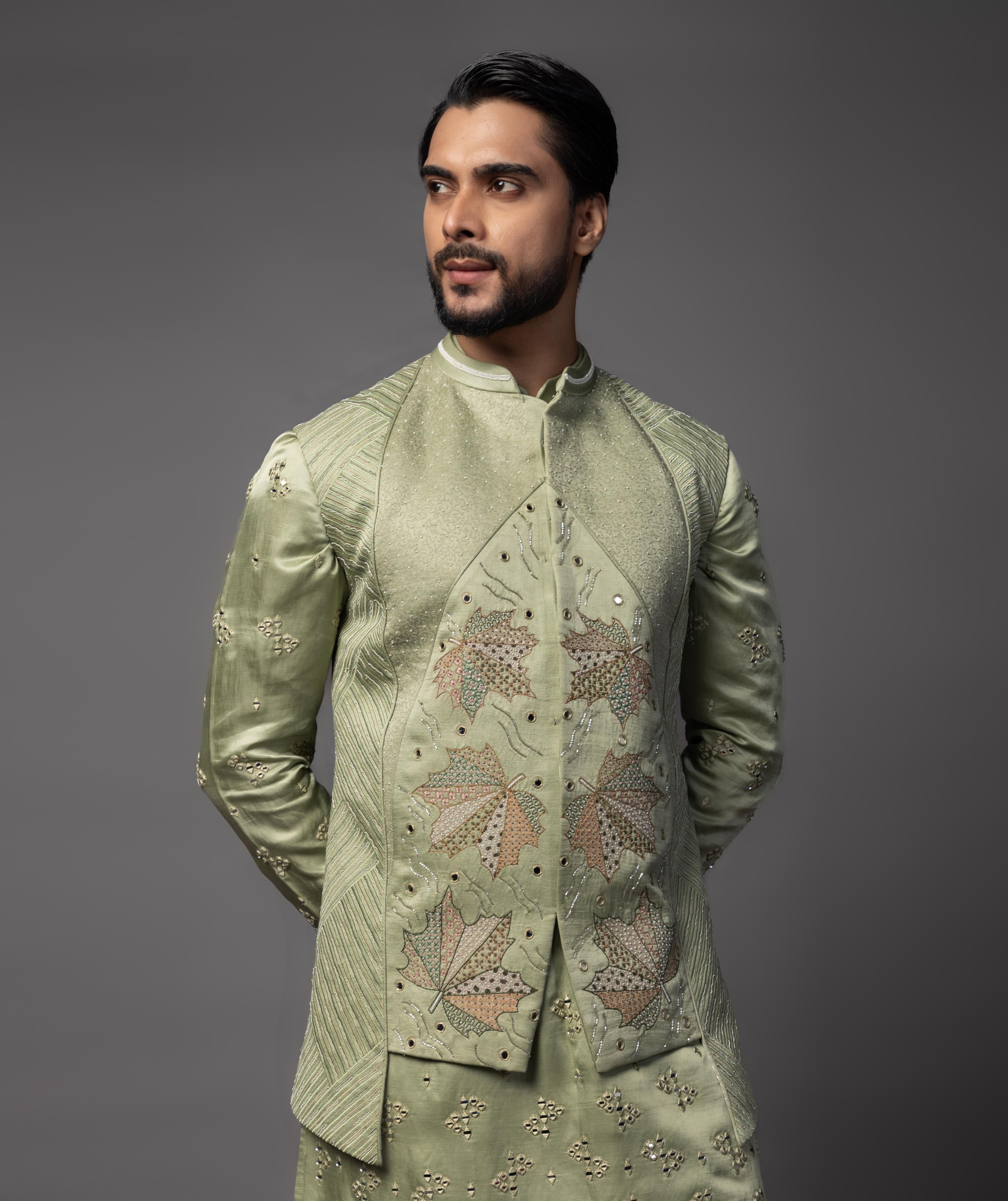 Green kasuti maple leaf nehru jacket with kurta and pajama