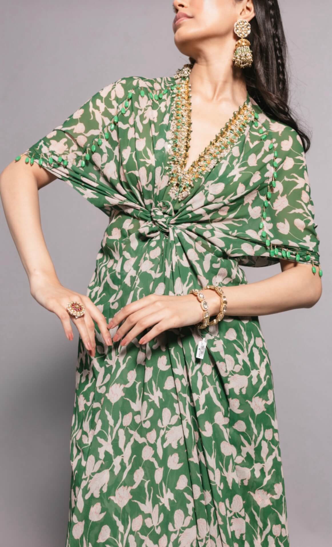 Elevate your wardrobe with our green printed knotted kaftan and sharara pants set, ideal for adding flair to both casual outings and special occasions. Whether you're attending a festive gathering or enjoying a relaxed day out, this ensemble promises comfort and style with every wear.