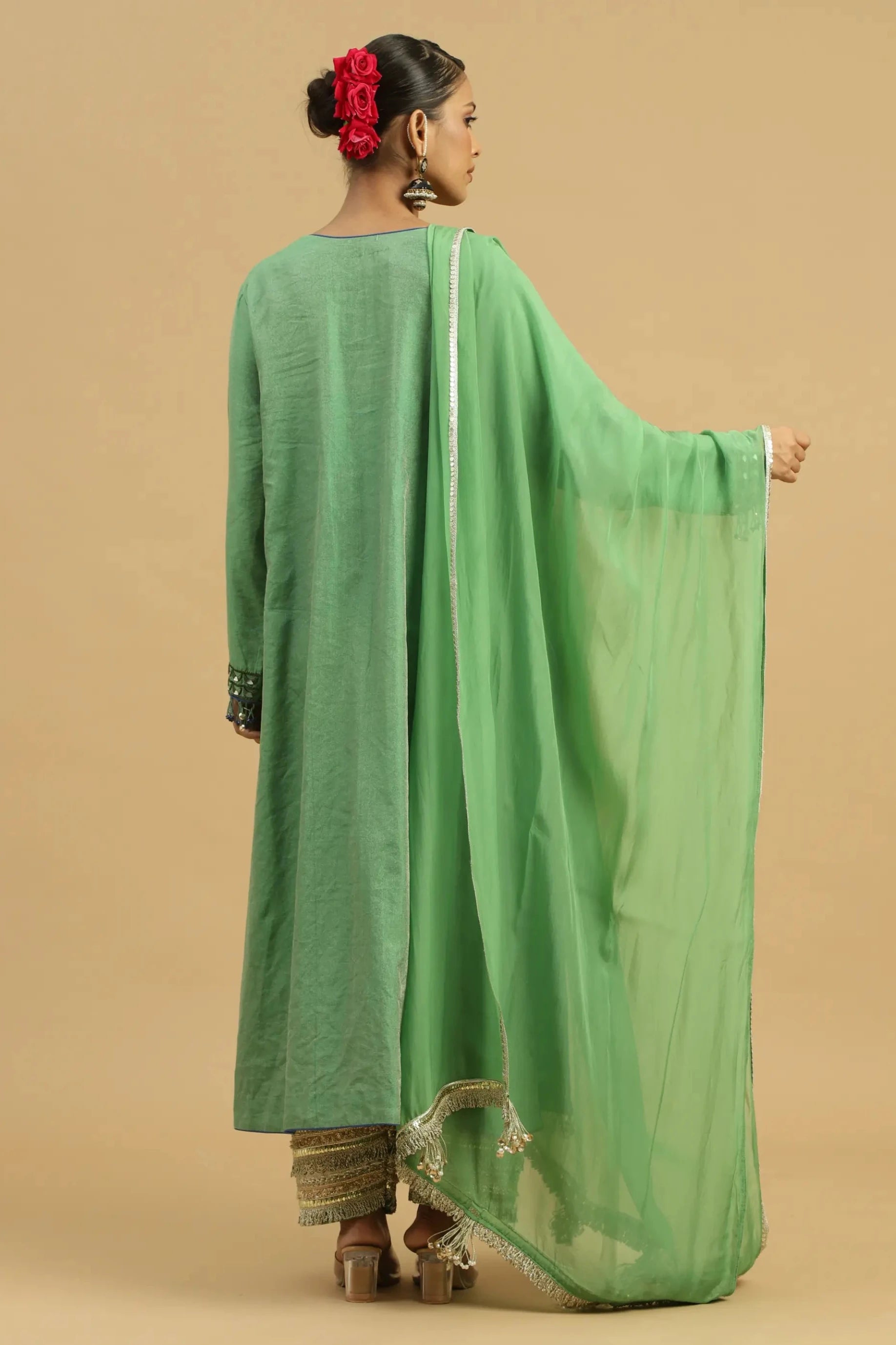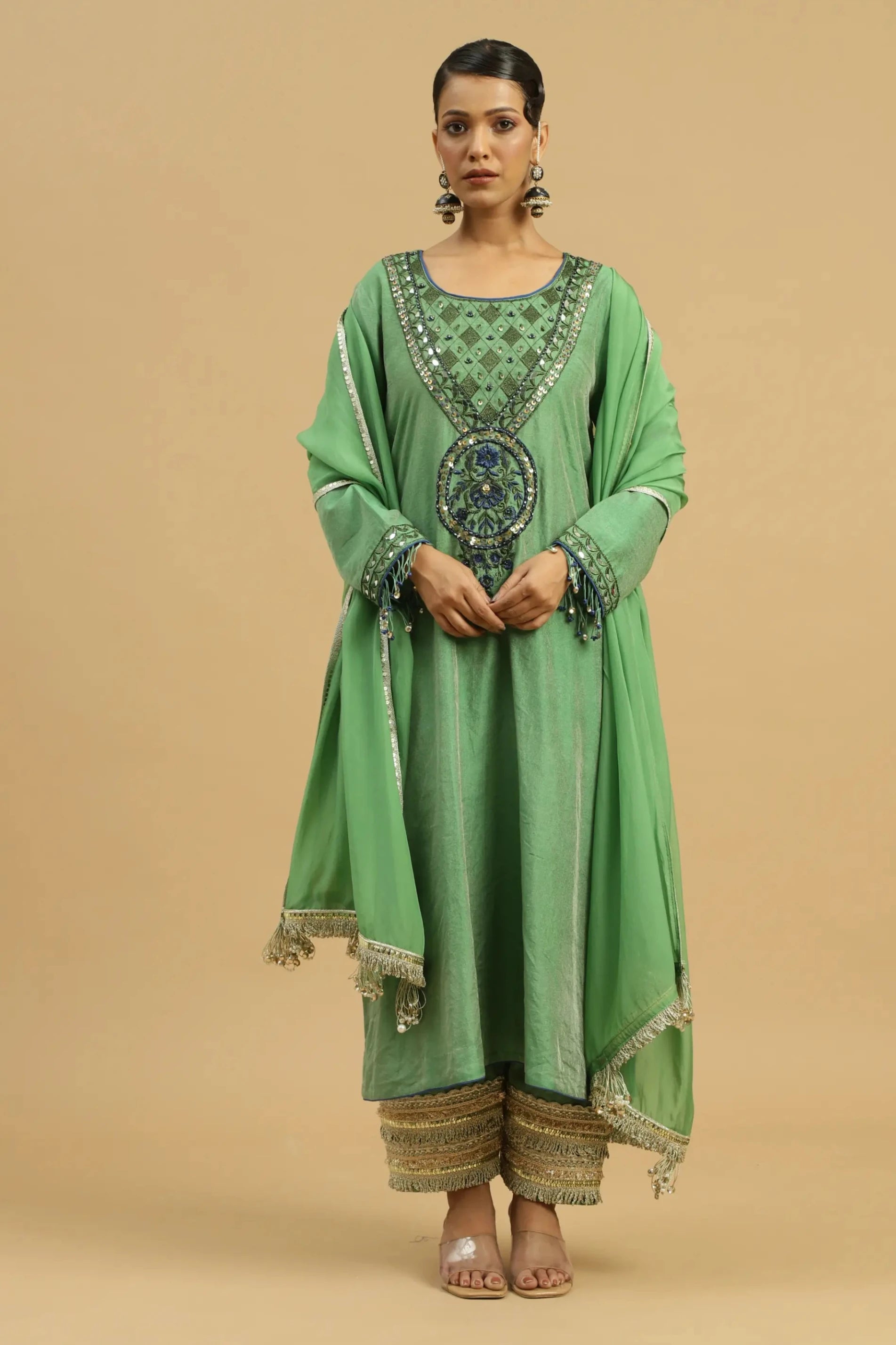 This vibrant green salwar set is a perfect blend of tradition and modern elegance. The rich green hue adds a pop of color, while the beautifully embellished crepe dupatta brings a touch of luxury and sophistication. The lightweight, breathable fabric ensures all-day comfort, making this outfit ideal for festive occasions, weddings, or special gatherings. The intricate embellishments on the dupatta elevate the look, adding a refined, sparkling detail to this classic ensemble. Pair it with your favorite accessories for a stunning, effortlessly chic appearance.