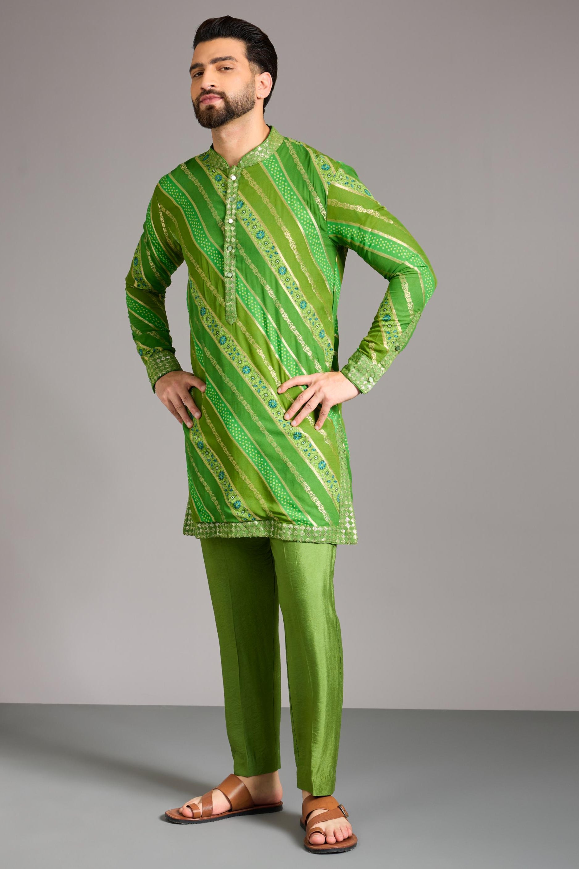 The Green Leheriya Bandhini Kurta Set is a perfect blend of traditional Indian craftsmanship and modern elegance. Featuring the iconic leheriya and bandhini tie-dye techniques, this set brings a fresh and vibrant energy to your wardrobe. The green tone adds a refreshing touch, while the intricate patterns evoke a sense of cultural heritage. Perfect for festive occasions, it offers a graceful yet stylish look. Pair with silver jewelry to enhance its timeless beauty and appeal.