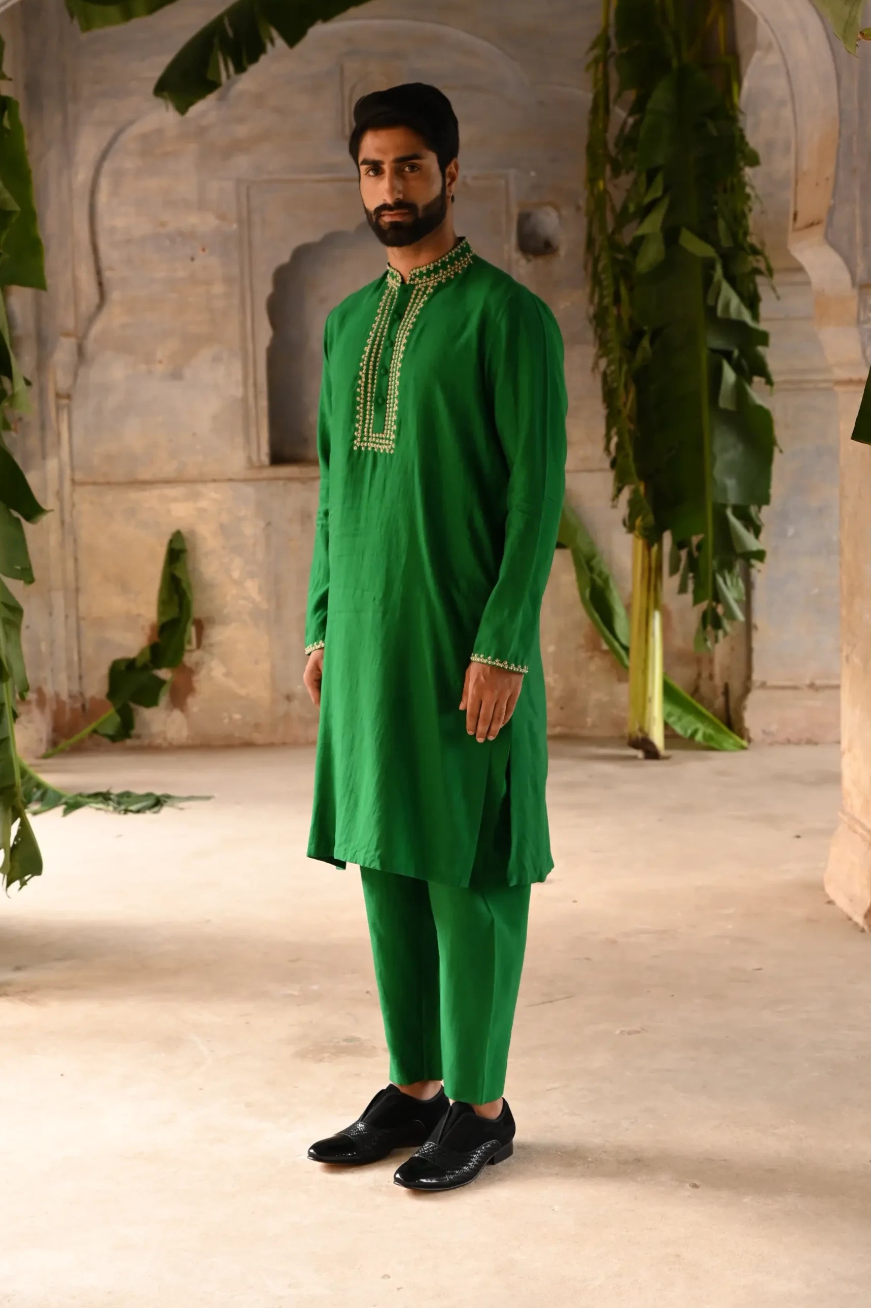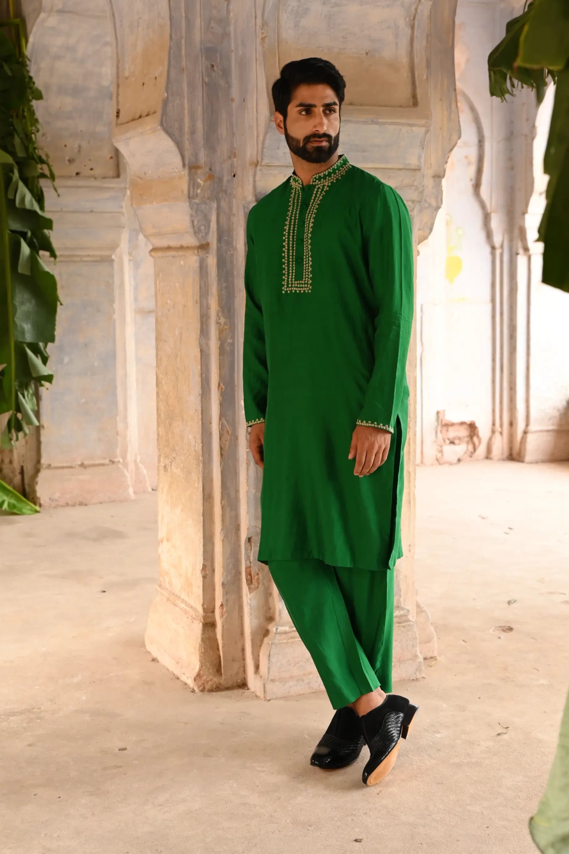 Elevate your ethnic wardrobe with our Green Men's Kurta Set. This stylish ensemble features a beautifully tailored kurta in a vibrant green hue, perfect for festive occasions, family gatherings, or casual outings. The breathable fabric ensures comfort and ease, making it ideal for all-day wear.