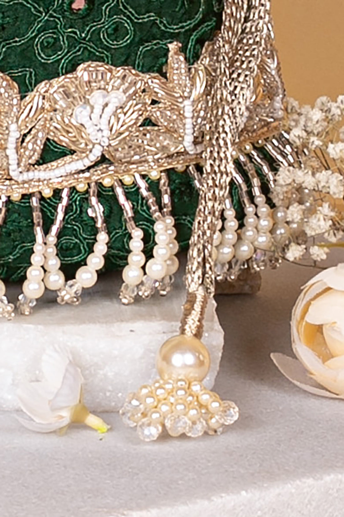 Fabric: Embroidered poly silk, poly satin lining, pearl and crystal fringe lace, woven gold thread drawstrings, embellished scallop lace handle, and pearl tassels.