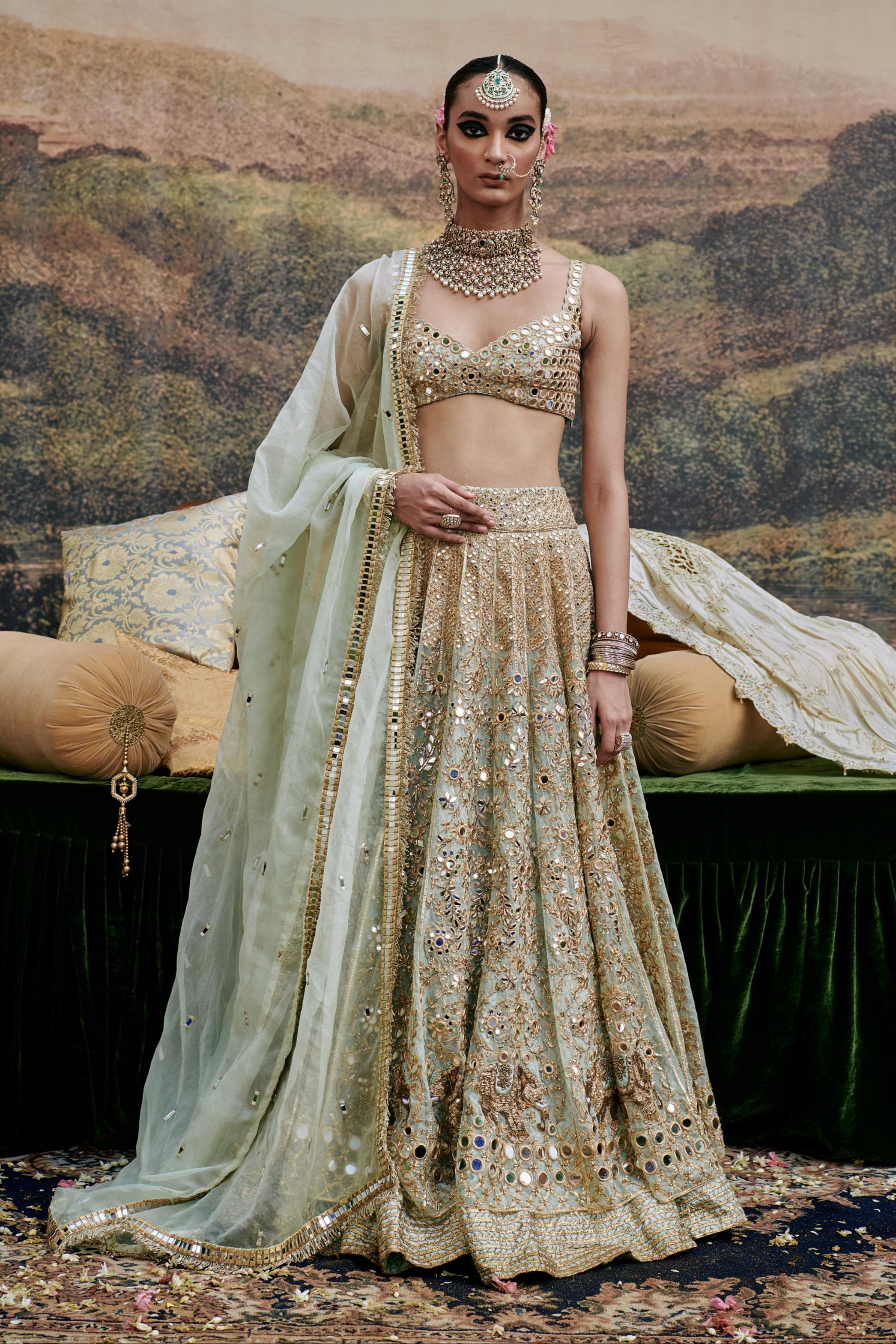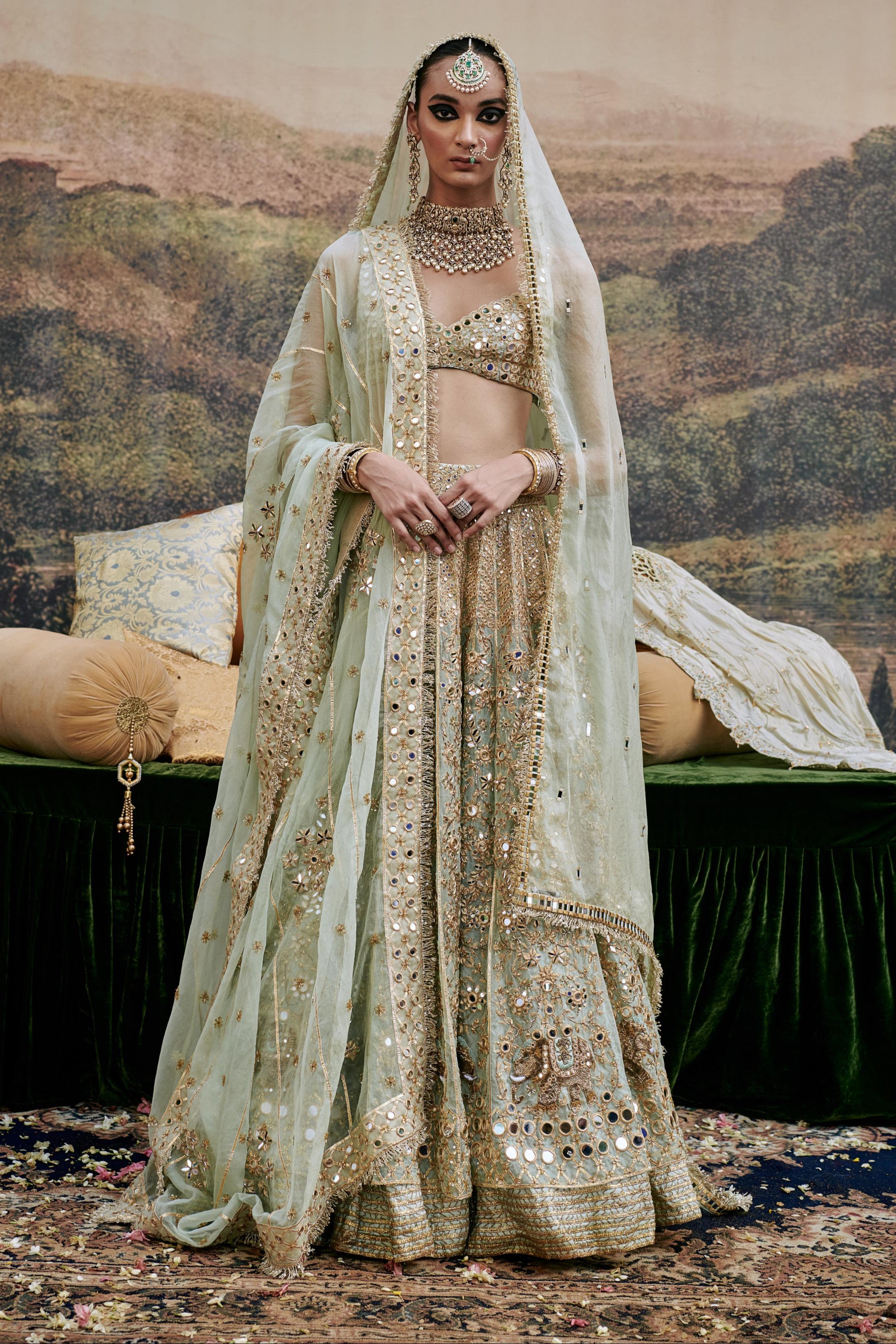 This enchanting powder blue organza lehenga features intricate mirror work and delicate elephant motif embroidery, exuding elegance and charm. Paired with a stunning mirror work blouse and an organza dupatta adorned with gota detailing on the border, itÕs perfect for a regal look. The ensemble is beautifully completed with a stylish veil, adding a touch of ethereal grace.