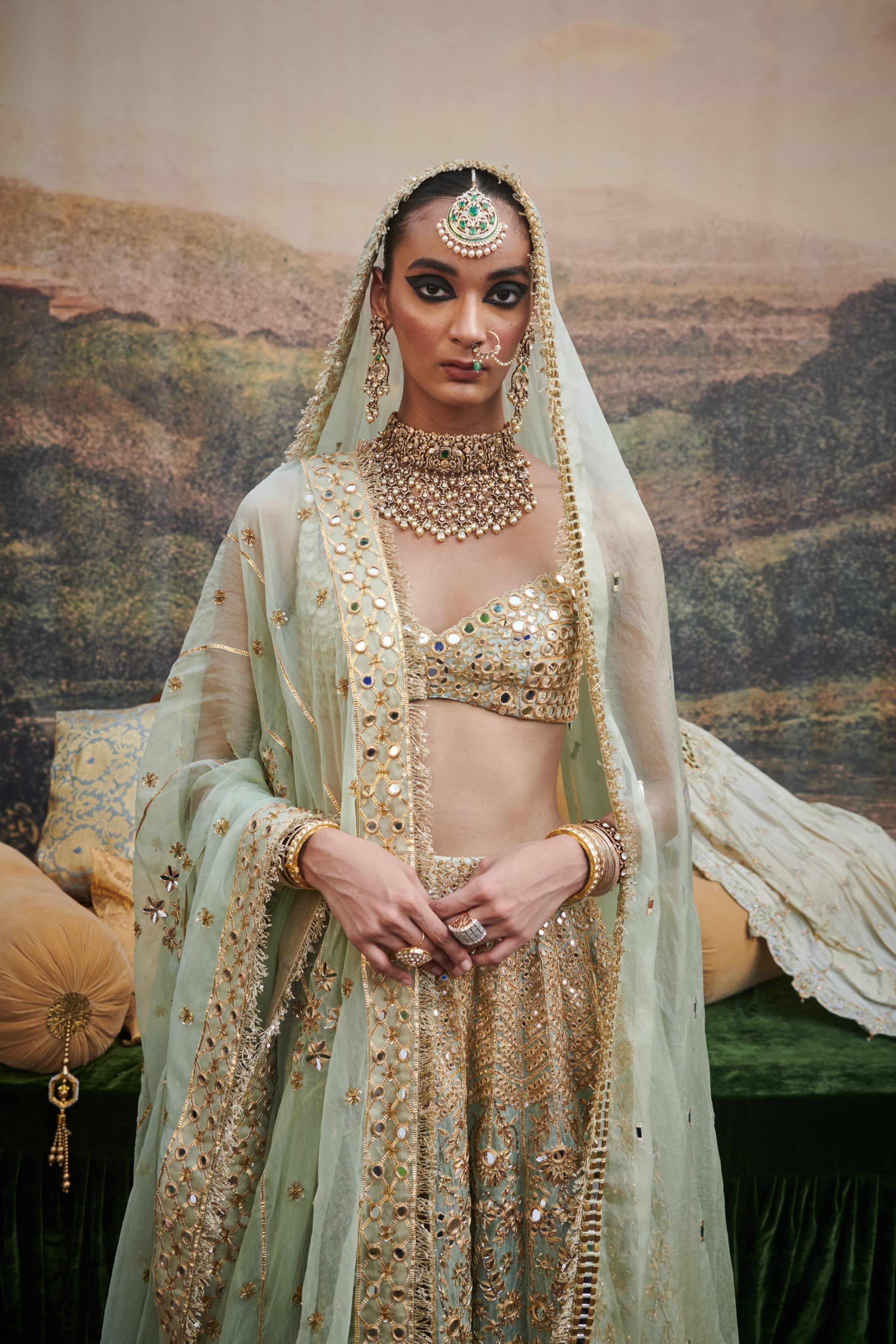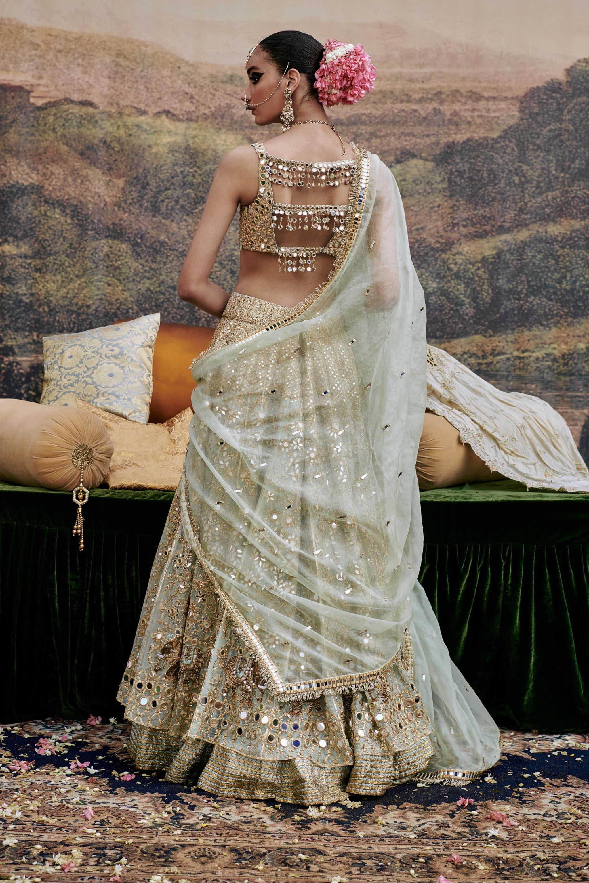 Components: 4 pieces (Lehenga, blouse, dupatta, veil)