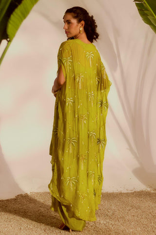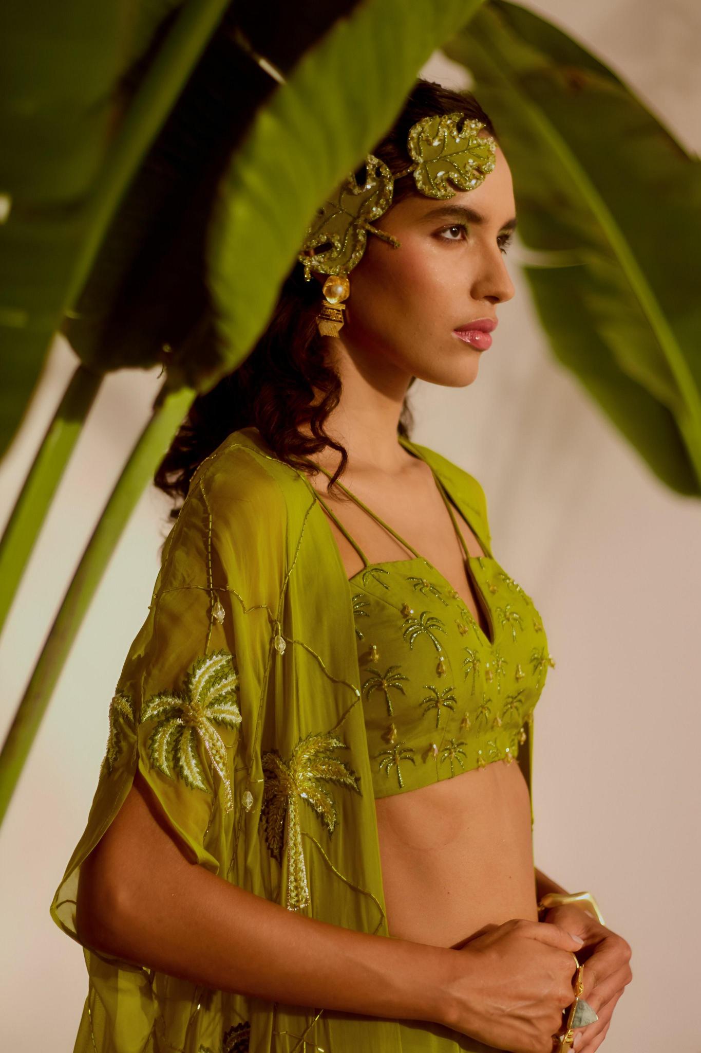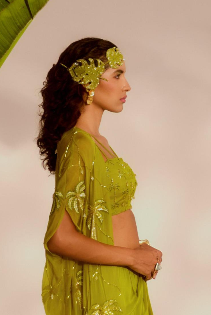 The Green Nyra Areca Cape and Drape Skirt Set exudes timeless sophistication with a modern twist. Featuring a beautifully crafted, flowing cape paired with an intricately draped skirt, this ensemble offers the perfect fusion of elegance and fluidity. The vibrant green hue brings a refreshing pop of color, while the silhouette embraces both strength and grace. Ideal for a grand event or an intimate gathering, this set speaks to the wearer's poise and confidence.