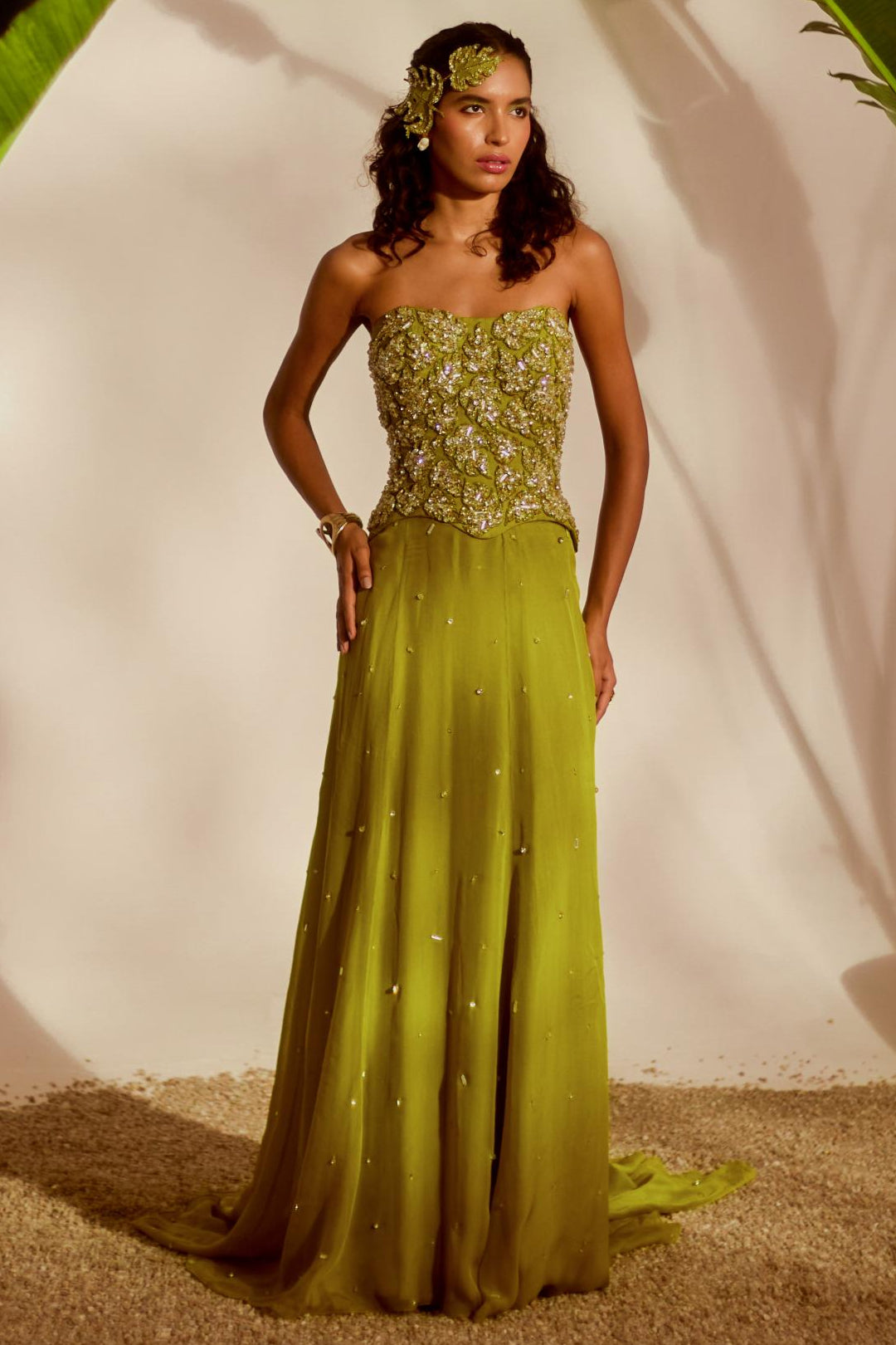 A bold celebration of tropical elegance, the Green Nyra Moriko Monstera Corset Set is where structured design meets lush, botanical artistry. The statement corset features hand-appliqued monstera motifs that channel an exotic, untamed spirit. Paired with a fluid skirt, the ensemble offers a balance of power and ease. Perfect for destination soirees or moonlit festivities, this set is a wearable escape into a verdant dreamscape. A standout piece for the unapologetically vibrant soul.
