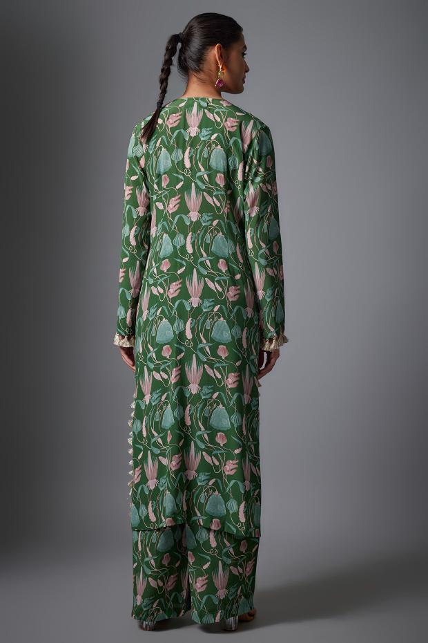 The Green Palazzo Set brings together relaxed tailoring and tonal richness in a silhouette that breathes. The free-flowing palazzos paired with a fluid top offer a modern approach to occasion dressing. With subtle detailing and an earthy hue, the set moves with quiet confidence. Ideal for both day festivities and mellow evenings. Understated yet effortlessly impactful.
