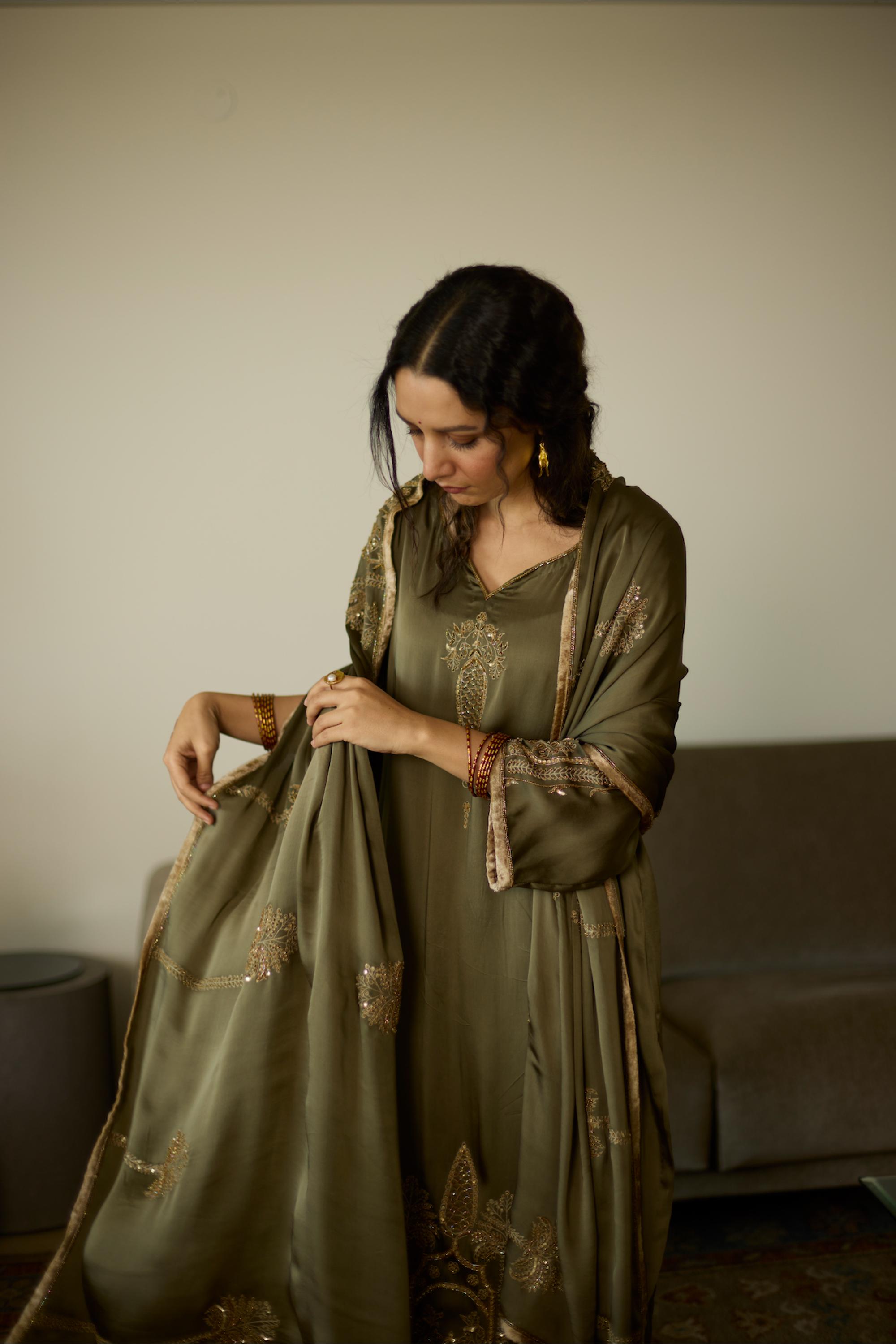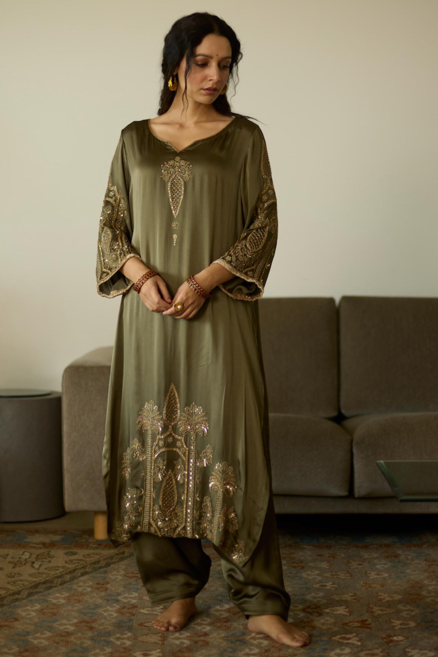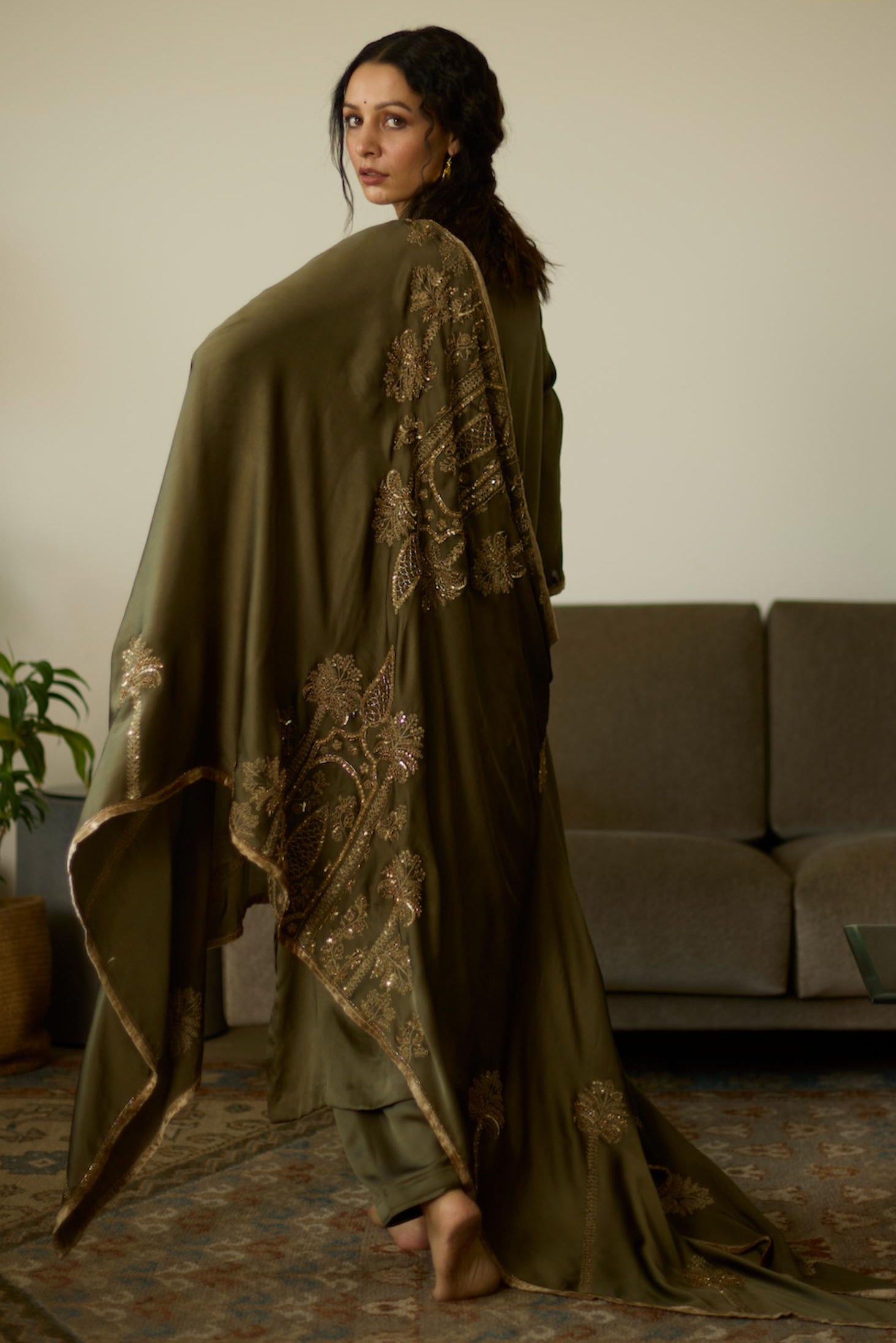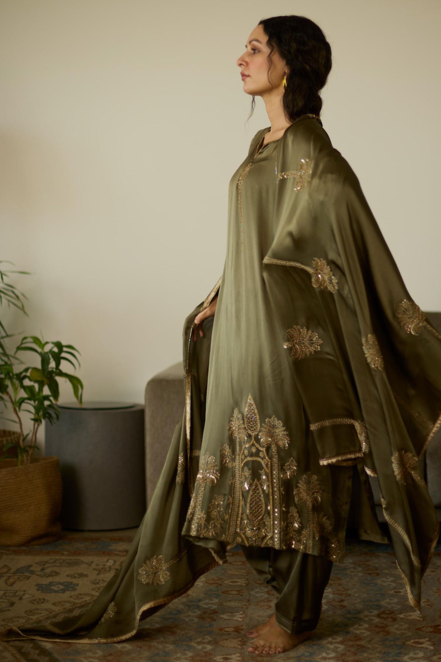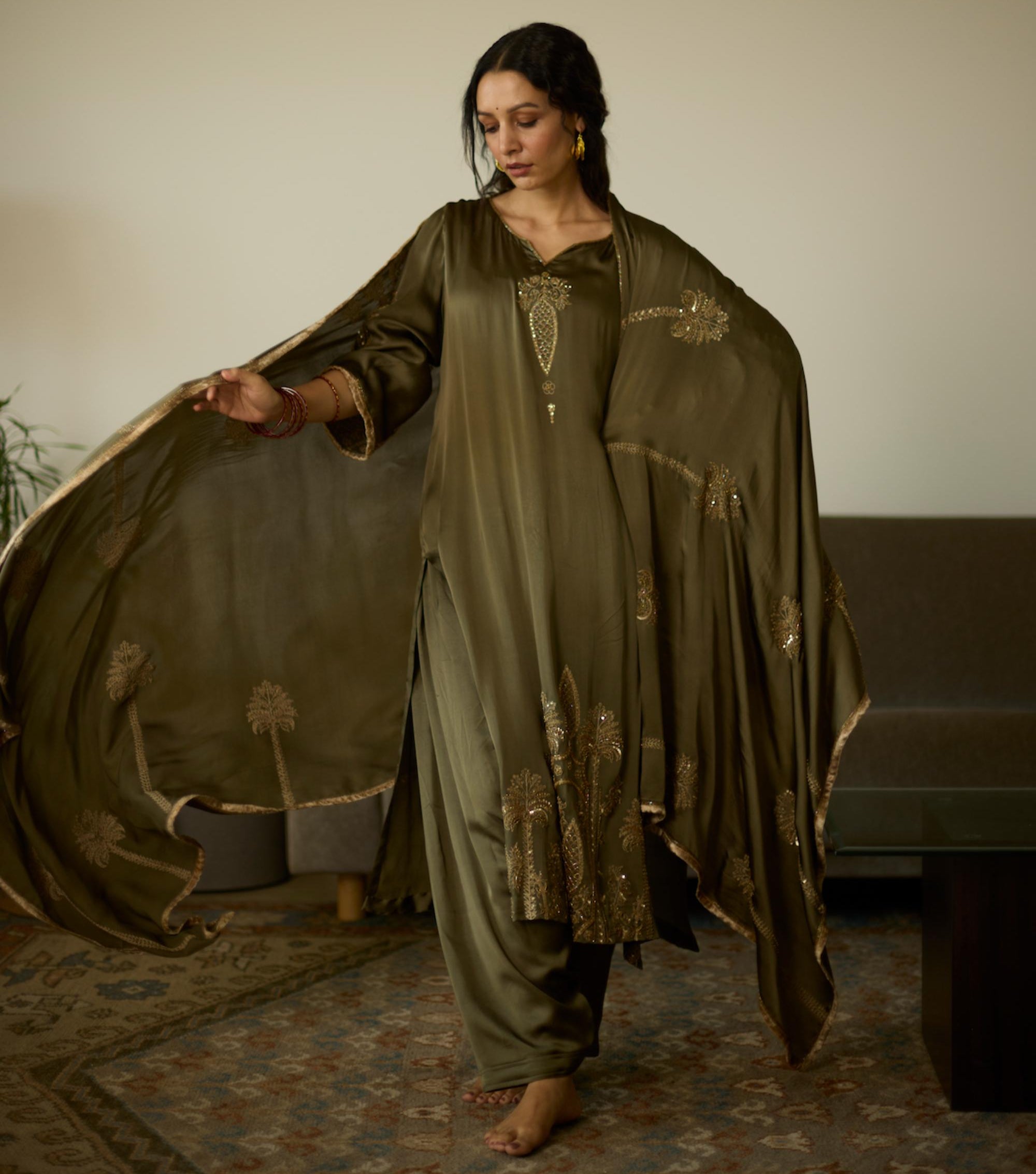 Embrace timeless charm in the Green Palm Hand-Embroidered Kurta Set. With intricate detailing and a graceful silhouette, this ensemble is perfect for festive celebrations, weddings, and special occasions.