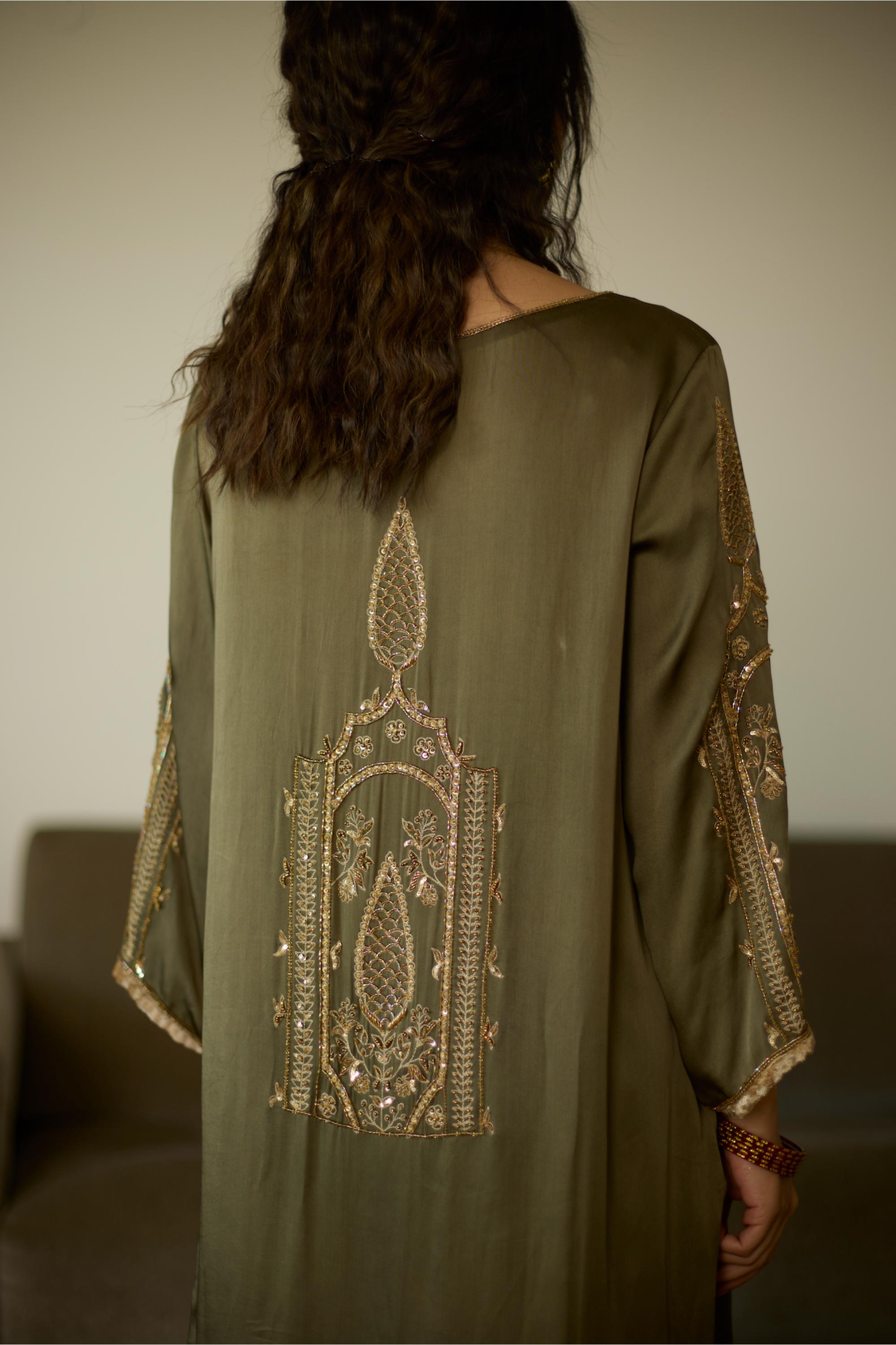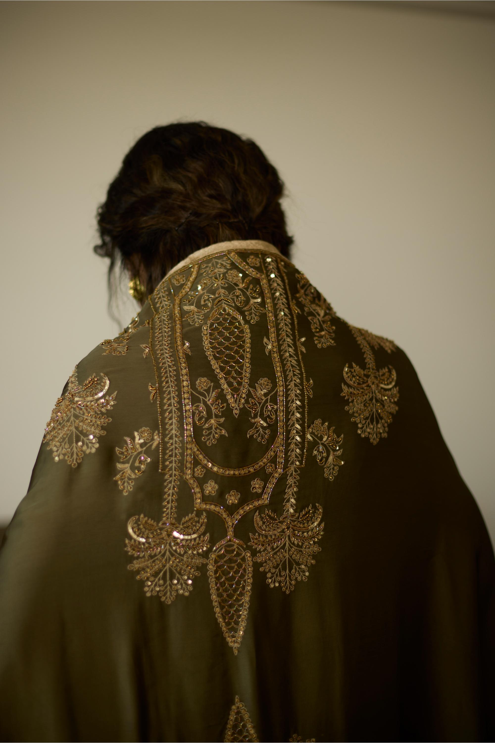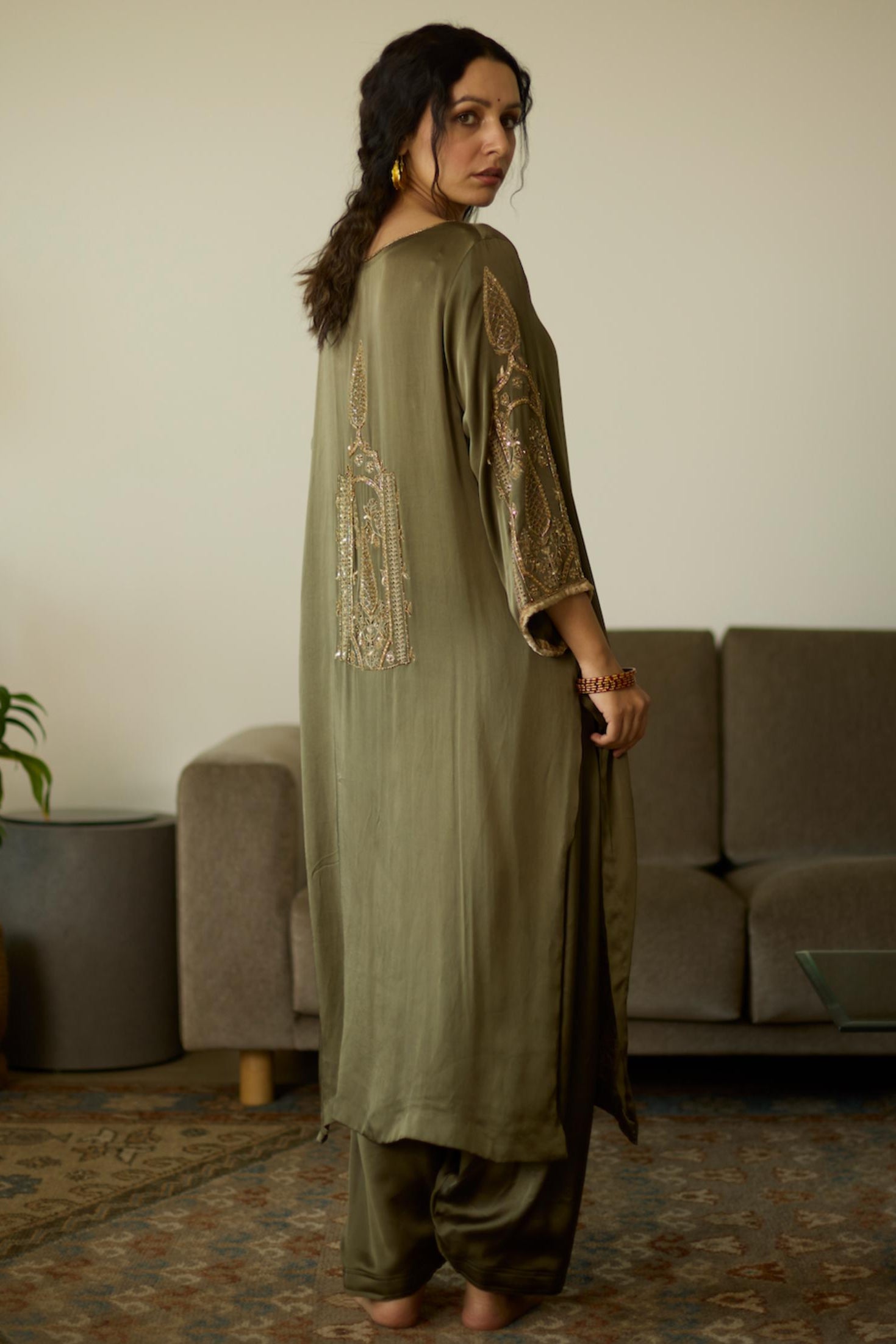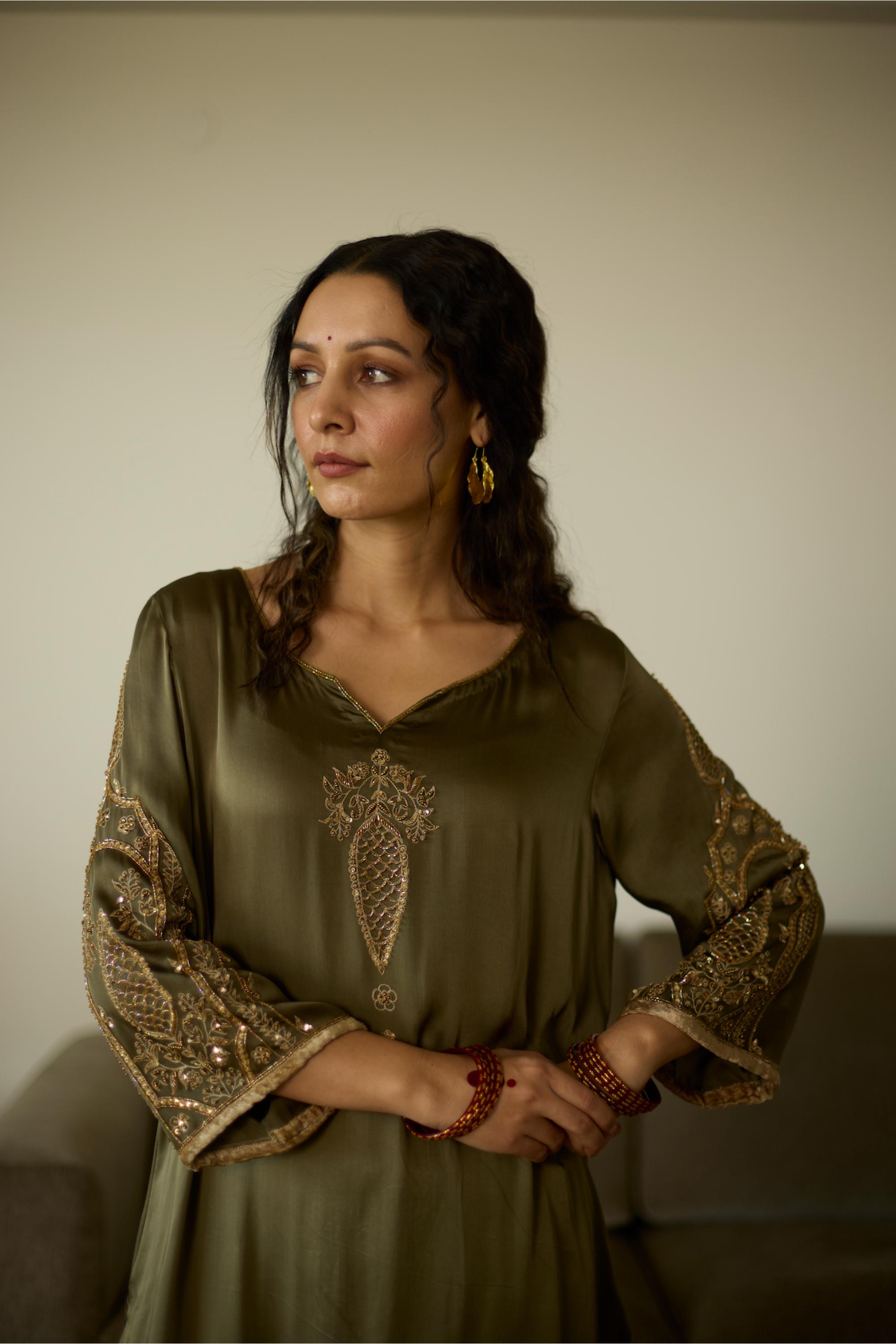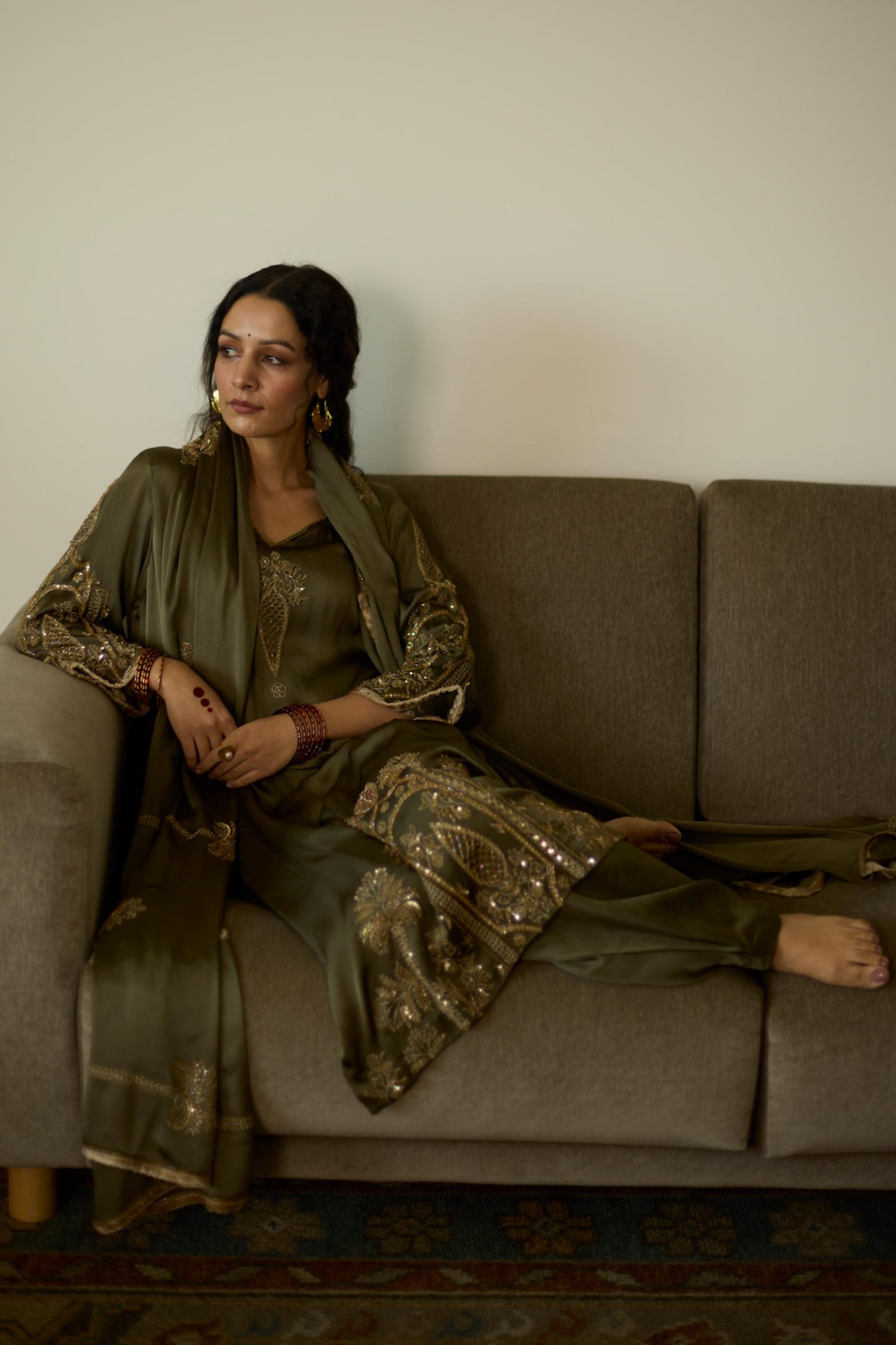 Embrace timeless charm in the Green Palm Hand-Embroidered Kurta Set. With intricate detailing and a graceful silhouette, this ensemble is perfect for festive celebrations, weddings, and special occasions.