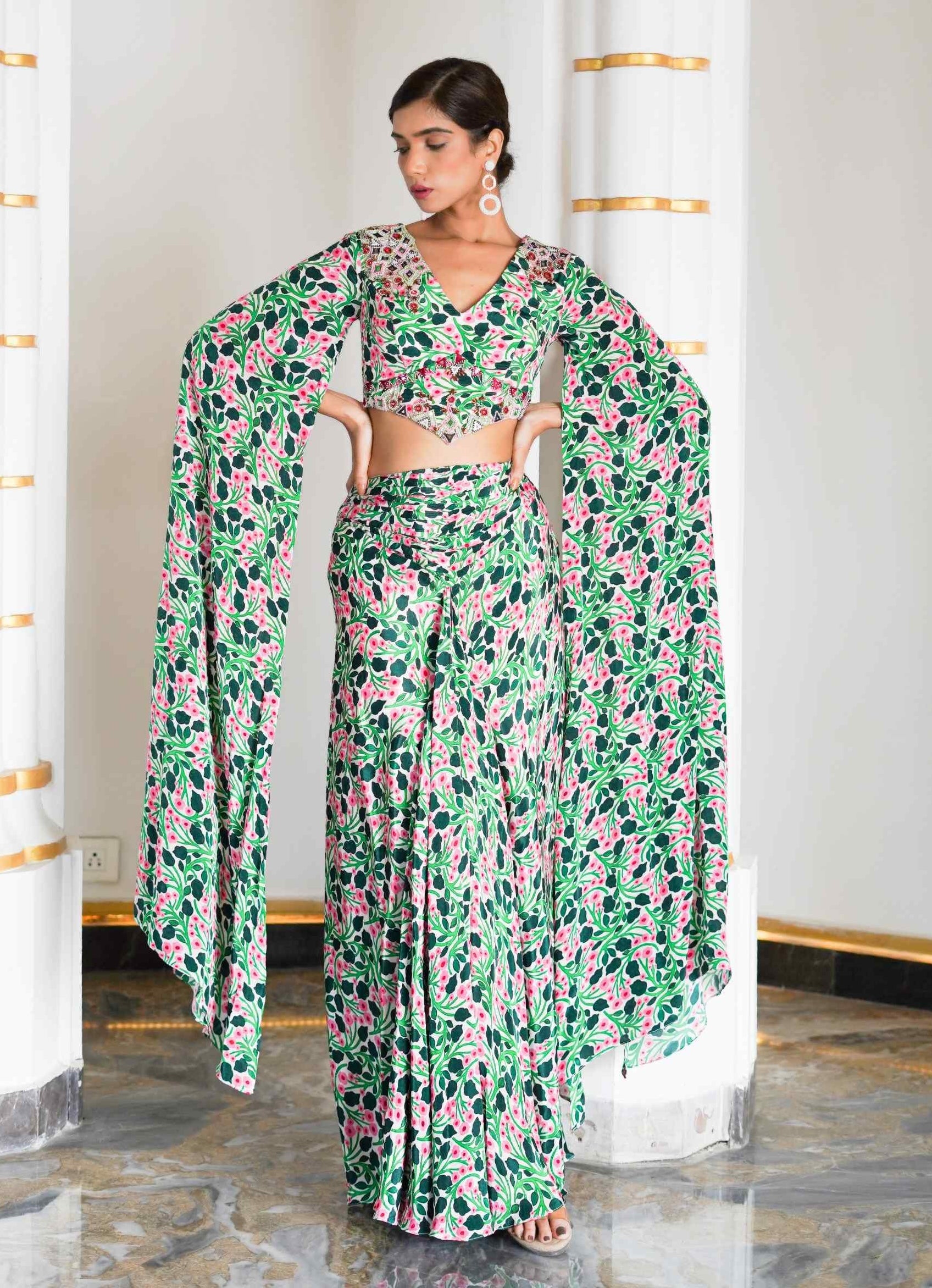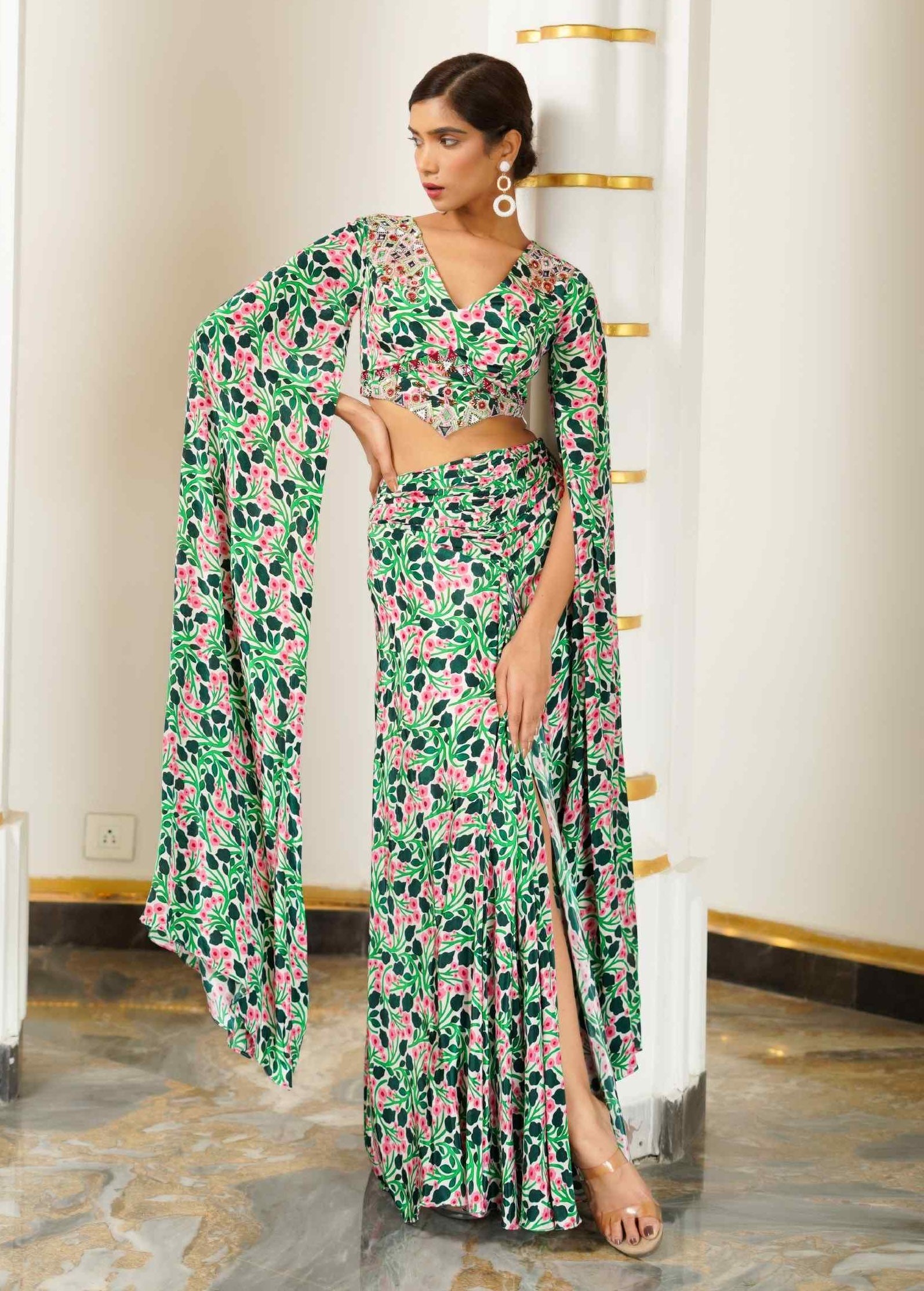 Elevate your style with this chic V-neck corset belt padded bustier, featuring long open cape sleeves that exude modern elegance. The high-waist front slit draped skirt adds a touch of drama and sophistication, creating a stunning silhouette that moves gracefully. Ideal for both formal and festive occasions, this set seamlessly combines contemporary design with timeless glamour.