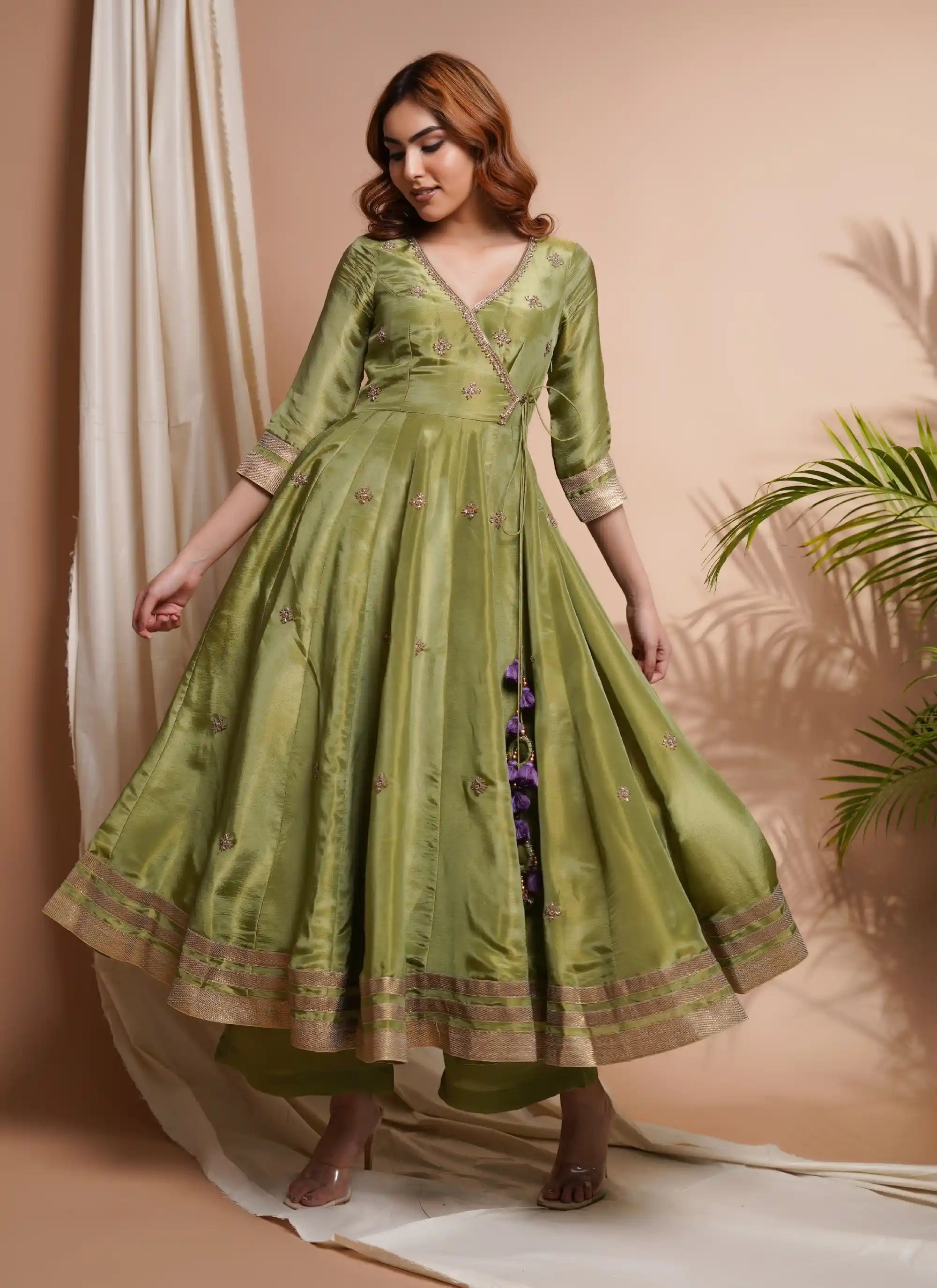An exquisite green and purple angrakha tissue silk suit set that exudes traditional elegance. The handwork on the neckline adds opulence, while each kali features delicate handwork butti. The tie-up detailing with heavy hangings enhances the ensemble's charm, complemented by a matching palazzo and purple dupatta with lace details.