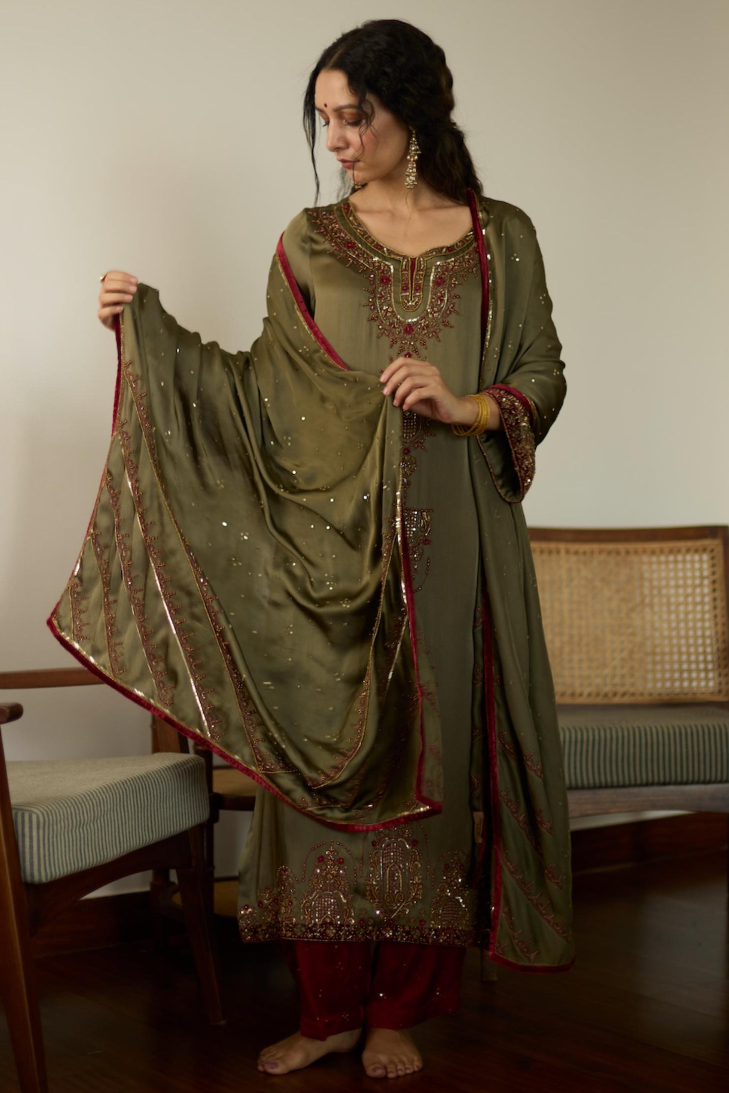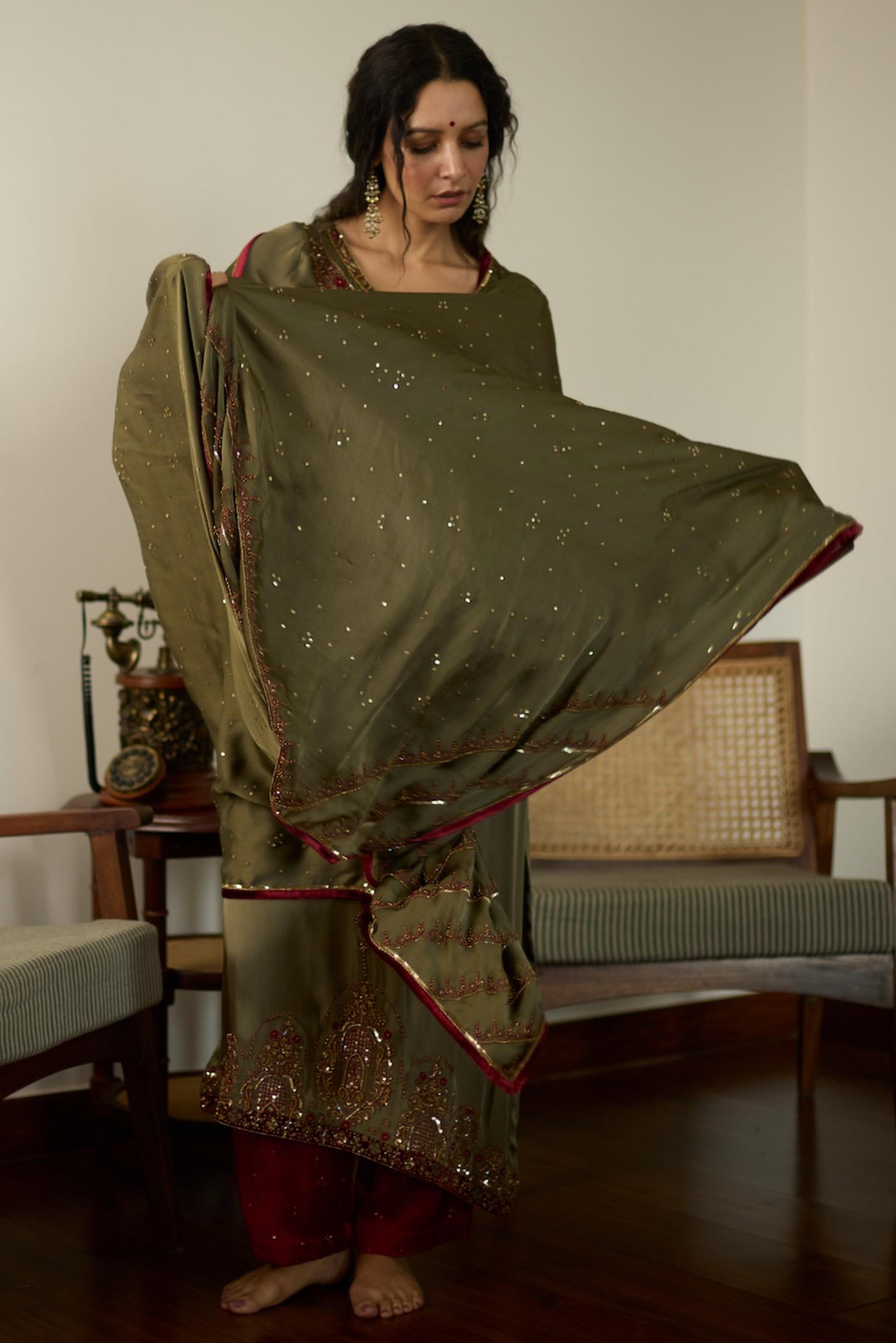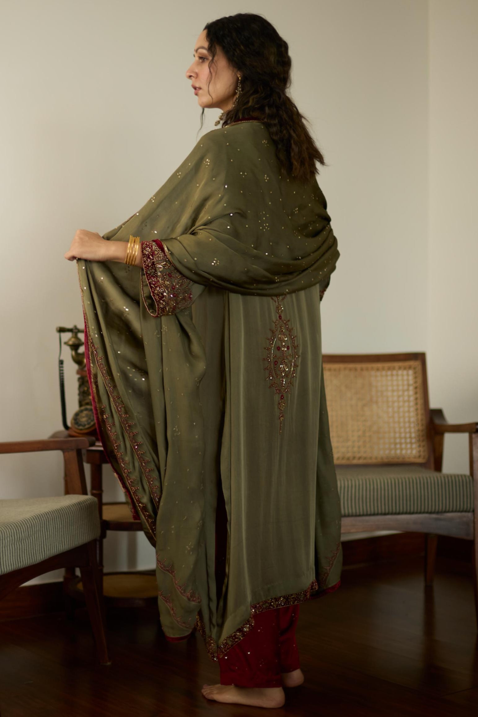 Fabric: Kurta- Satin georgette; pants- satin silk; dupatta- satin georgette