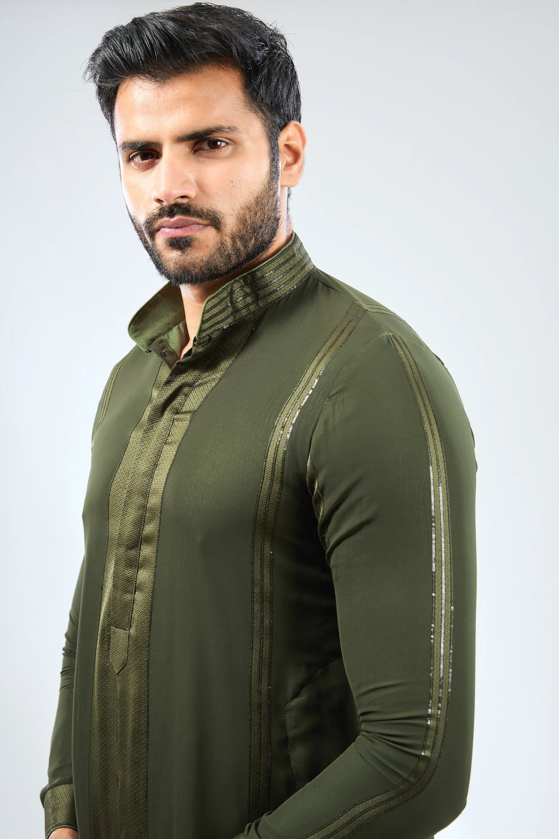 Add a touch of glamour to your wardrobe with our green sequin lines kurta, featuring stunning sequin accents that create a chic and modern look. Paired with comfortable matching pants, this ensemble is perfect for festive occasions or stylish gatherings. Experience the perfect blend of elegance and contemporary flair with this eye-catching outfit that will make you stand out.