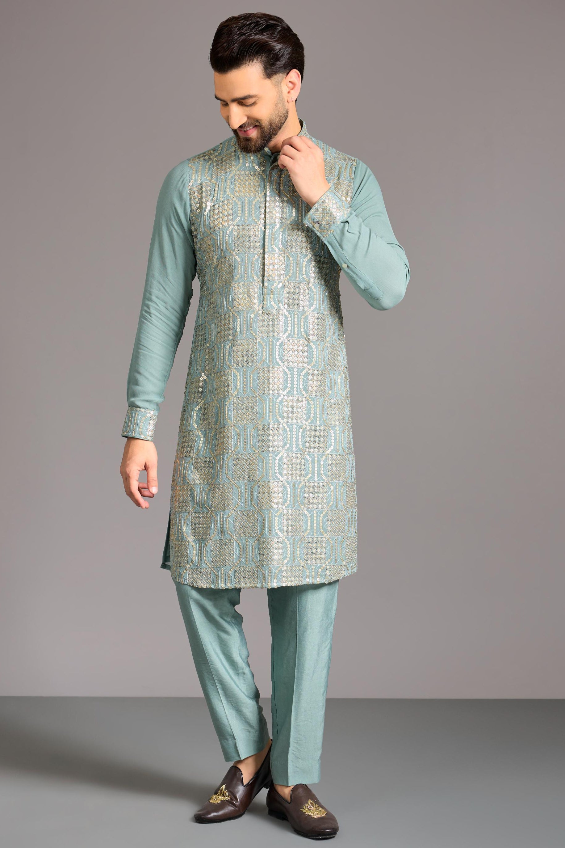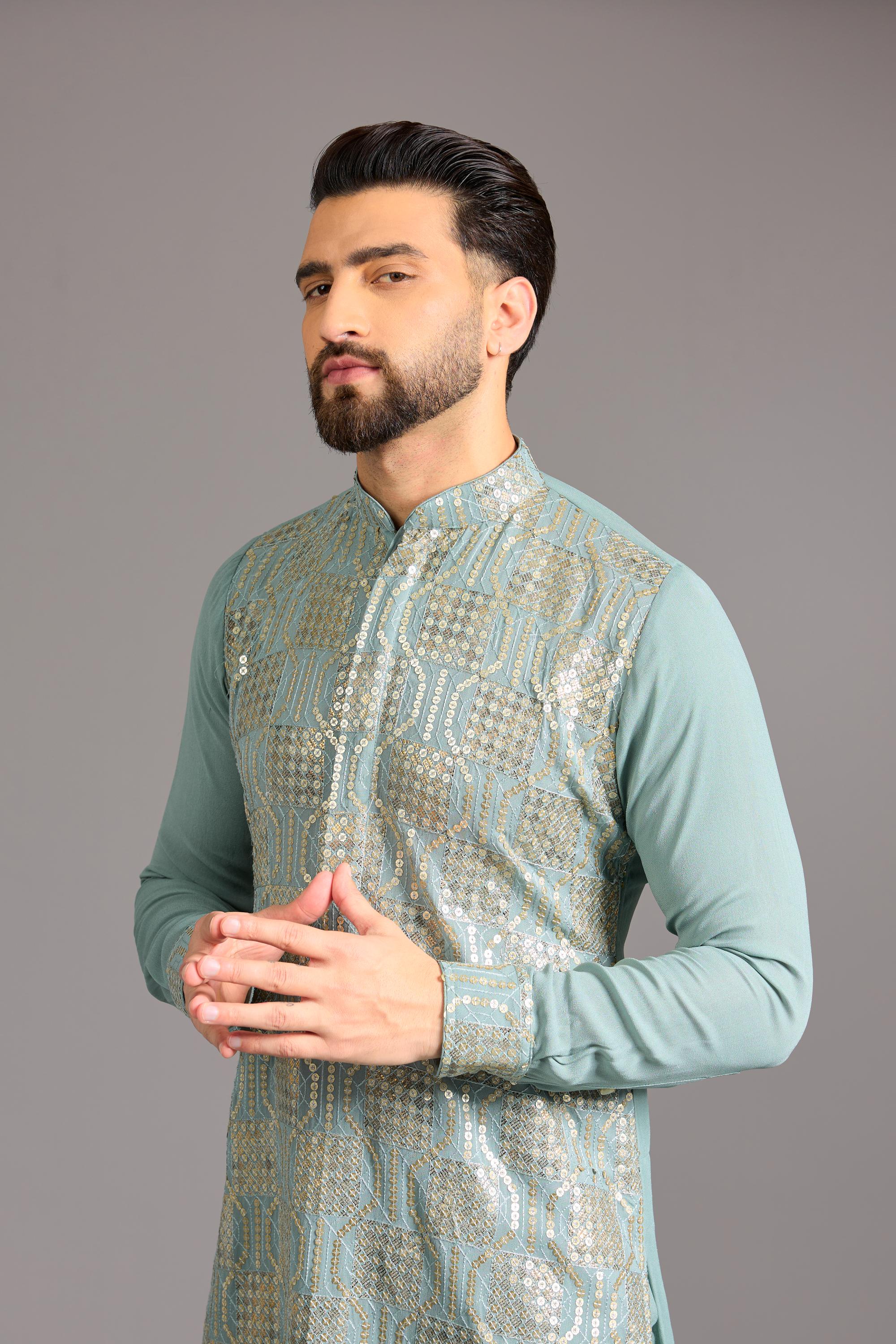 The Green Sequin Square Box Kurta Set is a modern take on traditional craftsmanship, featuring an innovative square box sequin design that adds a contemporary edge. The rich green base contrasts beautifully with the sparkling sequins, creating a sophisticated yet playful look. Ideal for festive occasions or chic evening events, this kurta set combines style with comfort, offering a unique, eye-catching appearance. The structured design and bold embellishments make it a statement piece that will stand out in any celebration.