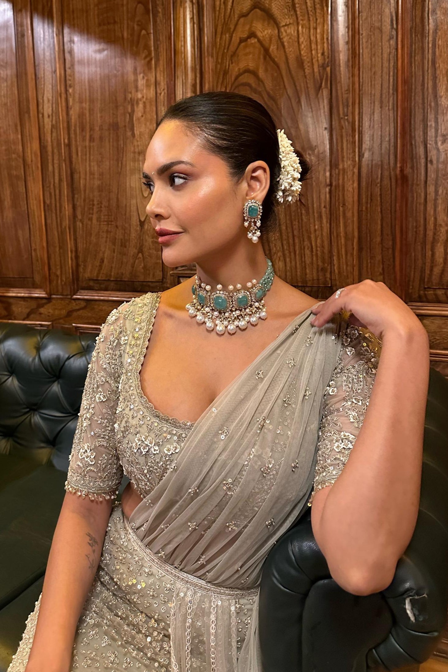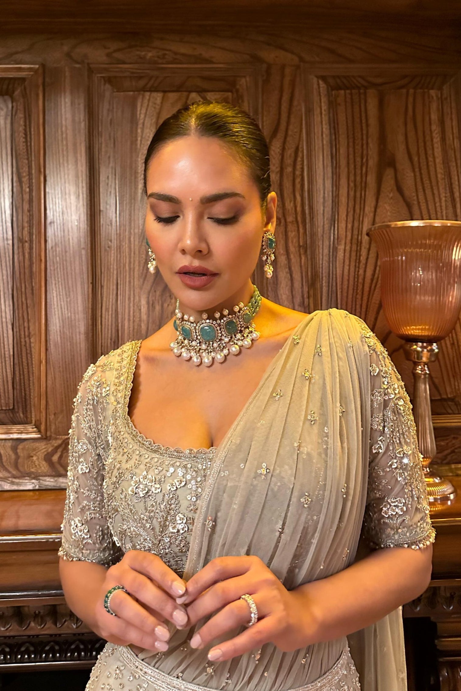 The Green Sitara Safarnama Saree Skirt Set is a tribute to starlit charm and contemporary elegance. Featuring a fluid saree inspired drape over a structured skirt, this ensemble sparkles with subtle embellishments reminiscent of scattered stars true to its name Sitara (star). The silver tone adds a modern yet timeless appeal, making it an ideal choice for cocktail evenings, sangeet celebrations, or any night that calls for a little shimmer and a lot of style.