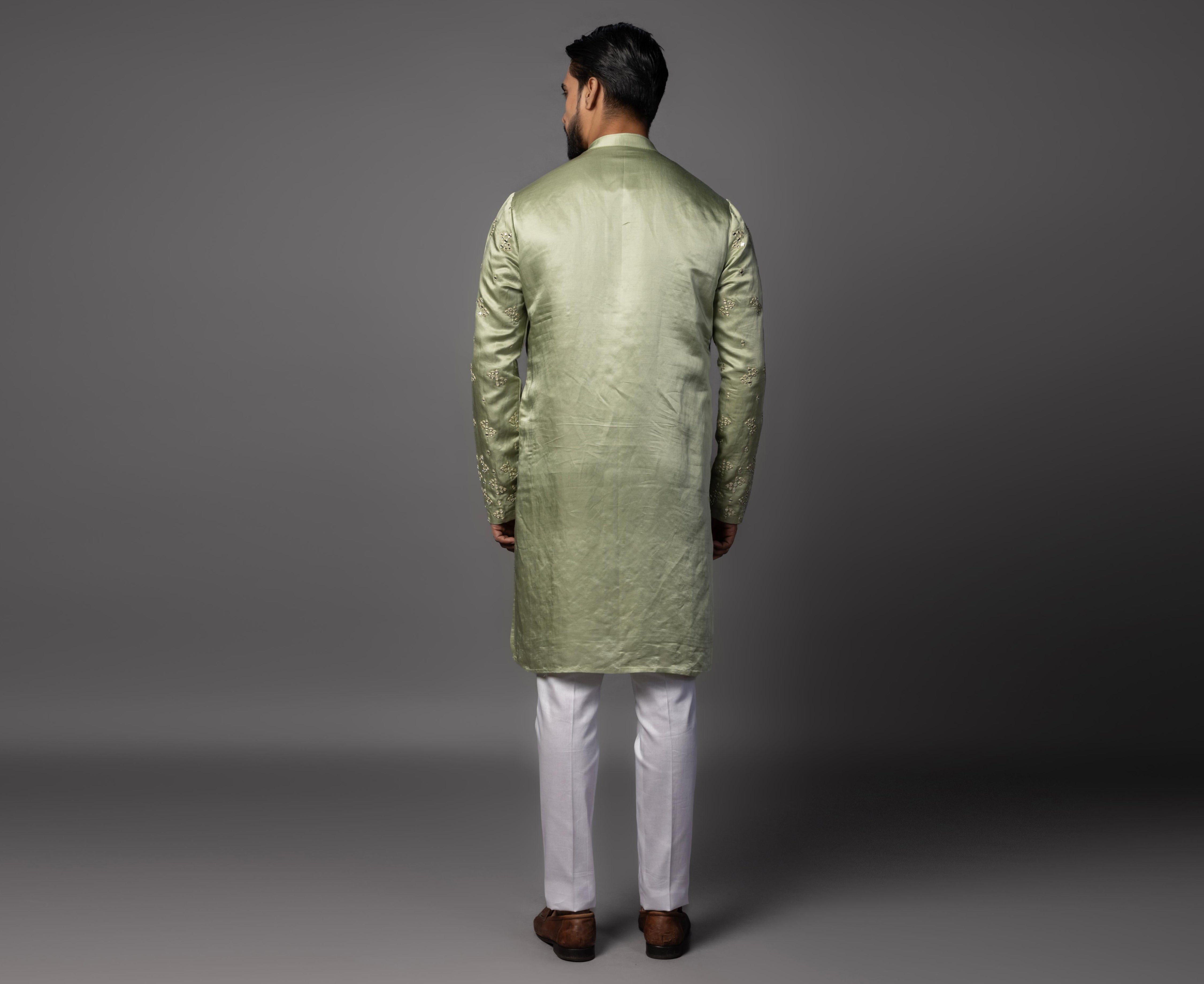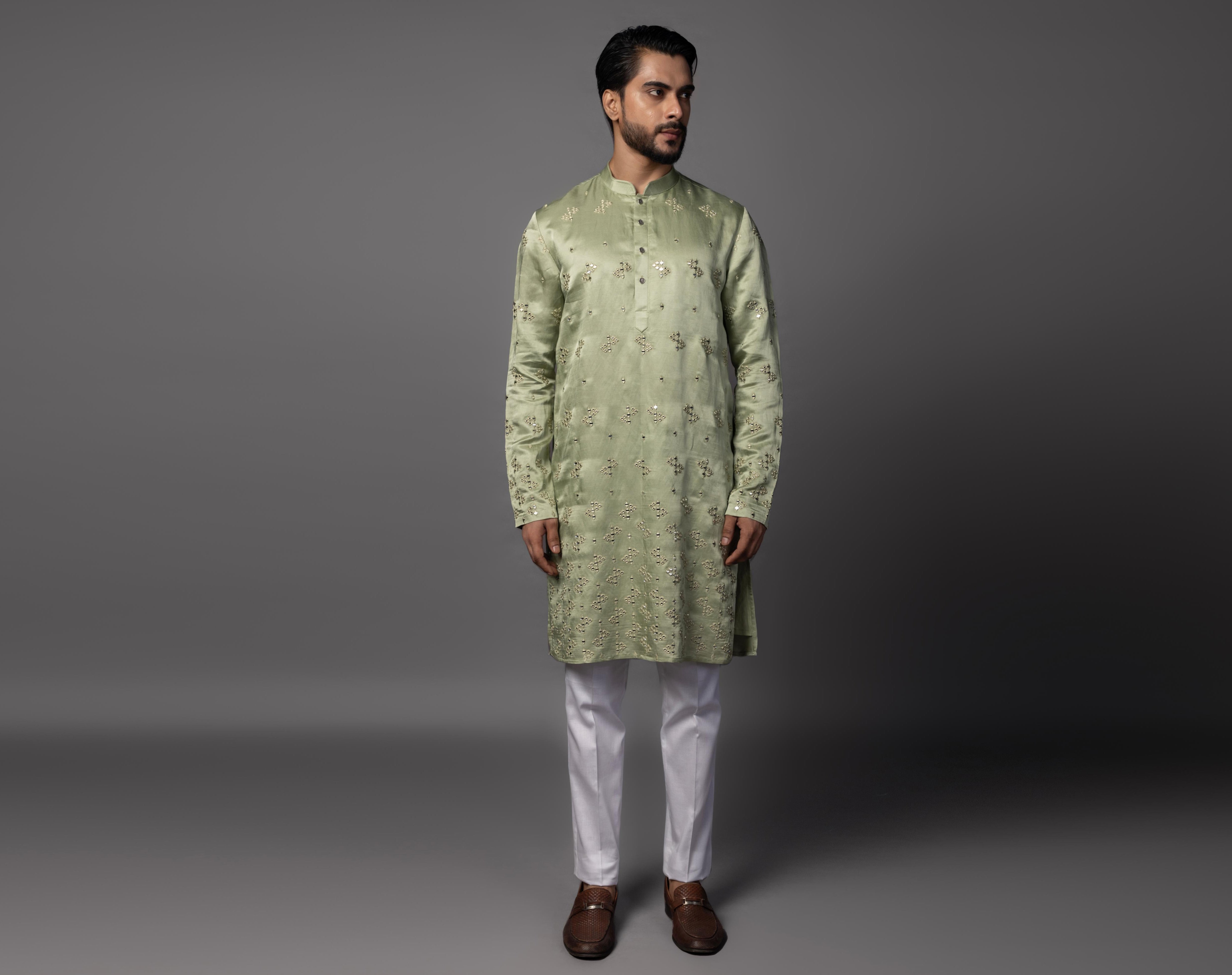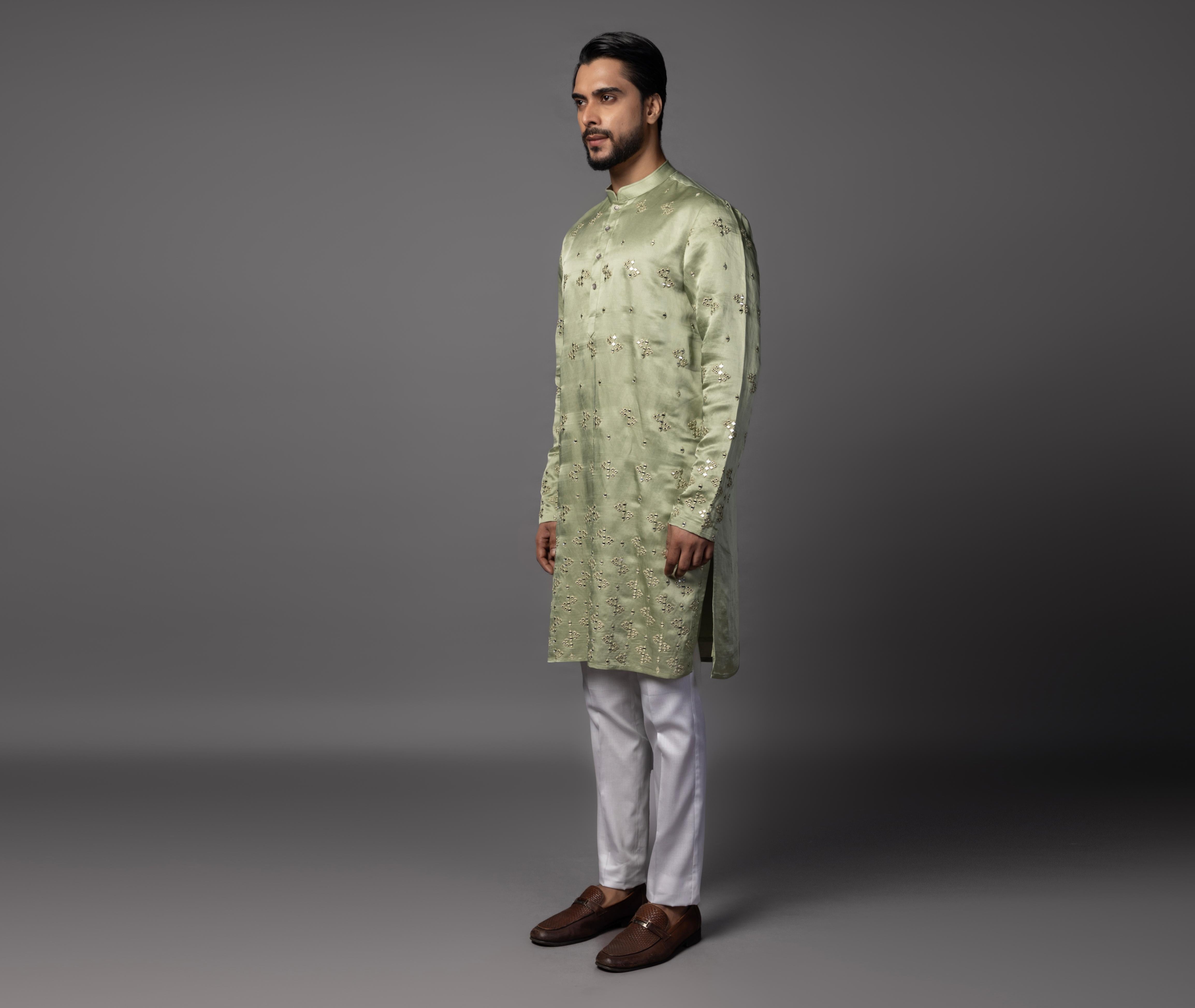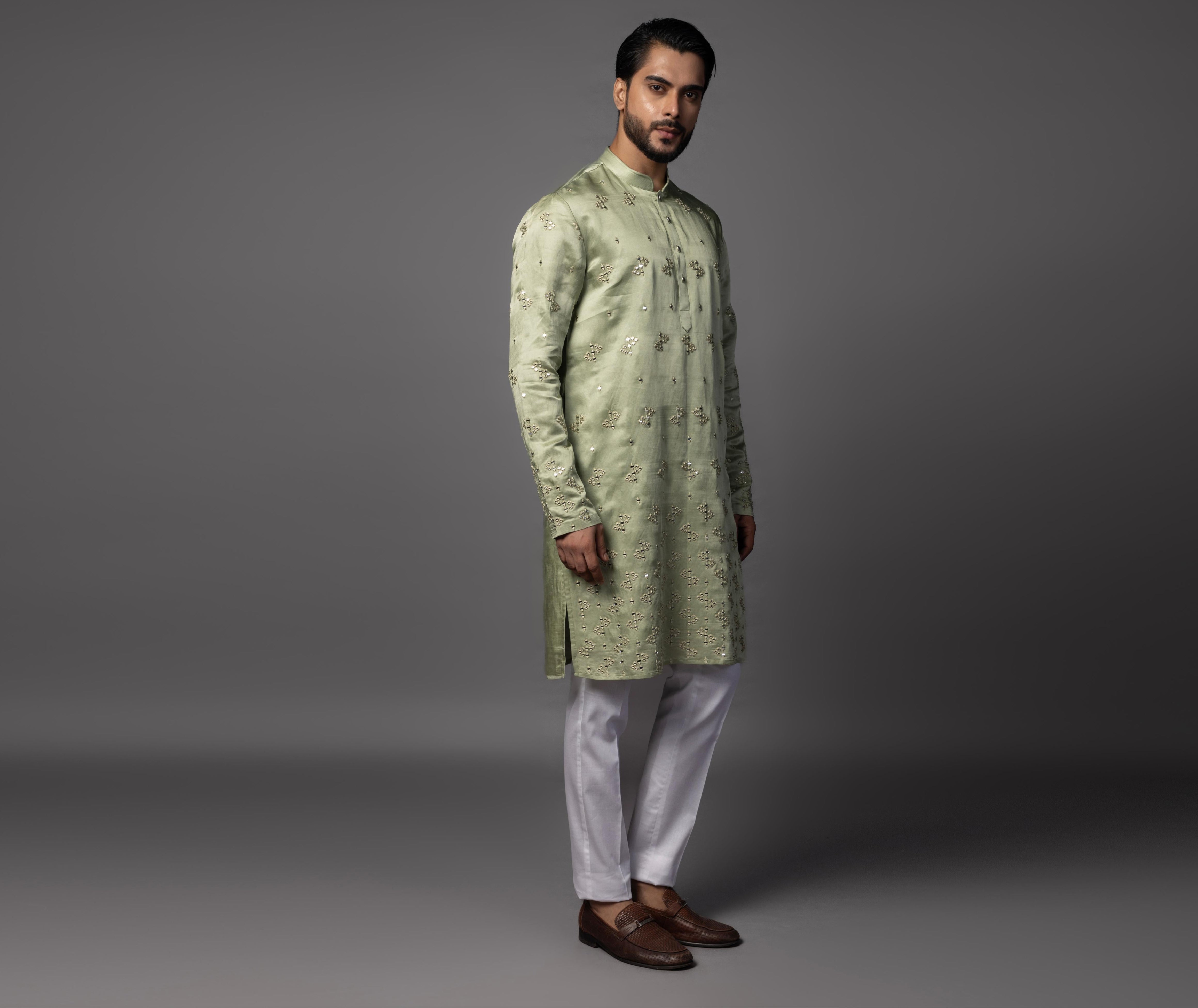 Add a touch of brilliance to your wardrobe with the Green Sparkling Jade Kurta Set, a luxurious ensemble designed to make you shine at every occasion. The rich jade green color, paired with subtle sparkling details, creates a mesmerizing look that is perfect for weddings, festive celebrations, or any event where you want to make a statement.