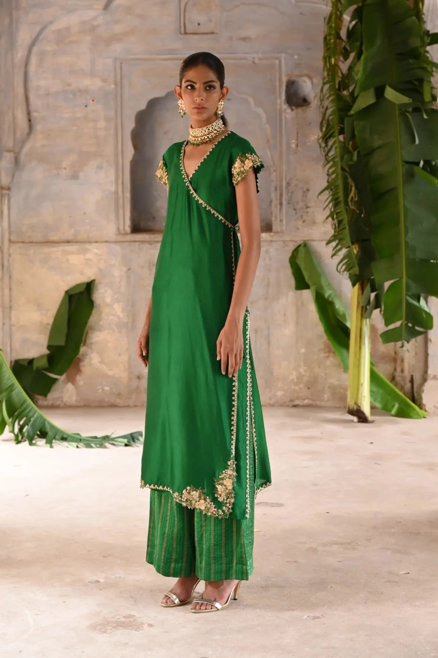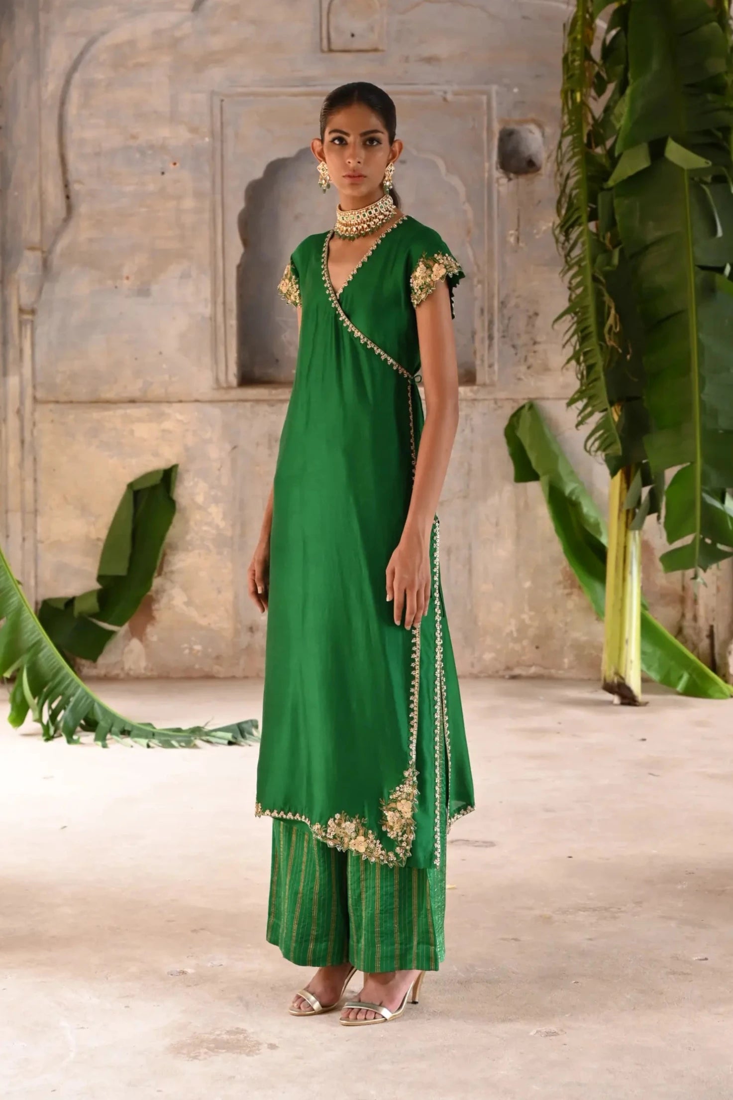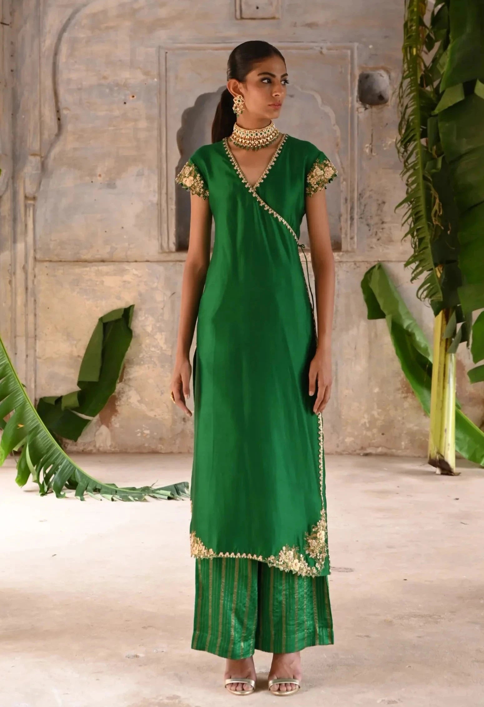 Embrace timeless elegance with our Green Straight Angrakha Set. This beautifully crafted ensemble features a classic straight-cut angrakha design that effortlessly blends tradition with modern style. The rich green hue adds a vibrant touch, making it perfect for festive occasions and special gatherings.