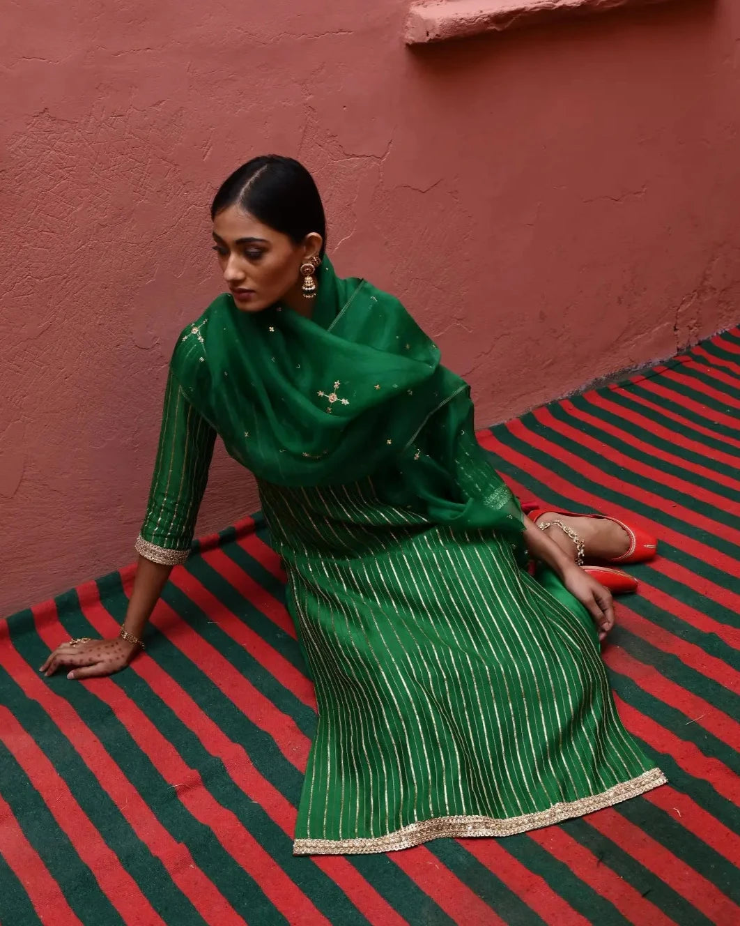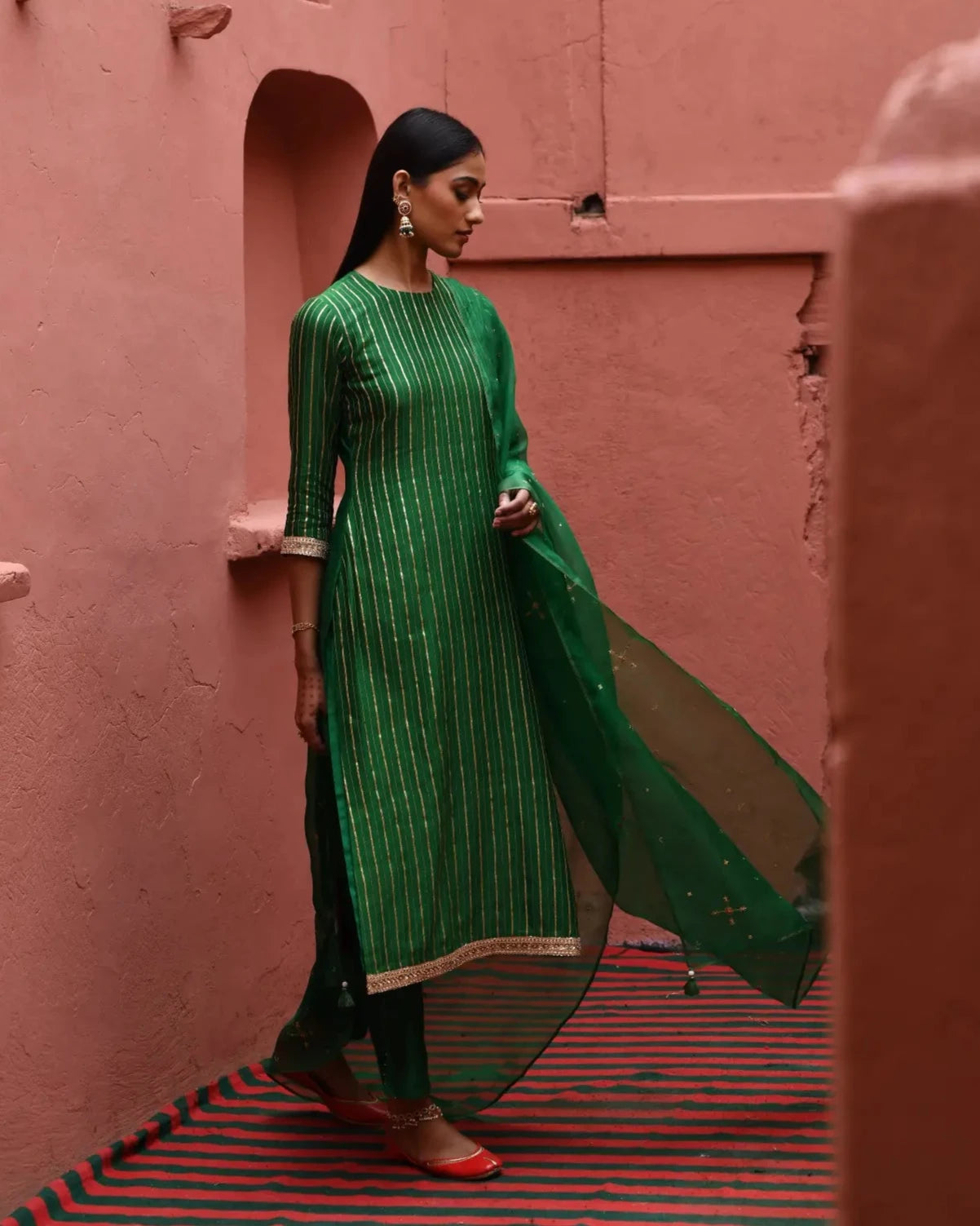 This elegant green straight kurta features striking zari and zardosi pitta embroidered stripes, adding a touch of opulence and sophistication to its design. The clean lines and tailored silhouette make it a versatile piece for various occasions. It is paired with straight pants that ensure a flattering and comfortable fit. Completing the look is a beautiful dupatta adorned with intricate nakshatra embroidery, which adds a delicate and artistic flair. This ensemble effortlessly blends traditional craftsmanship with contemporary style, making it a perfect choice for festive events or special gatherings.