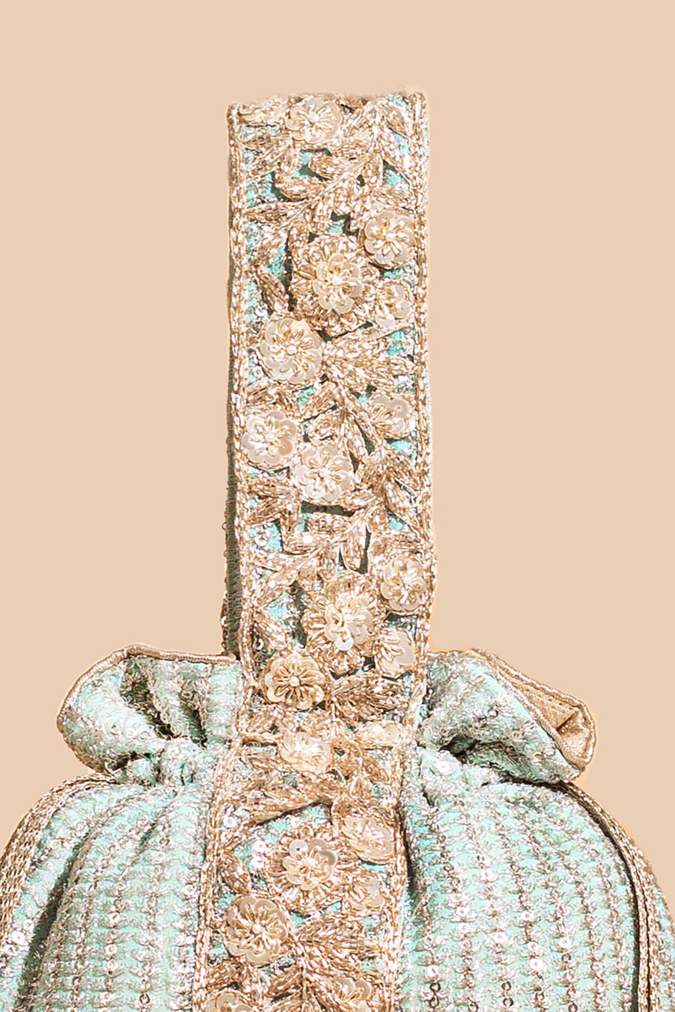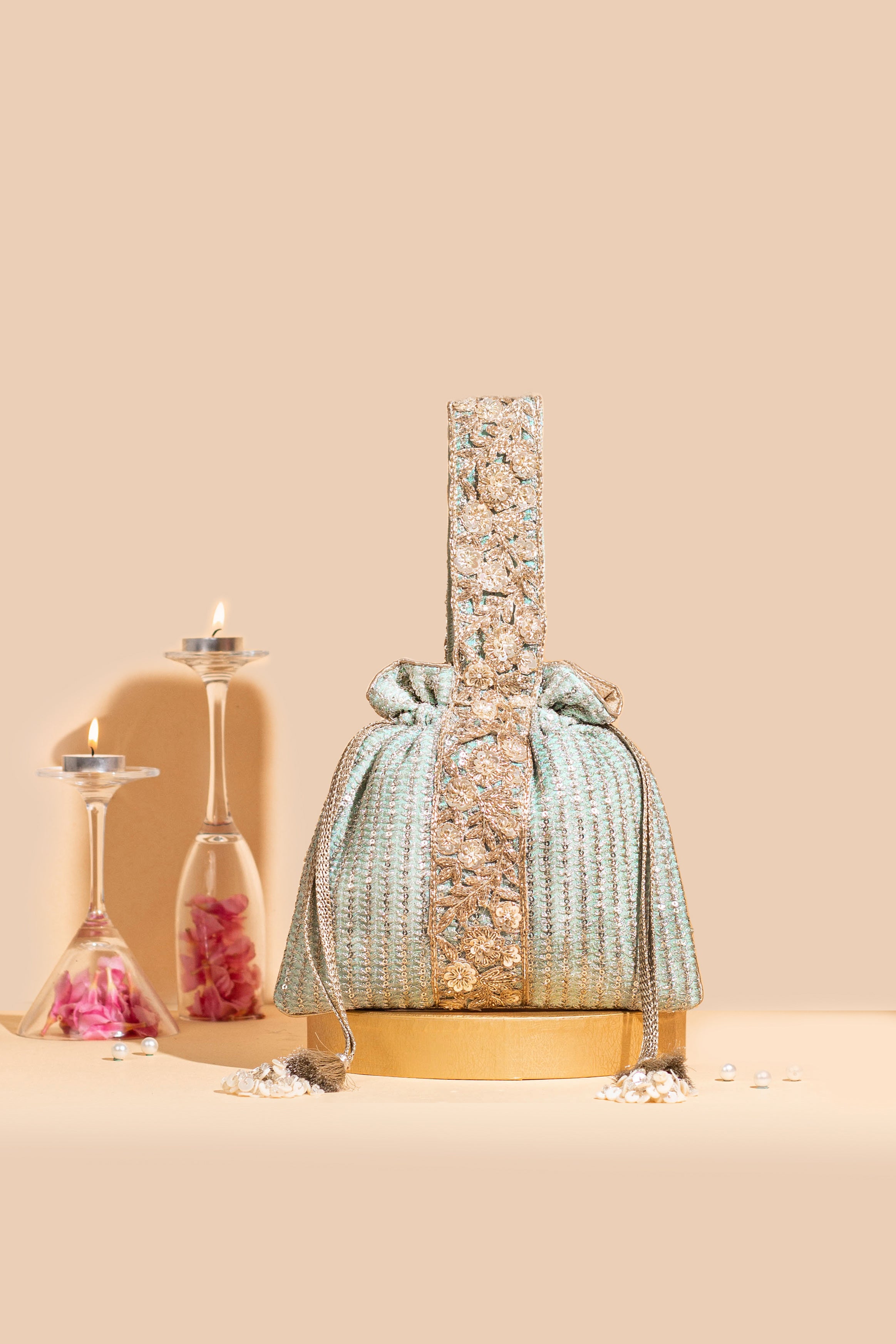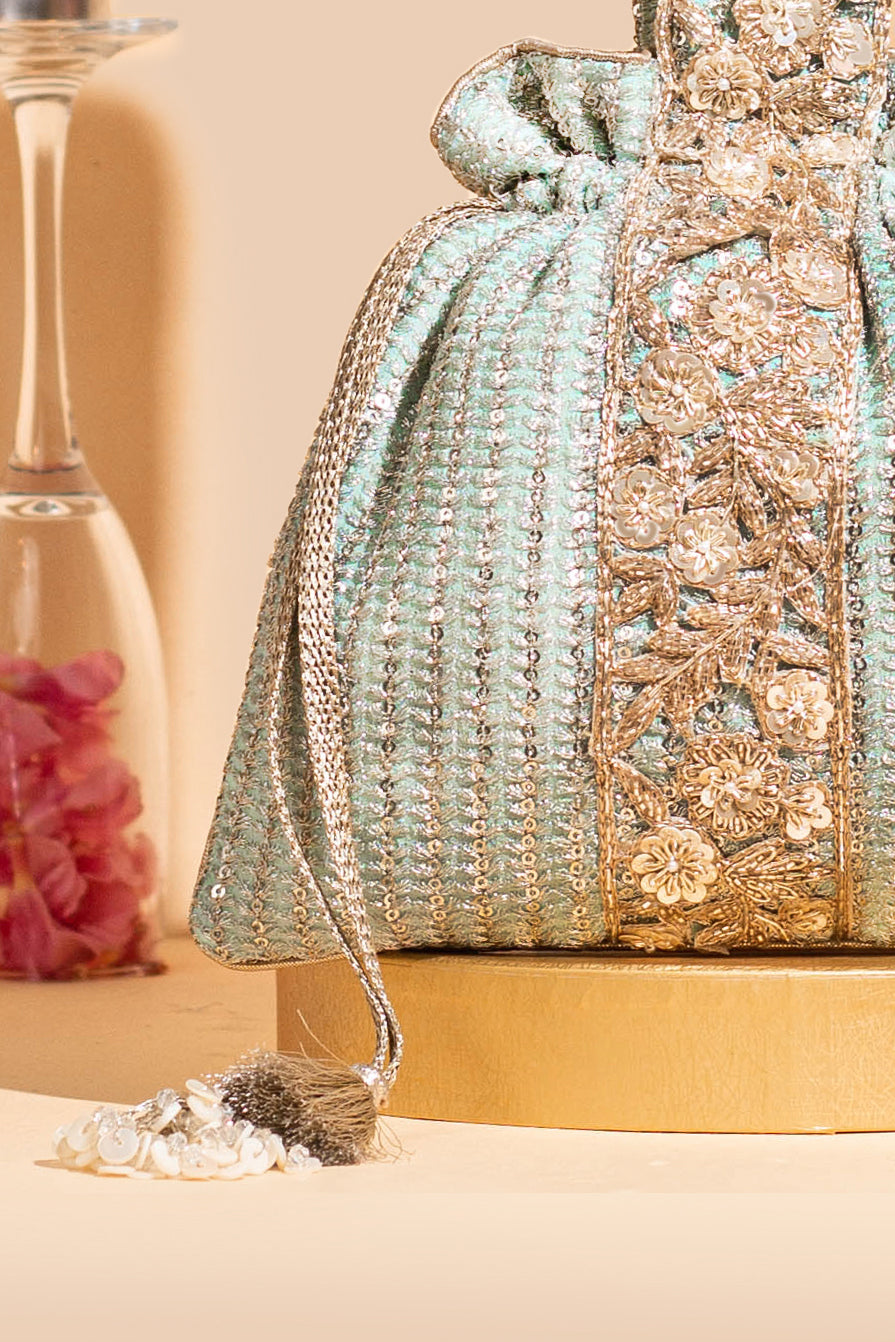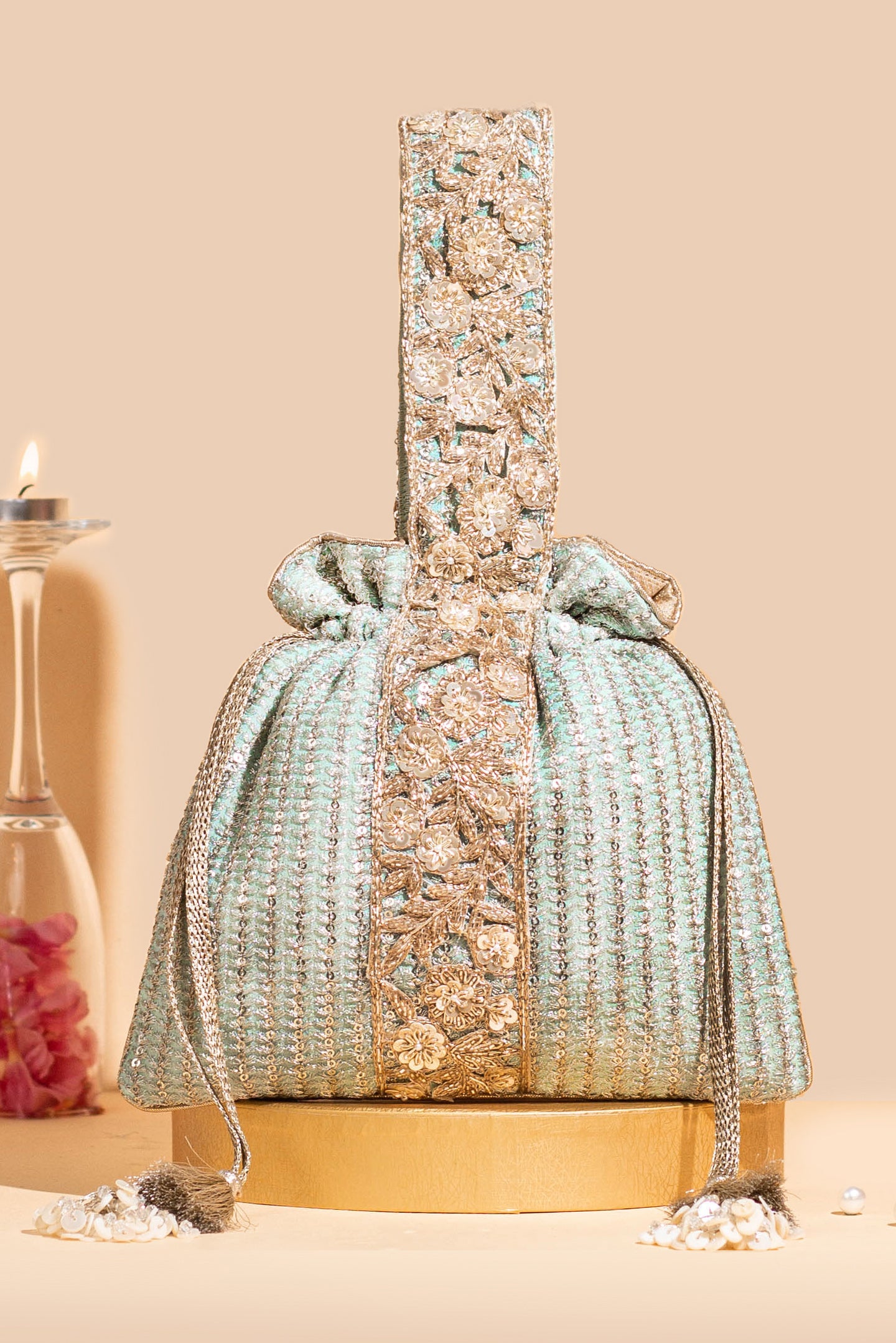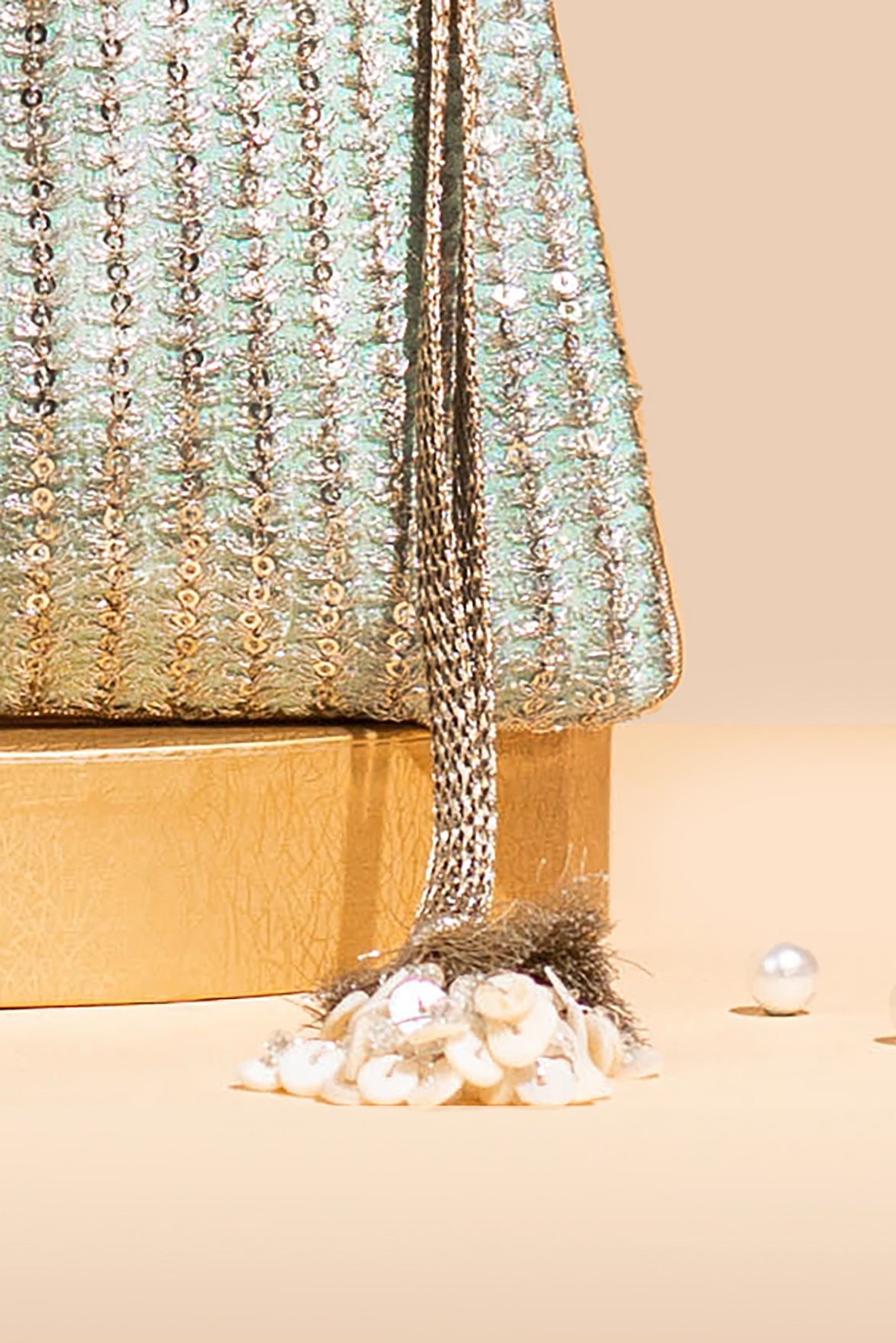 Crafted from embroidered georgette fabric with a poly satin lining, this exquisite clutch features woven golden thread drawstrings and a hand-embroidered zardosi handle. Adorned with elegant gold zari tassels, it adds a touch of sophistication and tradition to any festive or wedding ensemble, making it the perfect accessory for special occasions.