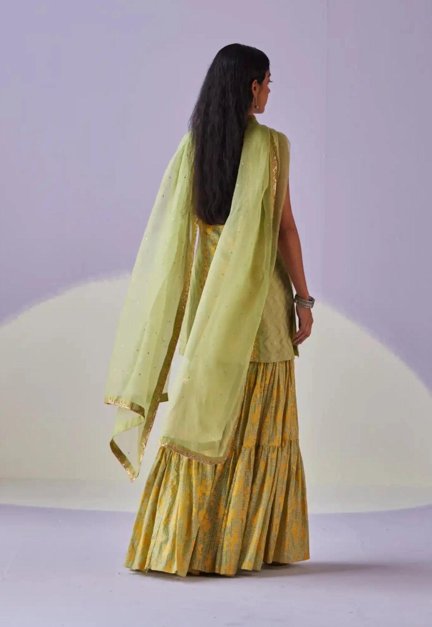 Step into elegance with this green tiered sharara, kurta & dupatta set, designed for those who appreciate a fusion of tradition and modern flair. The kurta features intricate detailing that beautifully complements the voluminous tiered sharara, creating a stunning silhouette that flows gracefully with movement. A lightweight dupatta completes the look, adding an extra layer of sophistication. The rich green hue radiates freshness, making this ensemble perfect for weddings, festive celebrations, or any special occasion where you want to shine.