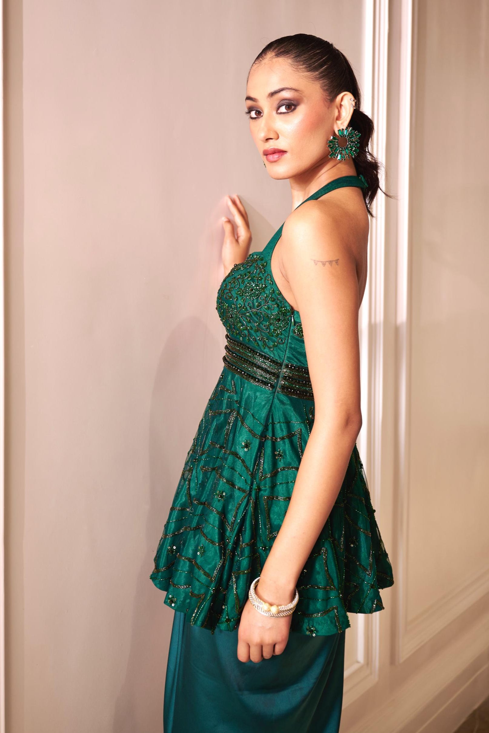 The Green Tira Top and Drape Skirt Set is a chic fusion ensemble that blends traditional craftsmanship with modern flair. Featuring a stylish kurta paired with a fluid drape skirt, this set is perfect for festive gatherings, mehendi functions, and intimate celebrations. The vibrant green hue and effortless silhouette make it a standout choice for those who love easy elegance with a contemporary twist.