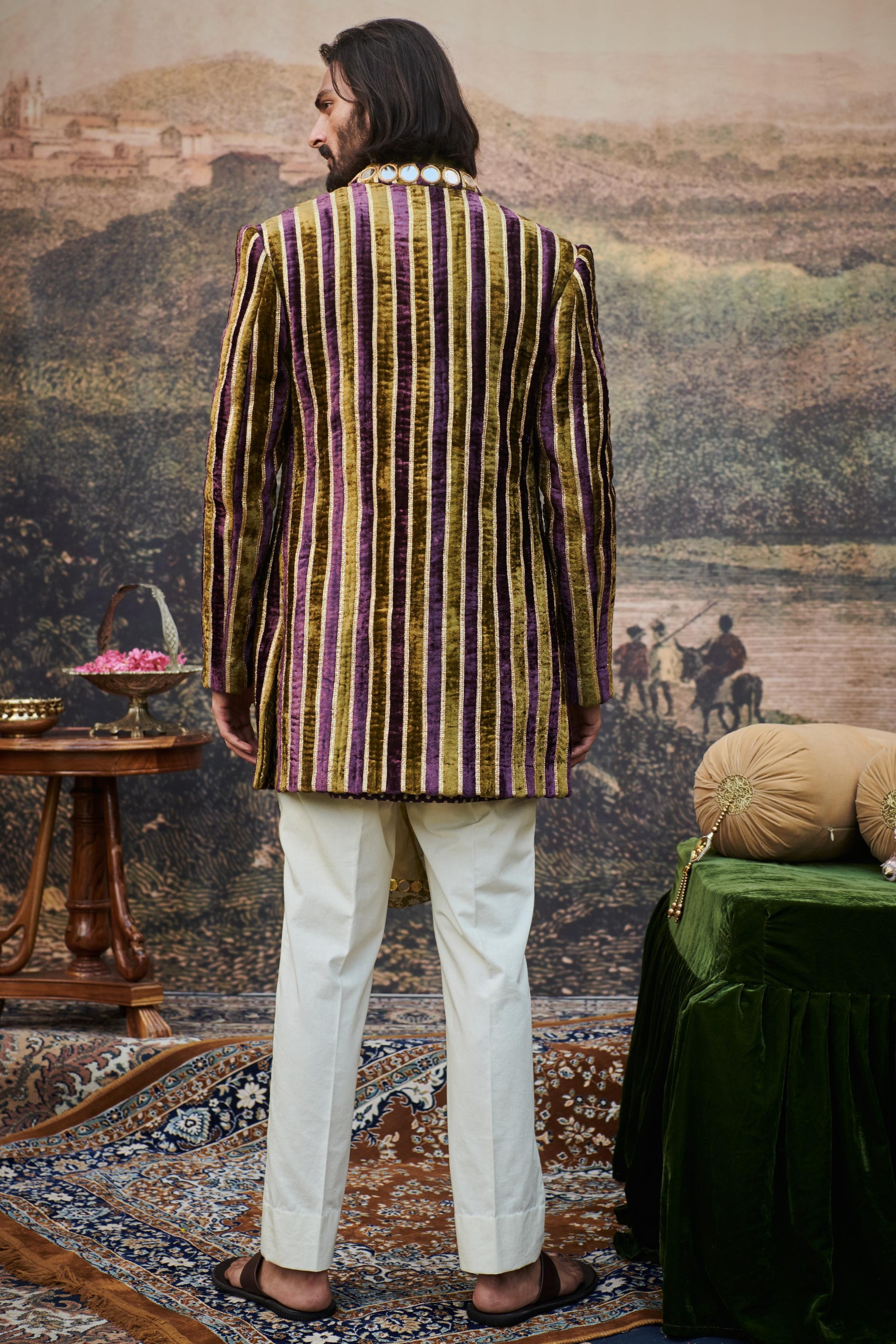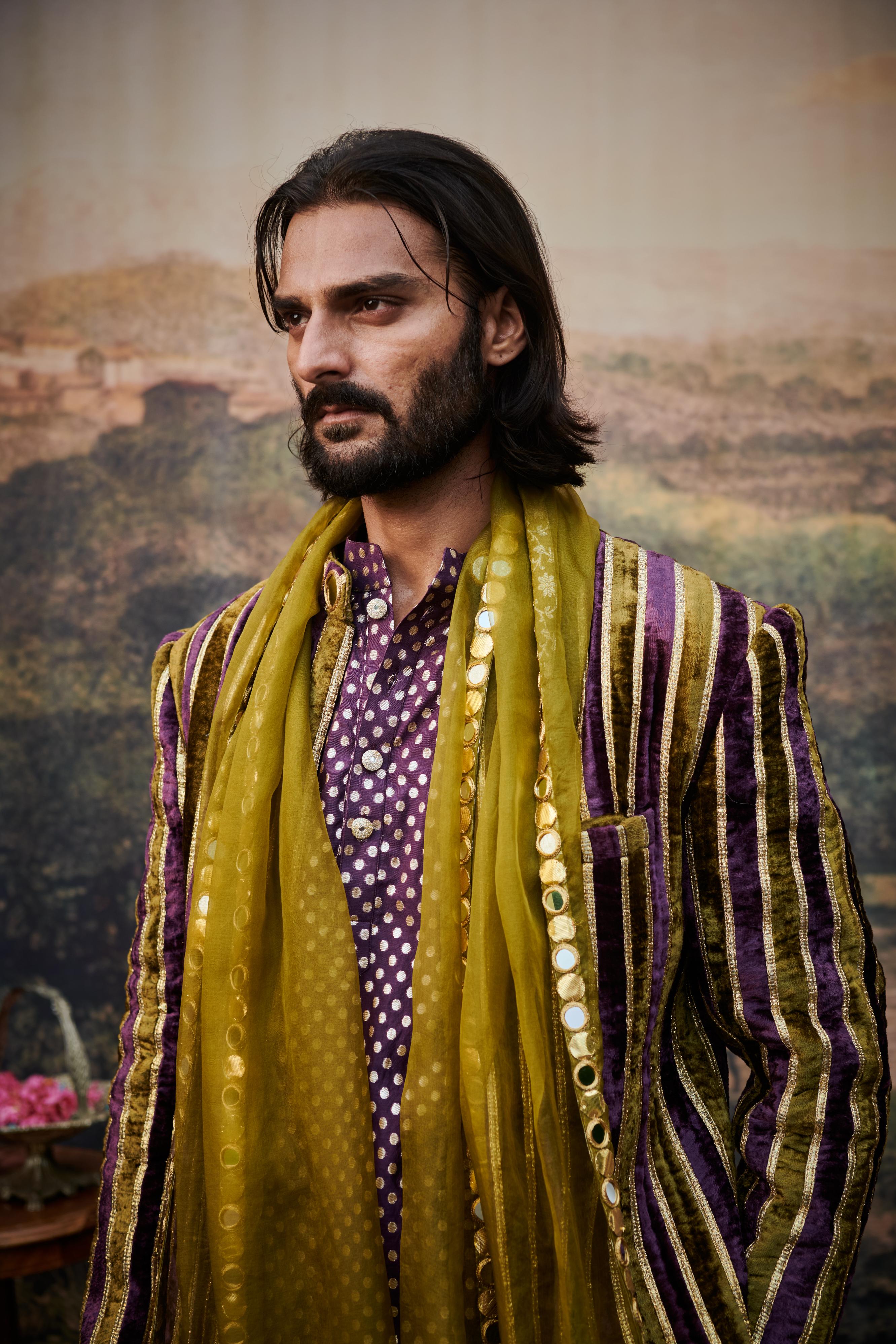 An olive and purple velvet jacket adorned with elegant gota stripes takes center stage paired with a purple chanderi kurta and crisp white pants. Completing the look is a sophisticated stole making this ensemble a refined choice for festive gatherings and special occasions.