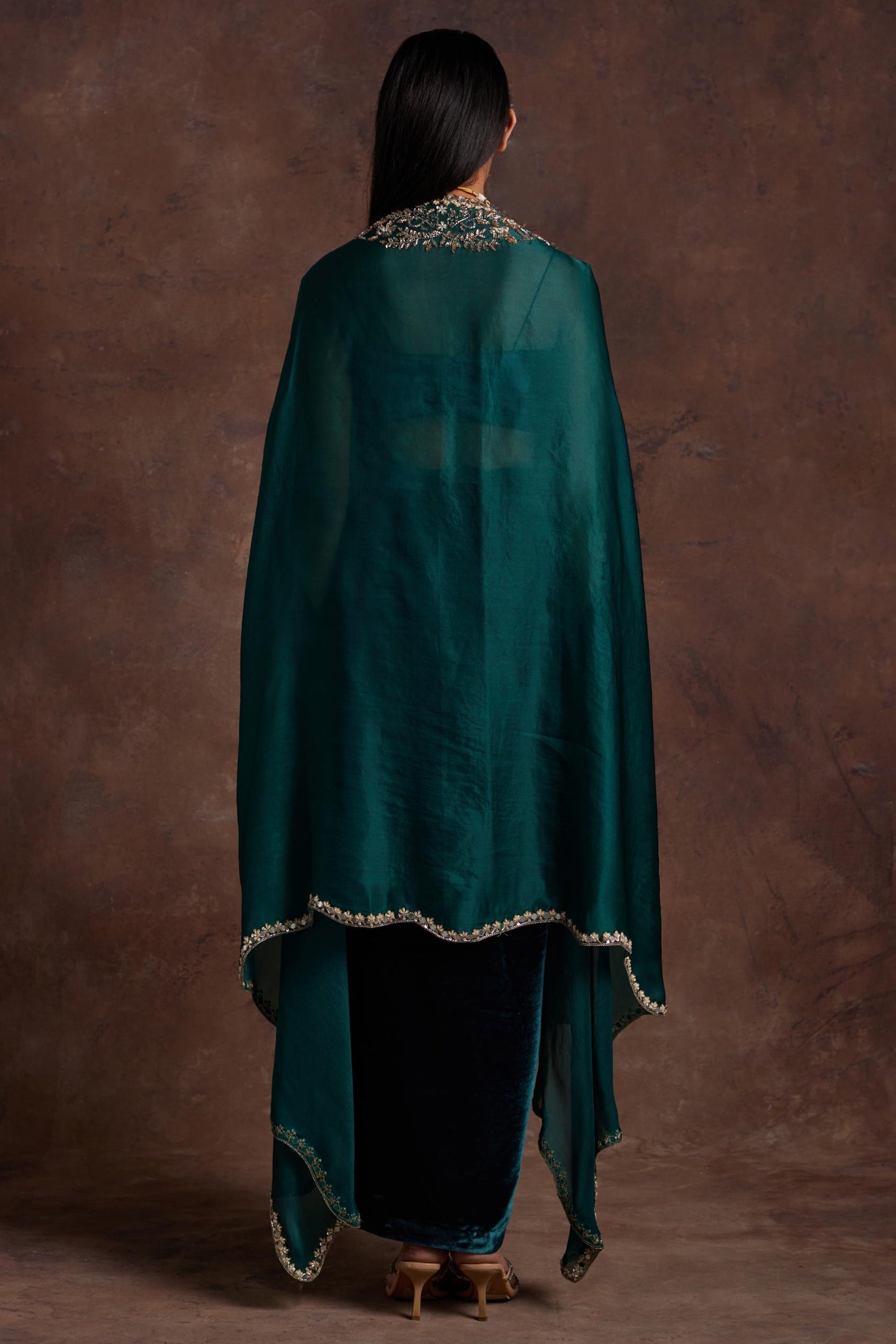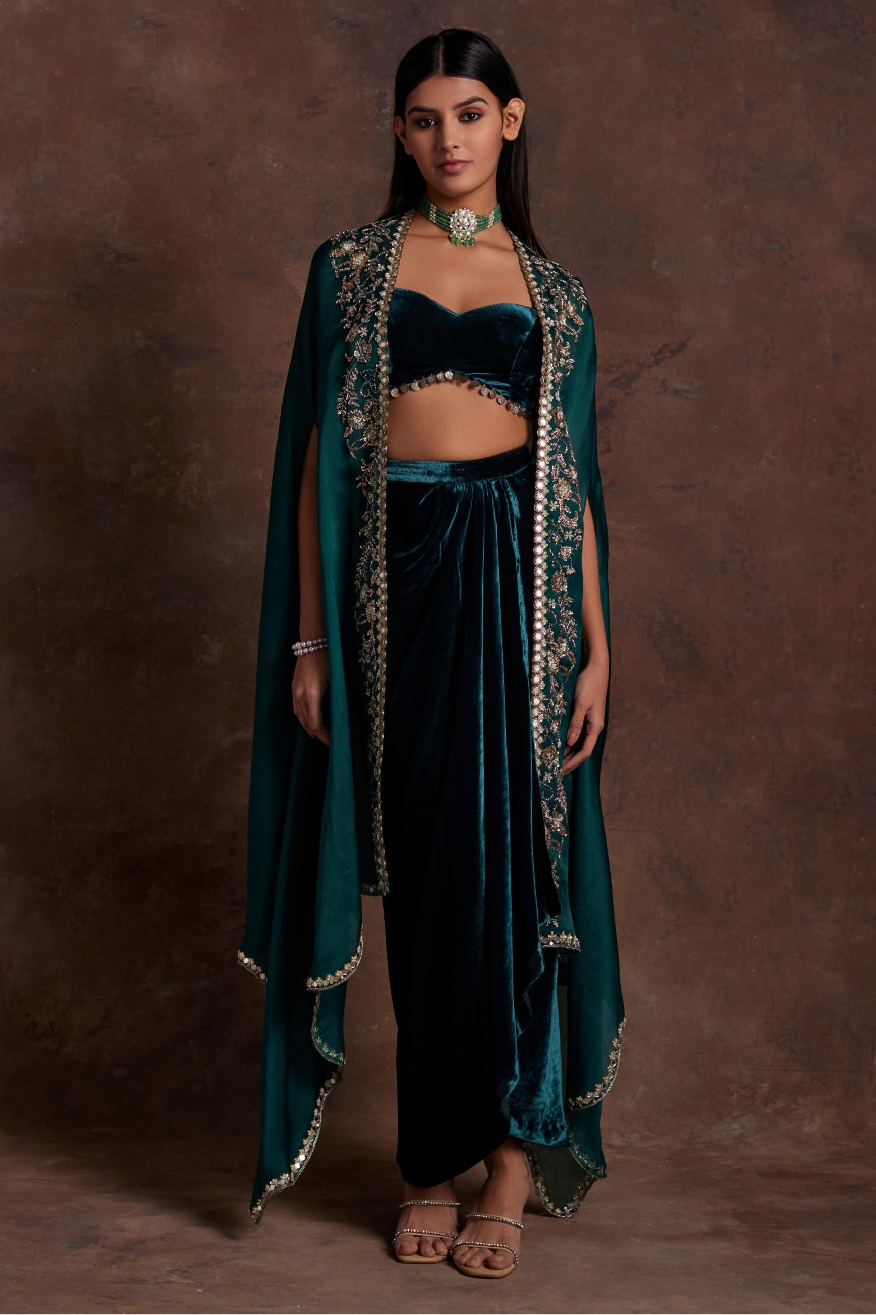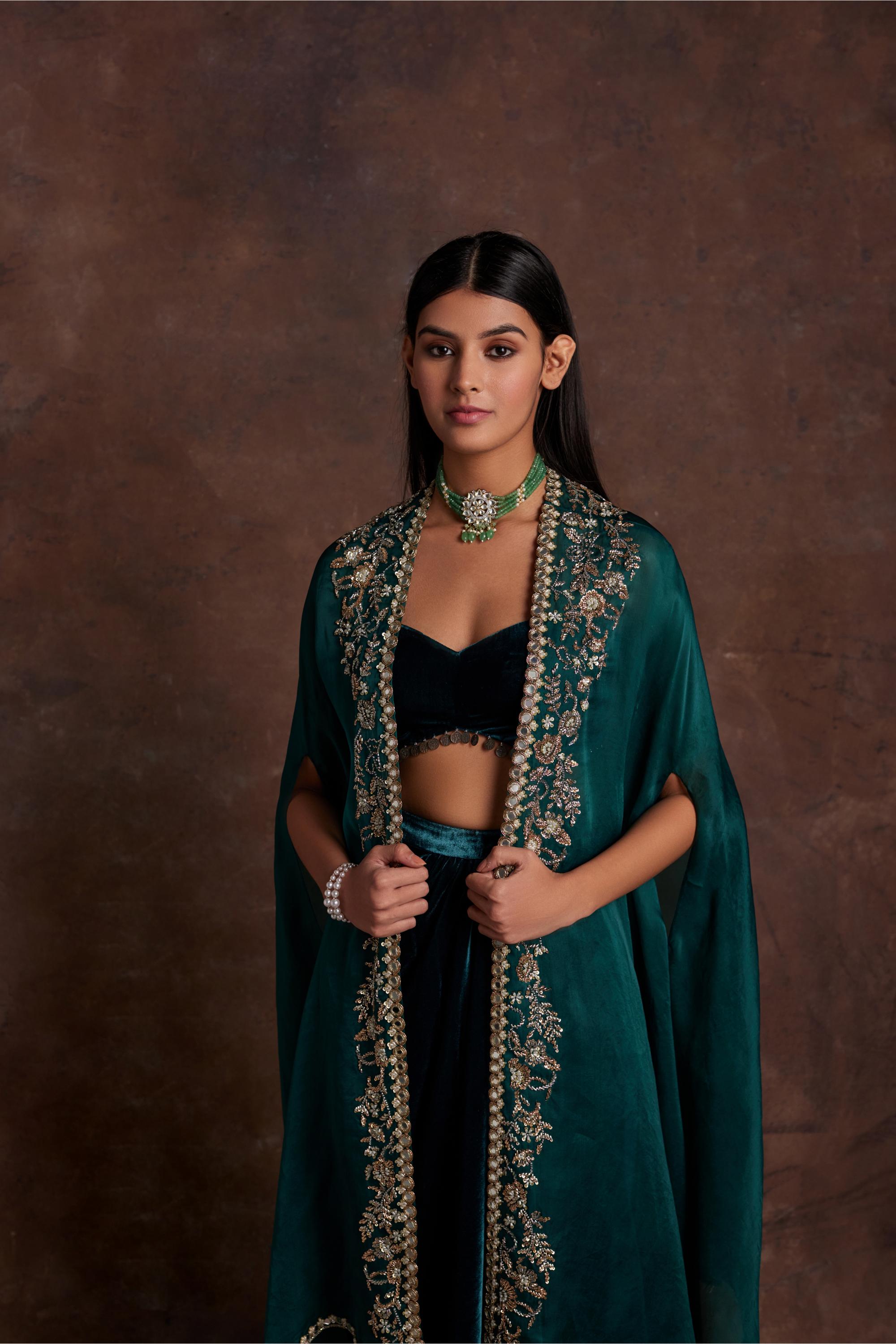 Turn heads in this green velvet drape skirt and bustier, featuring unique coin hangings at the hem for a bold touch. Paired with an ethereal organza cape adorned with intricate hand embroidery along the front and hem, this ensemble is a perfect blend of contemporary style and traditional craftsmanship, ideal for festive celebrations and special events.