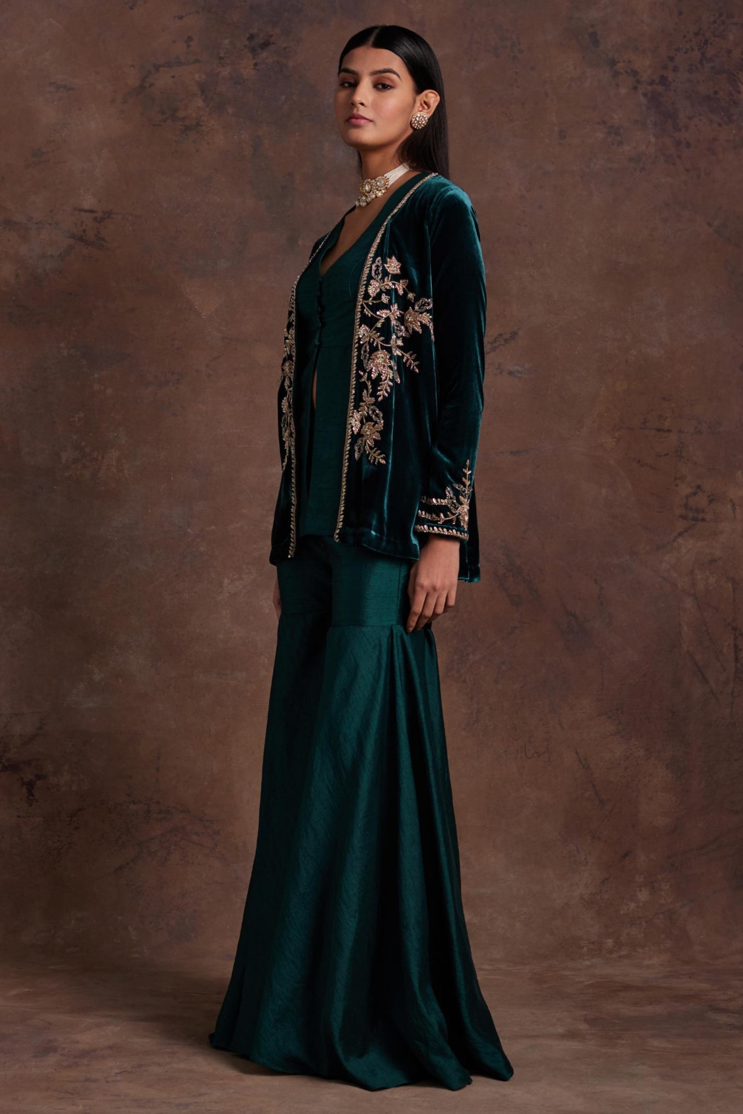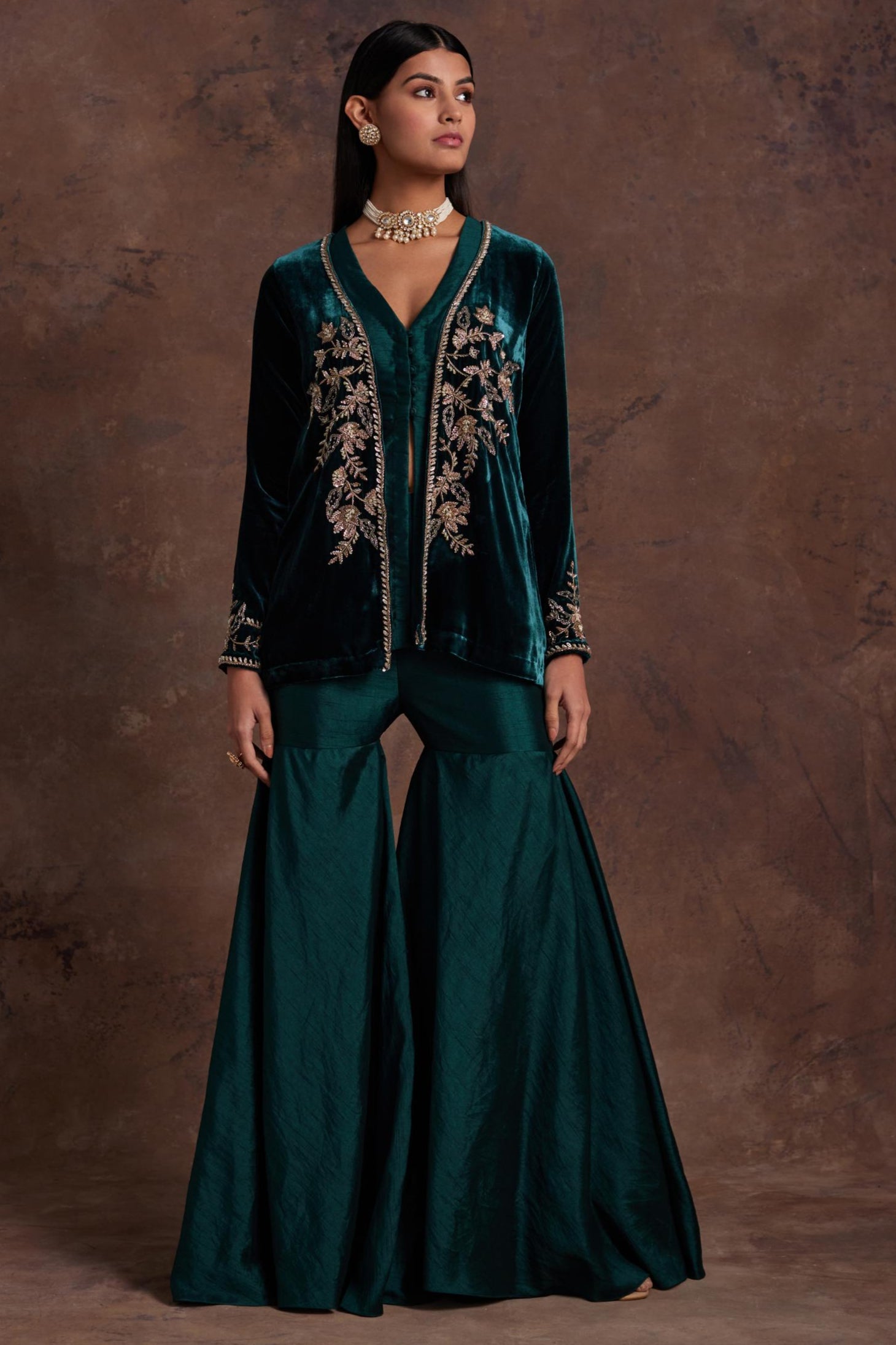 Green velvet jacket with silk peplum and sharara set