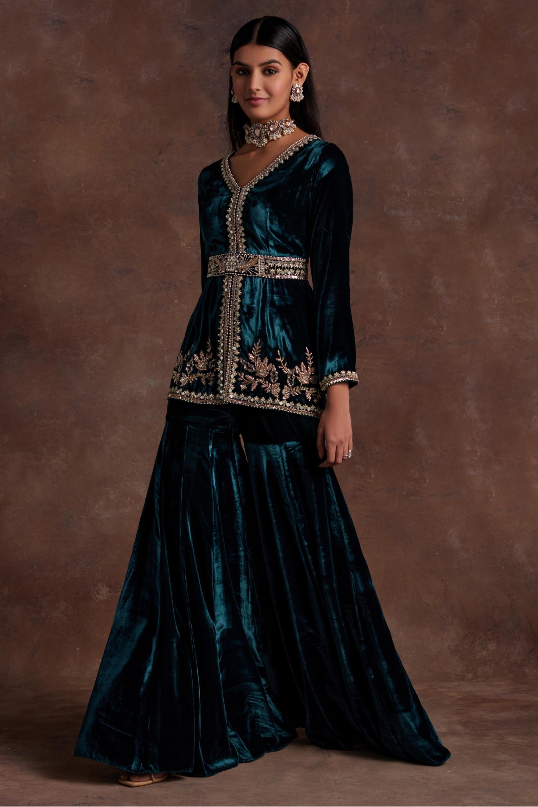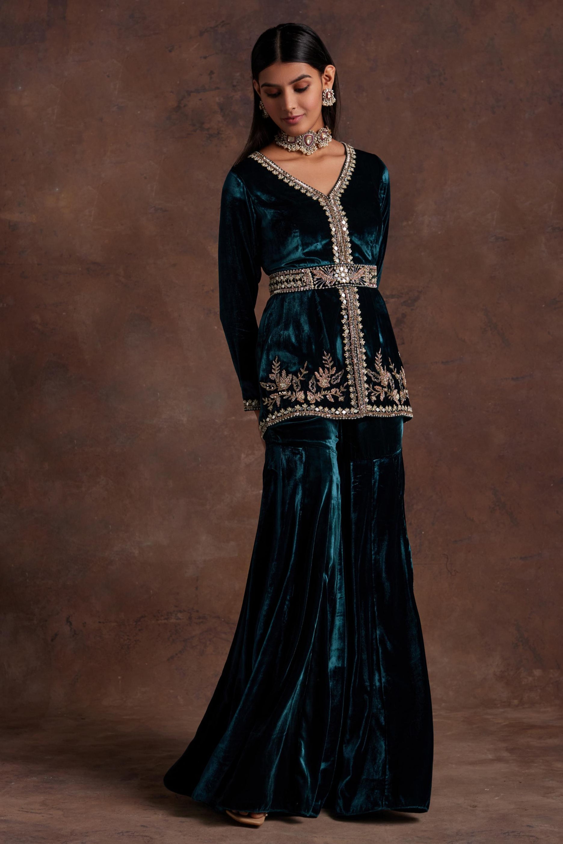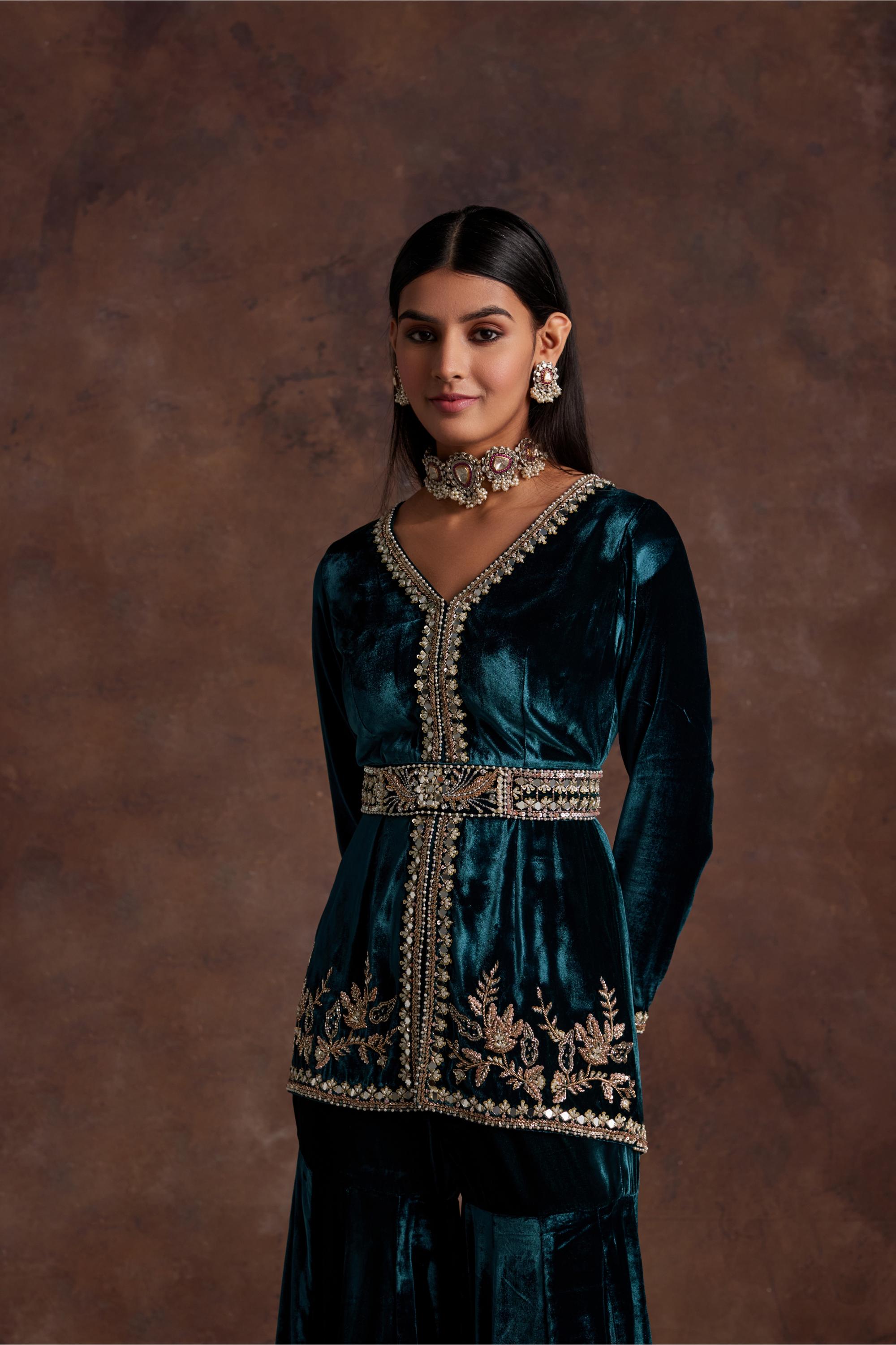 Elevate your style with this luxurious green silk velvet peplum, adorned with intricate hand embroidery at the neckline, center front, and hem. Complemented by a matching hand-embroidered belt and elegant sharara pants, this ensemble is perfect for festive celebrations or wedding soirŽes. Its timeless craftsmanship and regal appeal make it a standout choice for any special occasion.