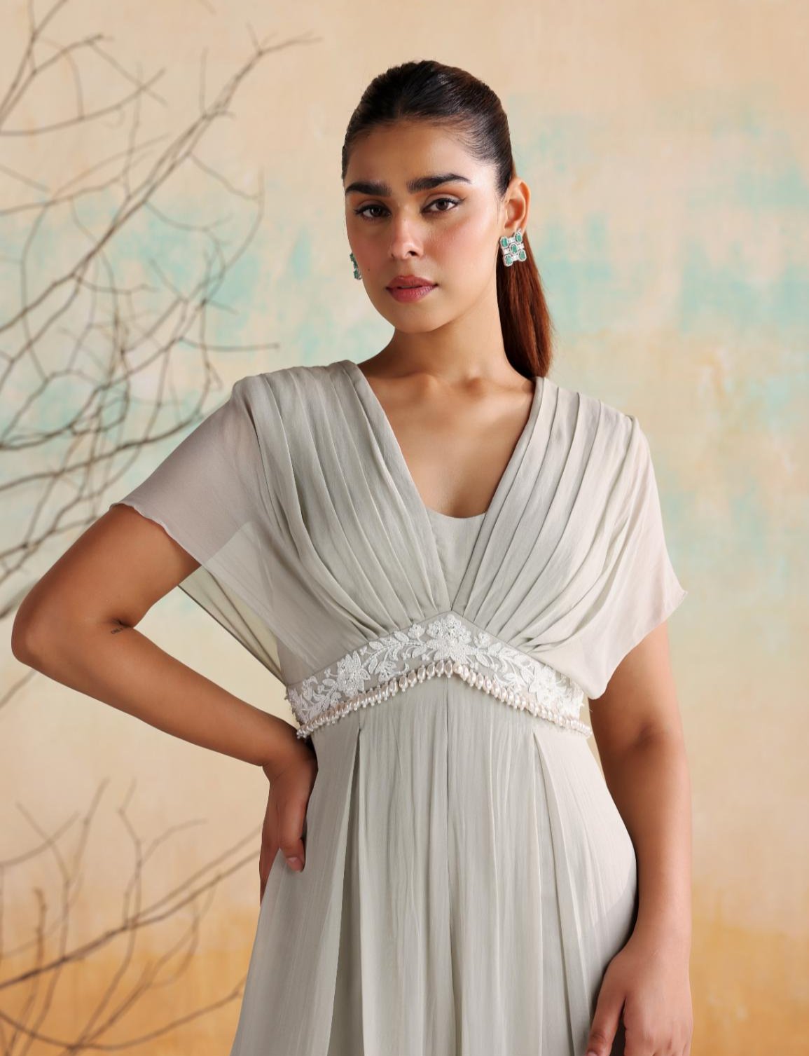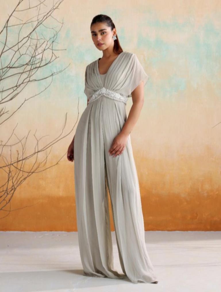 Discover effortless elegance with our draped pleated jumpsuit, accentuated by a stunning embellished belt. The jumpsuit's graceful draping and sophisticated pleats create a fluid silhouette that exudes both style and comfort. The embellished belt cinches the waist, adding a touch of glamour and defining your figure. Perfect for formal events or upscale gatherings, this jumpsuit combines contemporary design with classic refinement, ensuring a chic and memorable presence.
