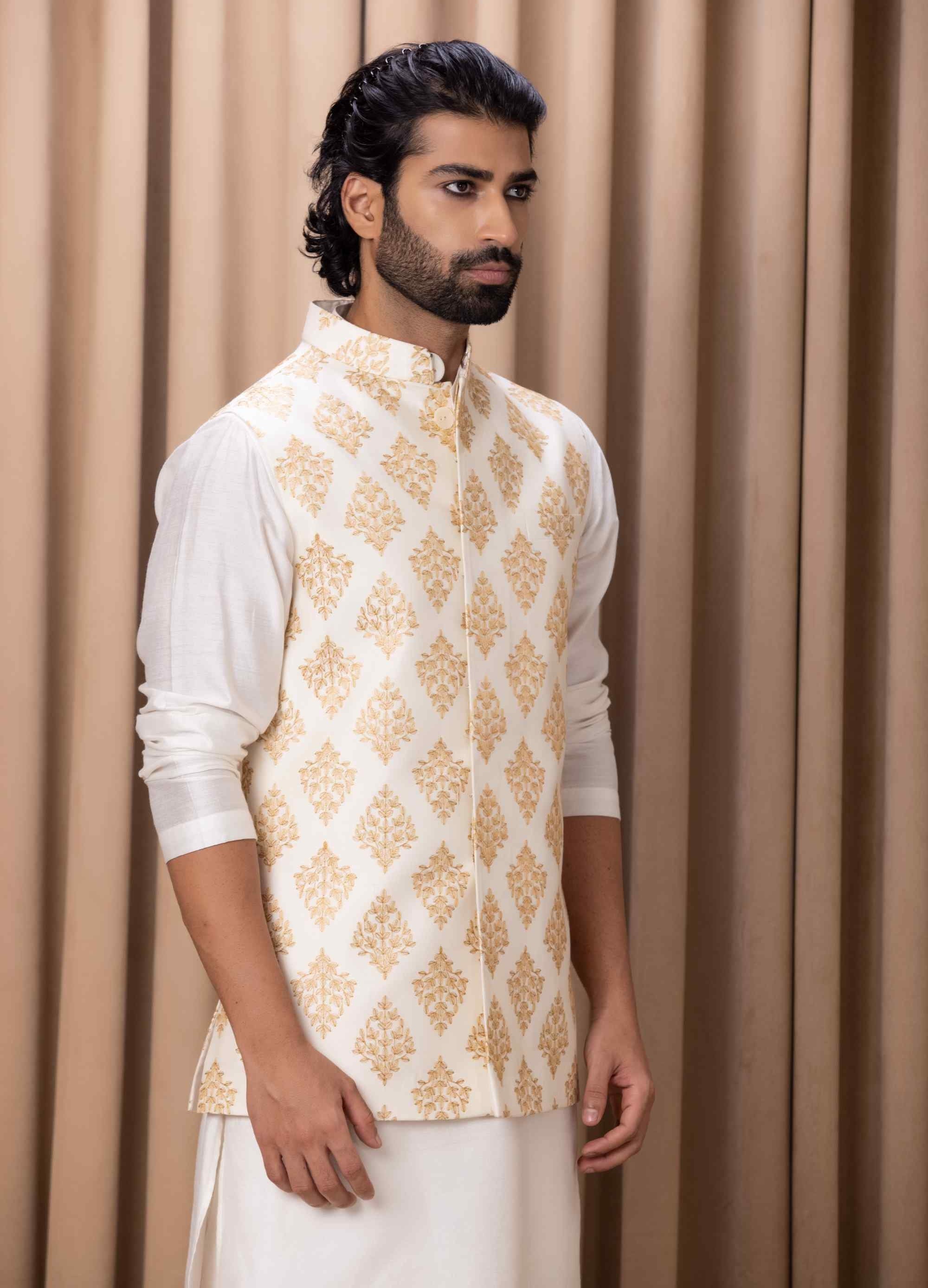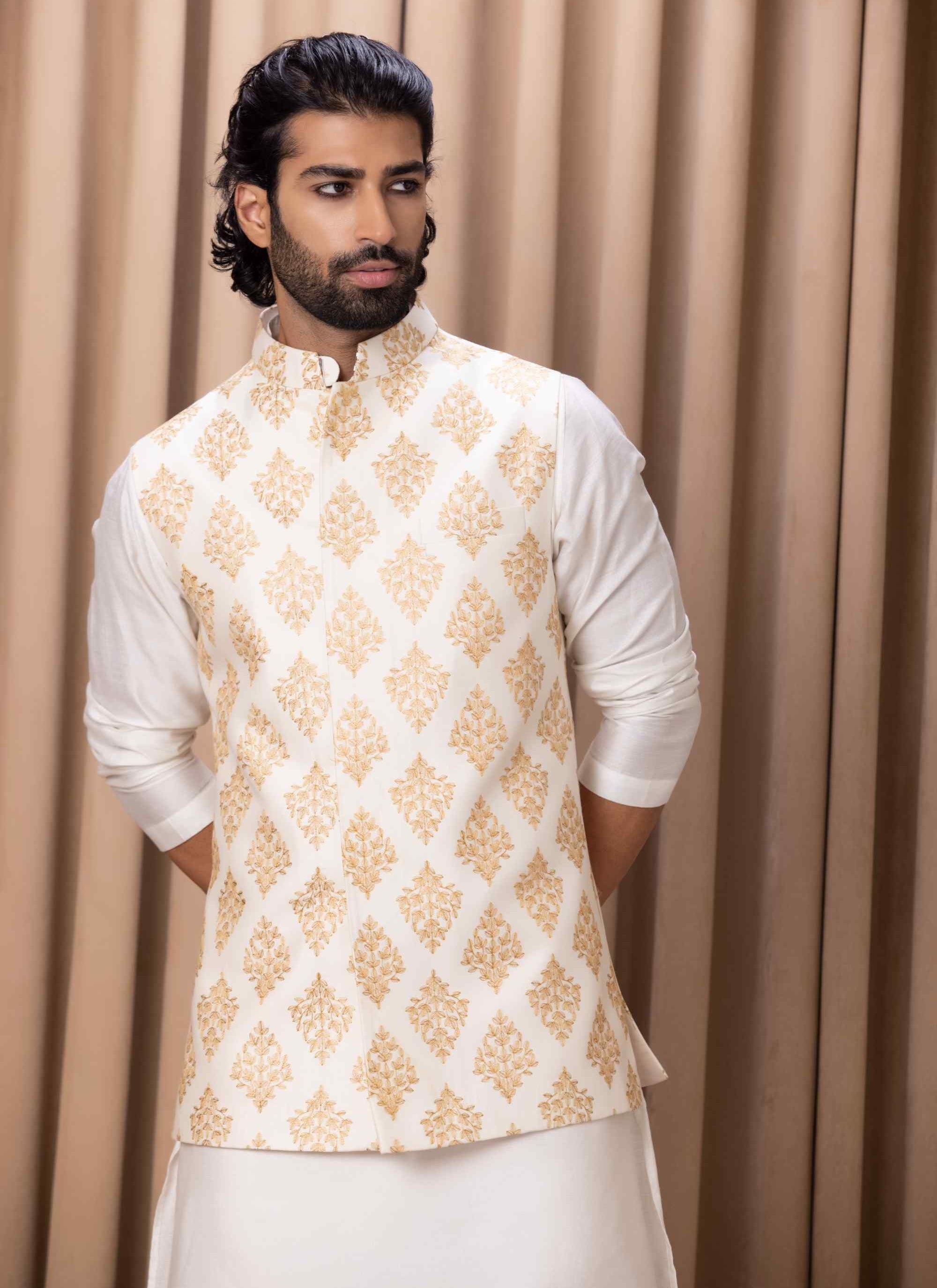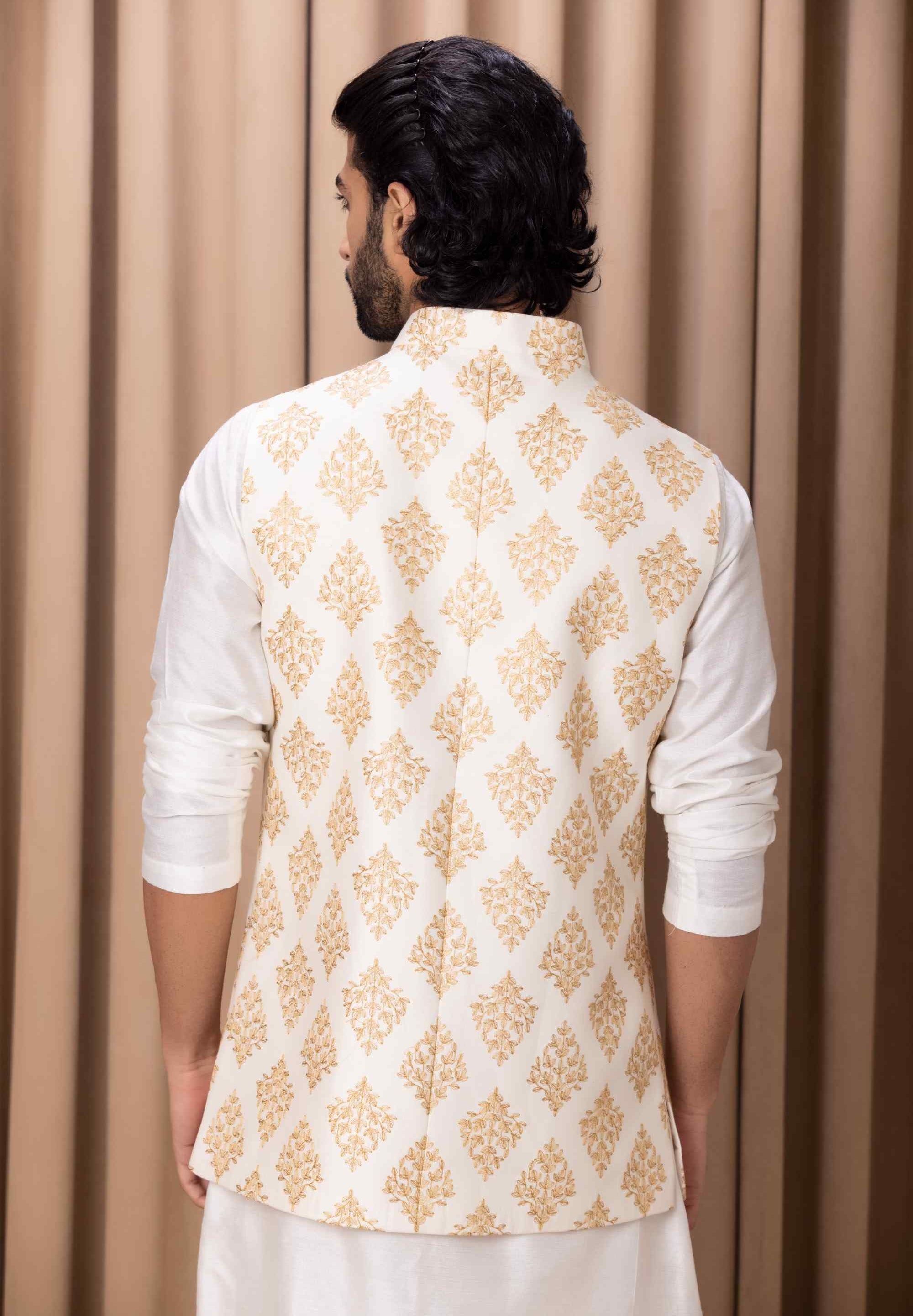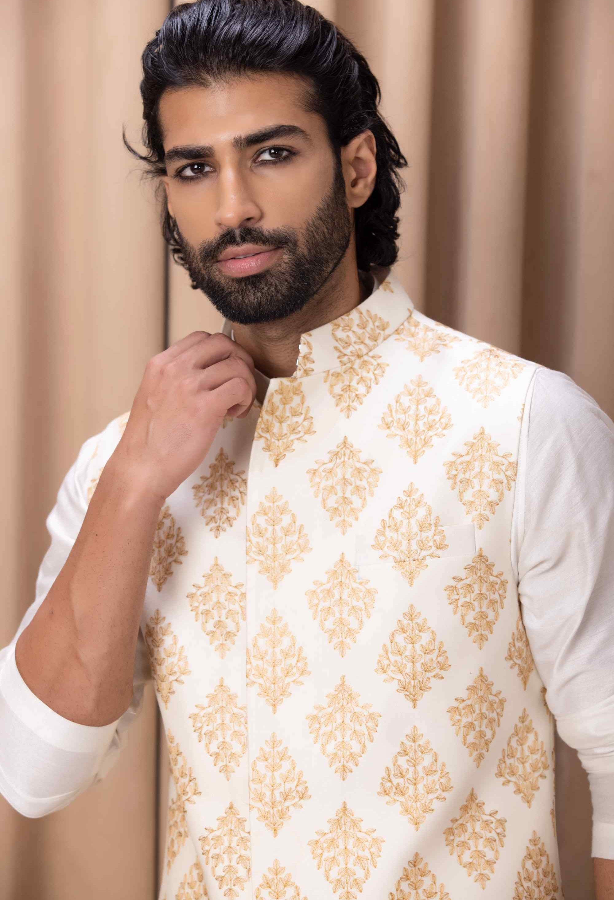 Elevate your style with our bespoke ivory nehru jacket, crafted from luxurious cotton silk and adorned with intricate machine embroidery. The minimalistic design enhances its sophisticated charm, making it perfect for both indoor and outdoor occasions. Paired with Ankit V Kapoor's coordinating ivory kurta set, this ensemble offers a seamless and refined look. Ideal for the modern groom or groomsmen who value elegance and understated luxury, this outfit ensures a distinguished presence at any special event.
