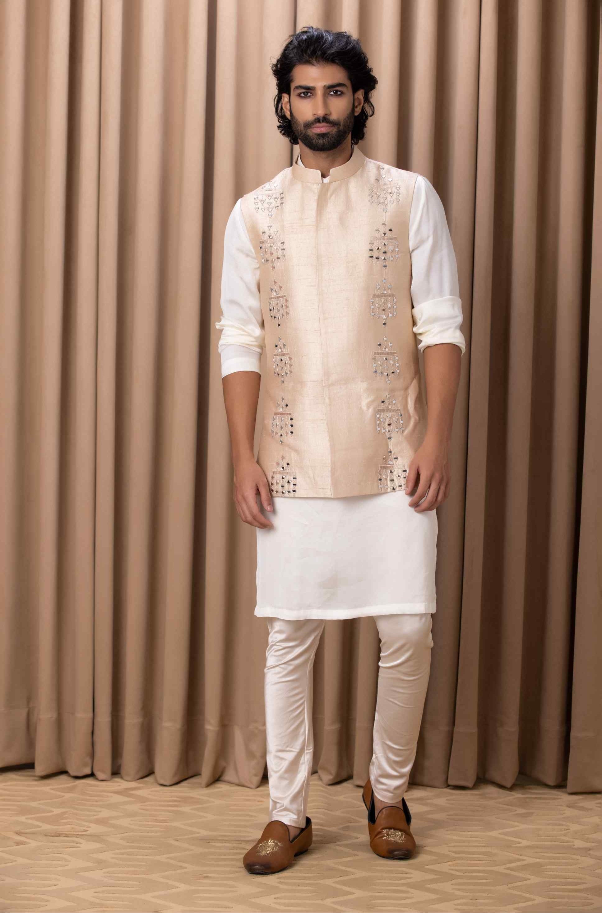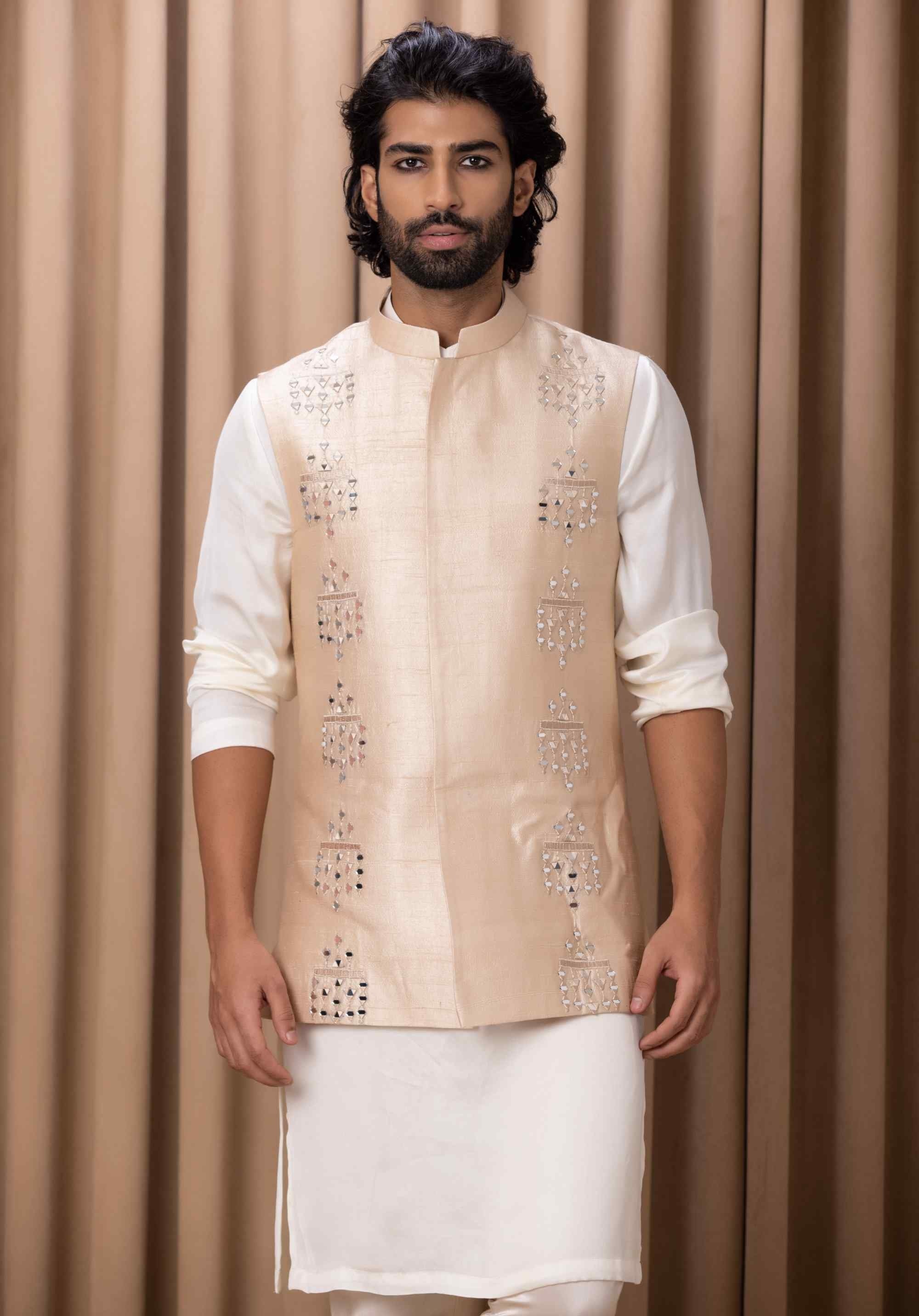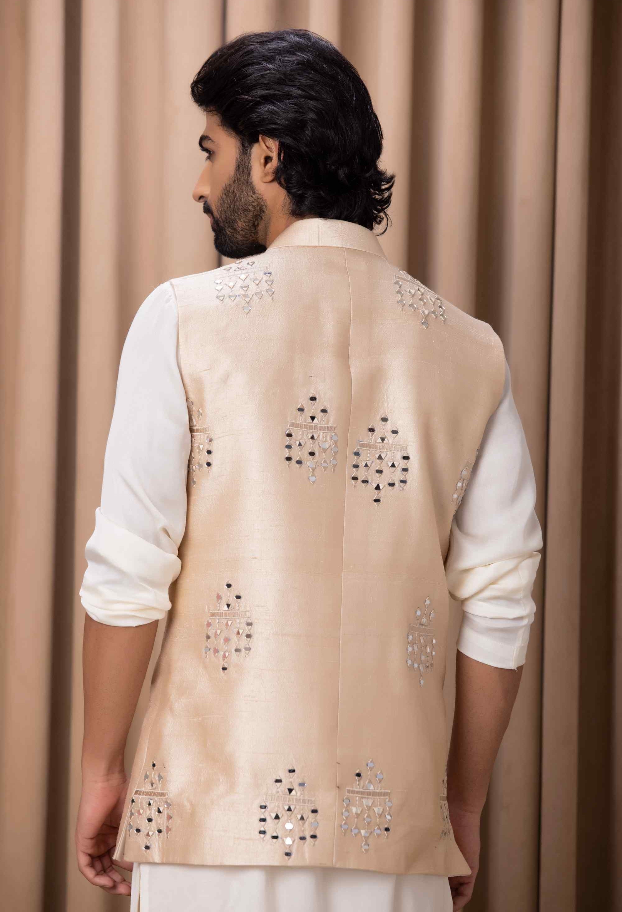 Experience unmatched elegance with our original hand-embroidered mirror nehru jacket, crafted with intricate details and an elegant design. This uber-classy jacket is perfect for both indoor and outdoor occasions, seamlessly blending traditional craftsmanship with contemporary sophistication. Paired with Ankit V Kapoor's ivory kurta set, it creates a refined and polished look. Ideal for the discerning groom or groomsmen, this ensemble ensures a memorable and distinguished appearance at any special event.