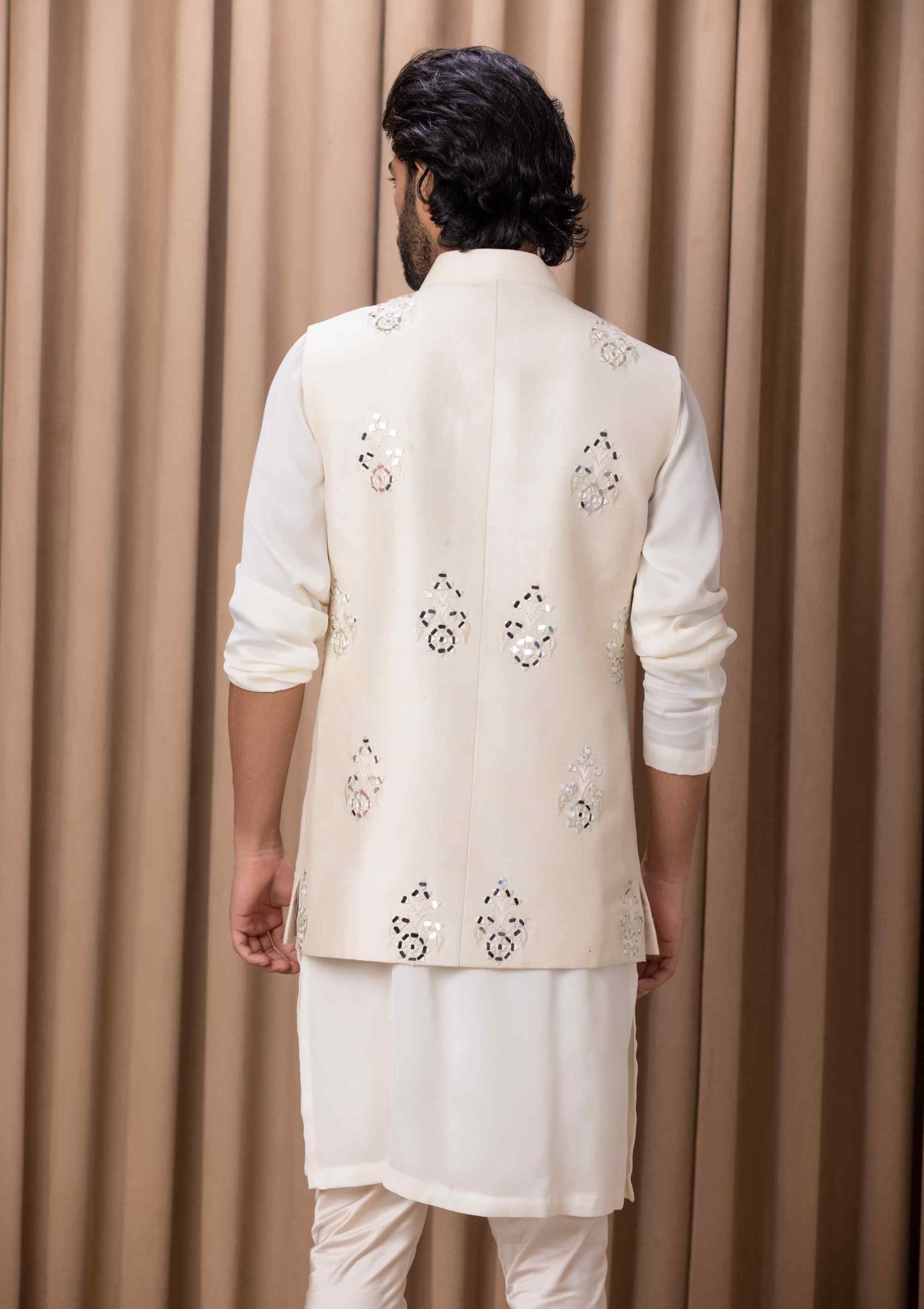 Unveil timeless sophistication with our original hand-embroidered mirror nehru jacket, a masterpiece of elegant design and intricate detailing. This uber-classy jacket is versatile enough for any indoor or outdoor occasion, seamlessly marrying traditional craftsmanship with modern flair. It comes paired with Ankit V Kapoor's ivory kurta set, ensuring a cohesive and distinguished look. Perfect for the groom or groomsmen who appreciate a touch of opulence and refinement, this ensemble guarantees a standout presence at any special event.