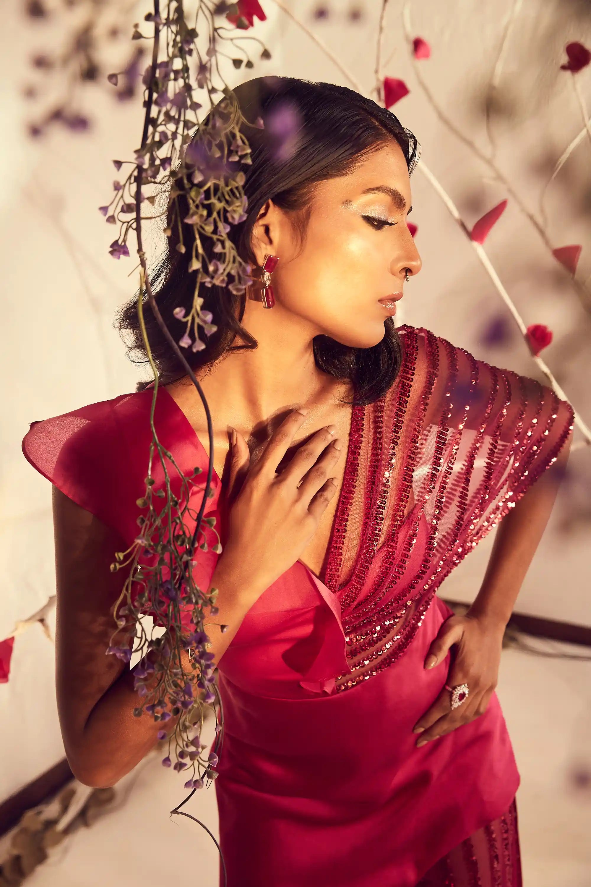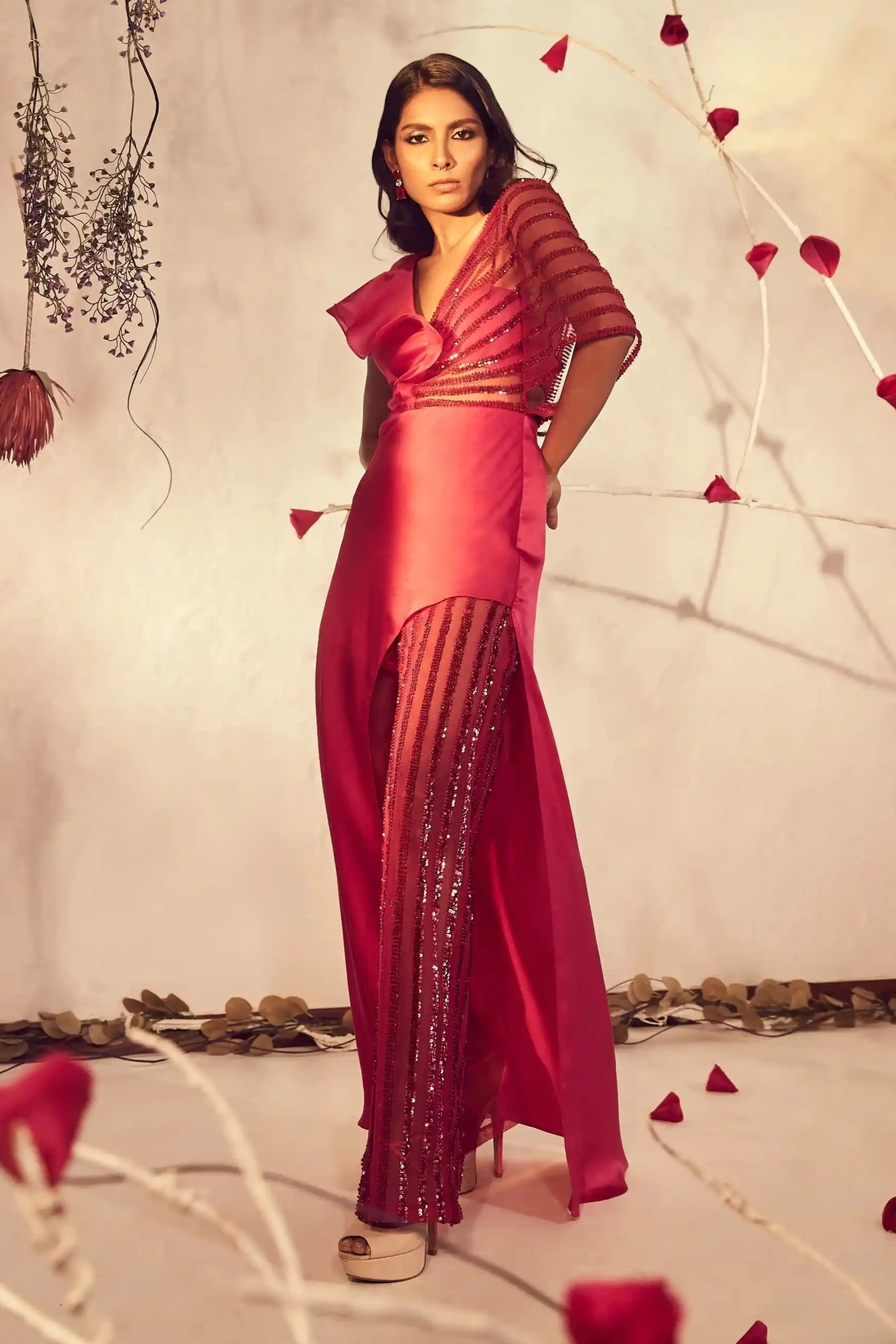 Elevate your style with this vibrant hibiscus-colored jumpsuit, featuring exquisite crystal embroidery on tulle adorned with striking stripe beads. The ruffled neckline adds a touch of femininity and flair, creating a captivating silhouette. Perfect for evening events or special occasions, this jumpsuit seamlessly blends bold color with elegant detailing, ensuring you stand out with confidence and grace.