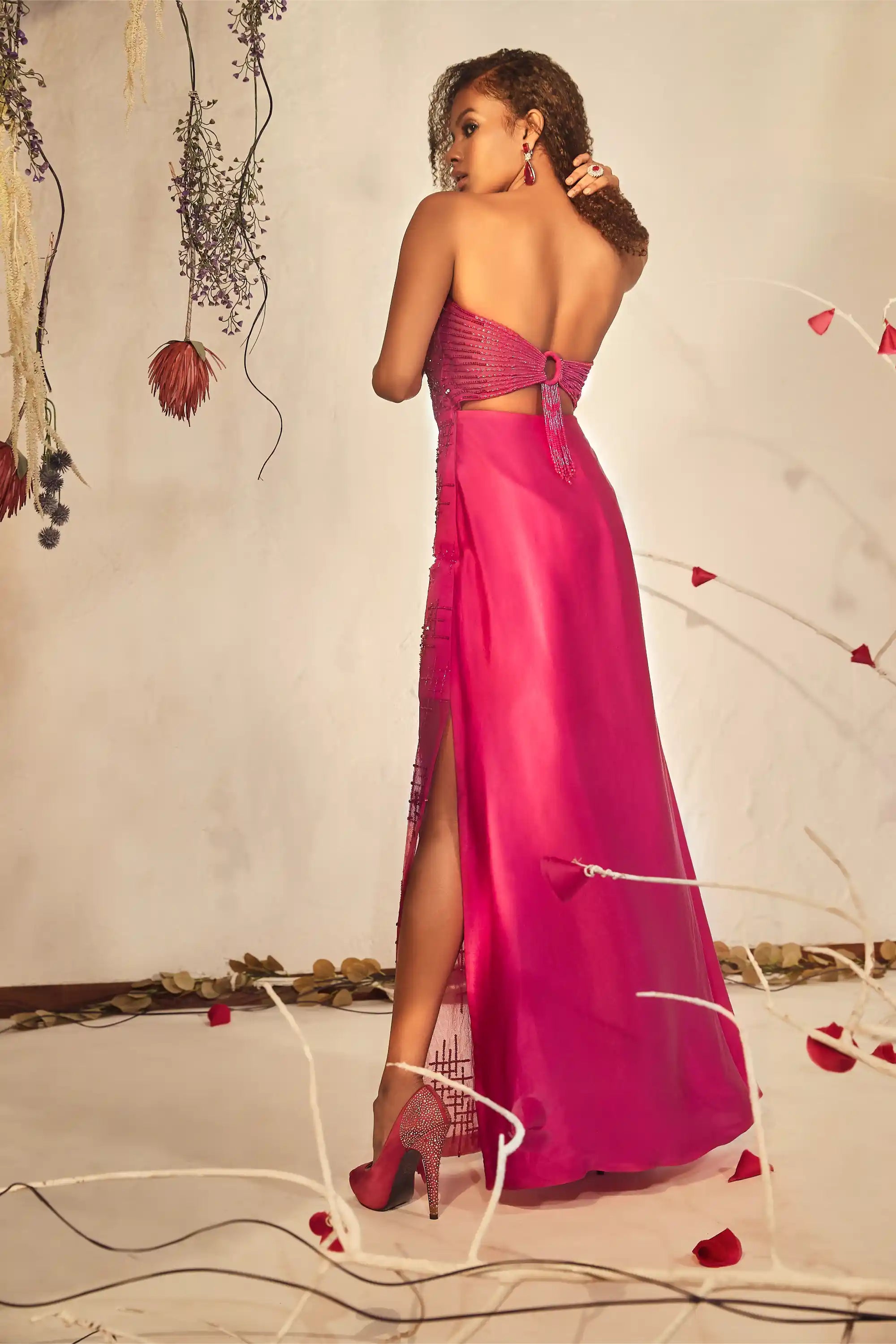 Turn heads in this stunning hibiscus-colored gown, featuring exquisite floral beaded embroidery that adds a touch of elegance and artistry. The luxurious silk satin drape flows beautifully, creating a dramatic statement that's perfect for a stylish fun party. With its vibrant hue and intricate details, this gown effortlessly combines sophistication with playful charm, ensuring you make a memorable impression on any occasion.