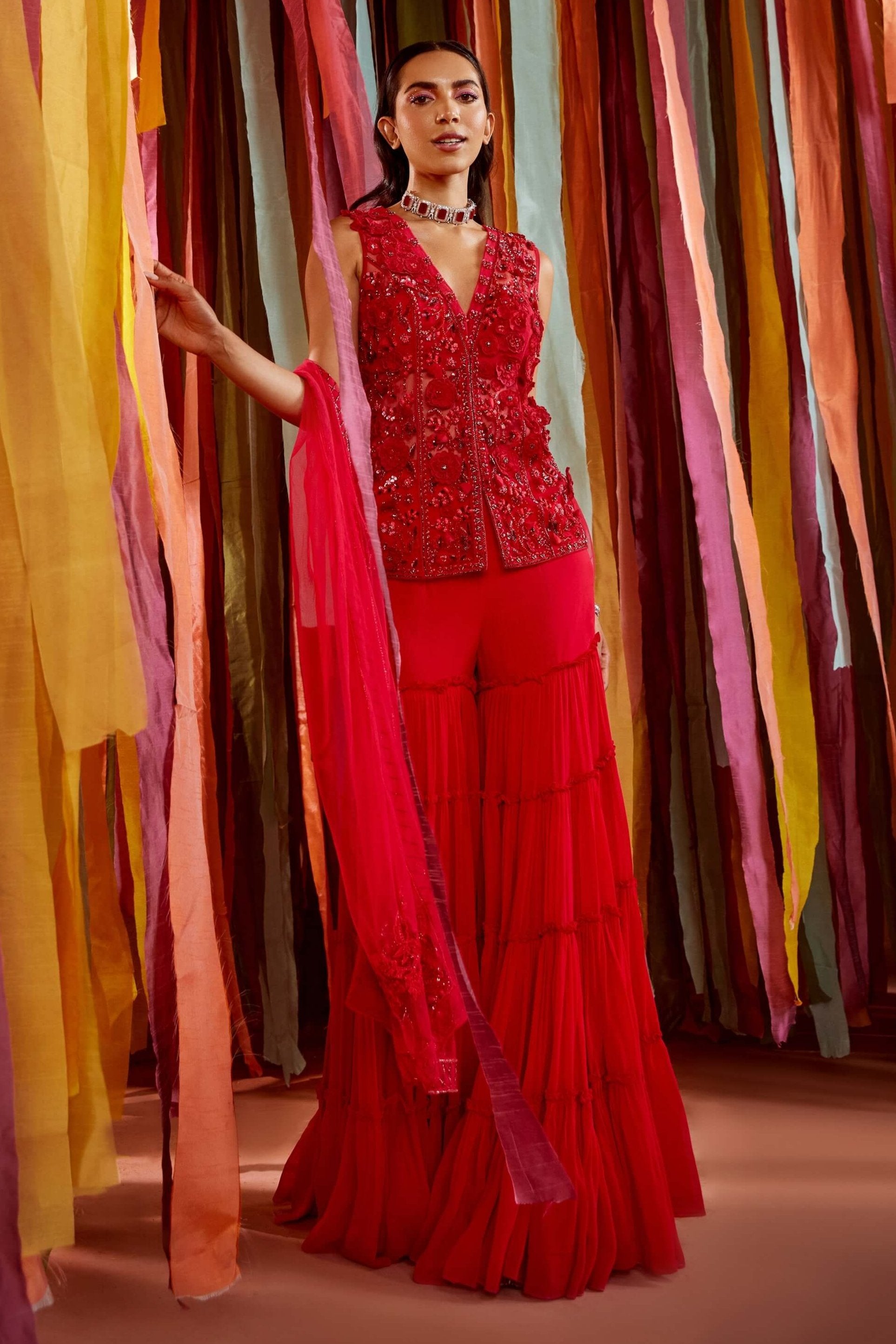 Discover the allure of our hot pink kurta, exquisitely hand-embroidered with tonal 3D organza flowers for a touch of artistic elegance. Designed with a flattering V-neckline and half lining, this kurta offers both style and comfort. It is paired with a tiered georgette sharara that adds graceful movement, complemented by a net dupatta for a sophisticated finish. Ideal for special occasions, this ensemble combines vibrant color with intricate detailing and modern design, ensuring a stunning and elegant appearance.