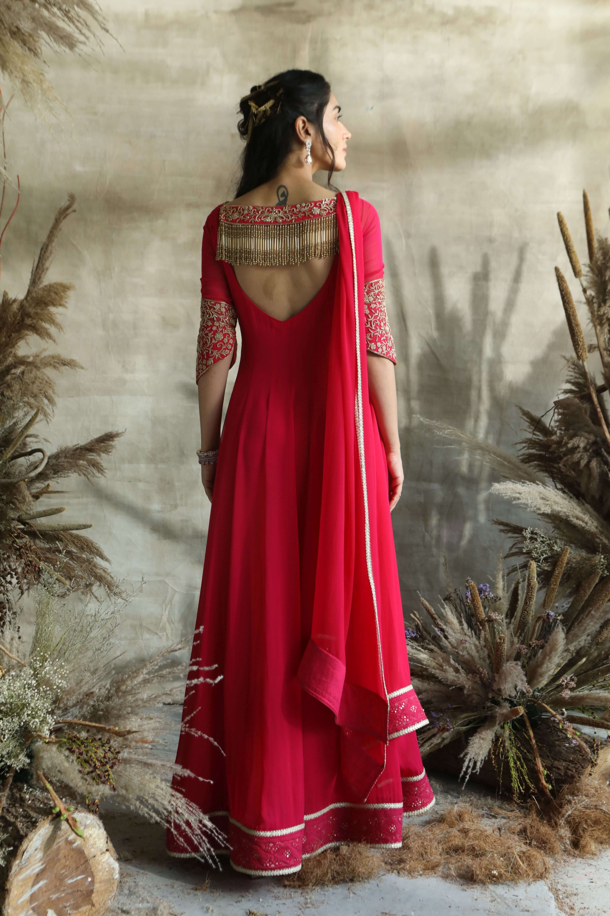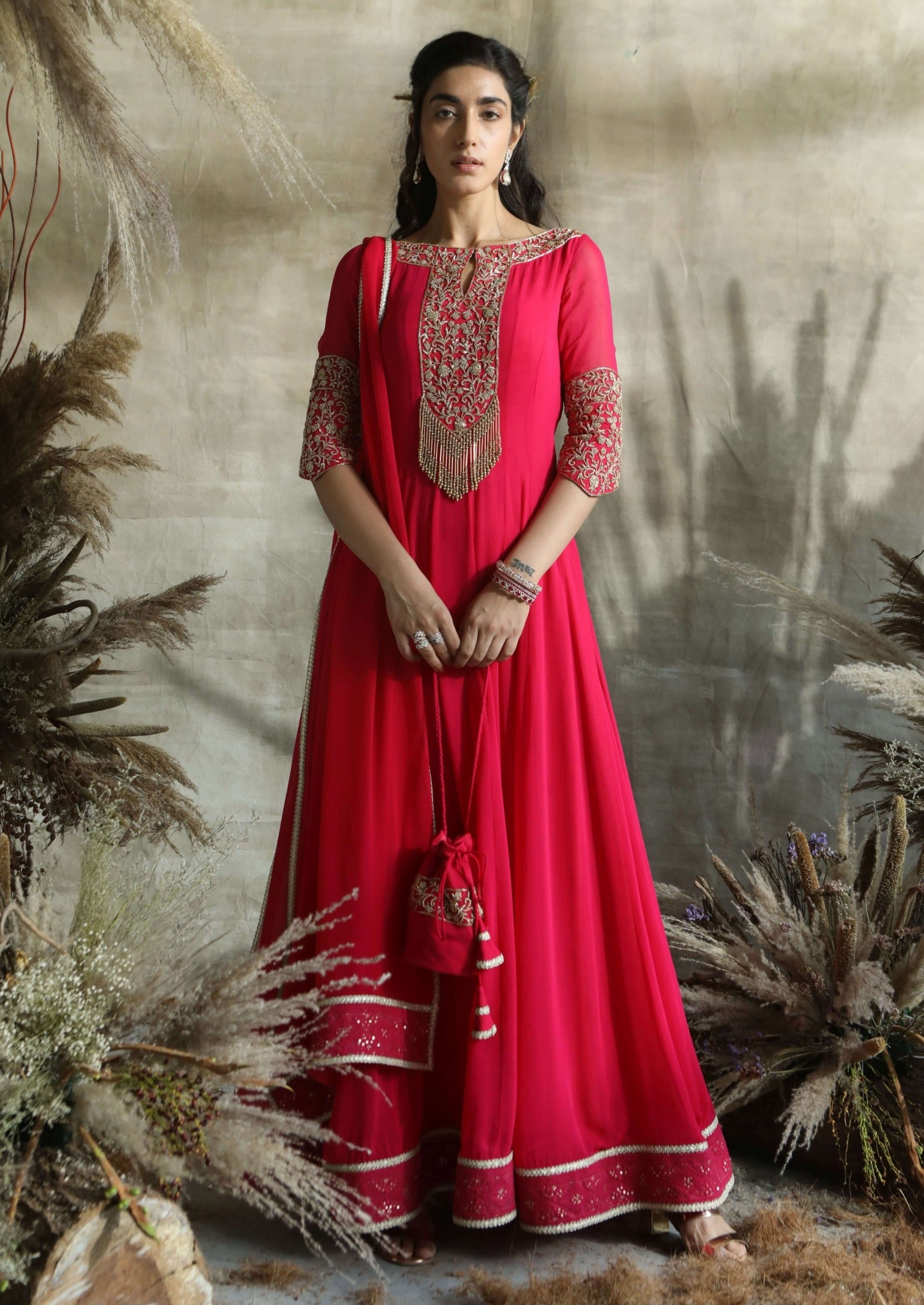 Illuminate your presence with our hot pink anarkali suit, crafted from luxurious georgette. This striking ensemble features a vibrant hot pink anarkali adorned with exquisite detailing that adds a touch of sophistication and charm. The outfit is completed with a matching dupatta that drapes gracefully and a coordinating potli bag that enhances the overall elegance. Ideal for weddings and special occasions, this suit ensures you make a bold and memorable impression with its rich color and refined design.