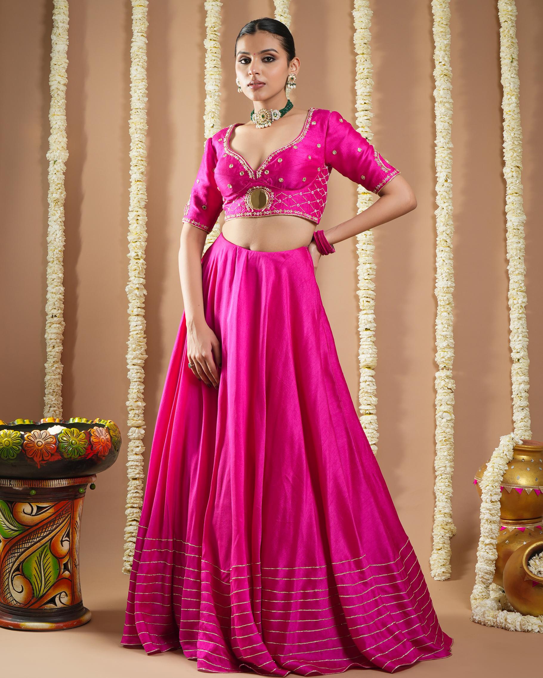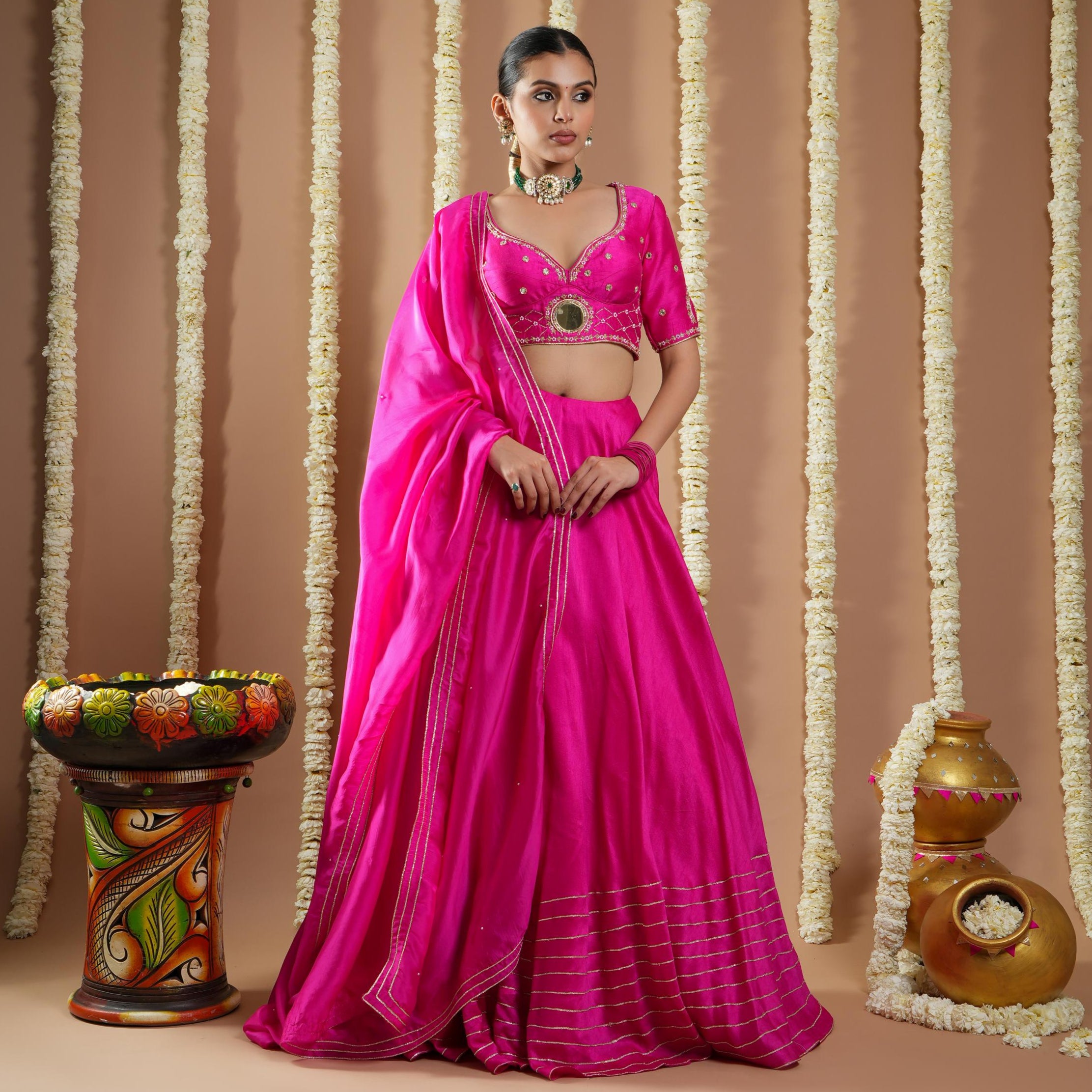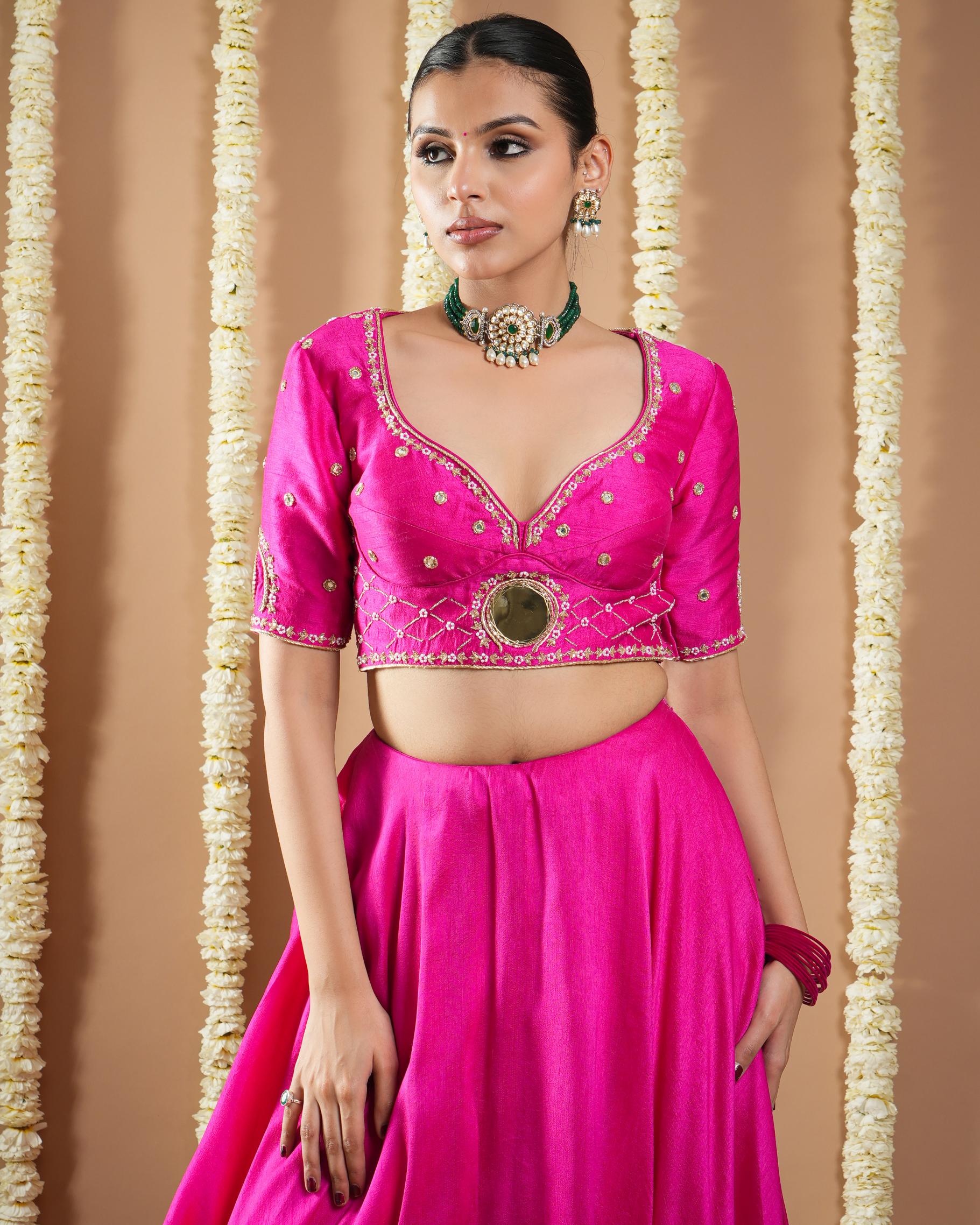 Make a bold entrance in the Hot Pink Avyanna Heavy Lehenga Set. With its striking hue and intricate craftsmanship, this ensemble is perfect for weddings, festive celebrations, and special occasions.